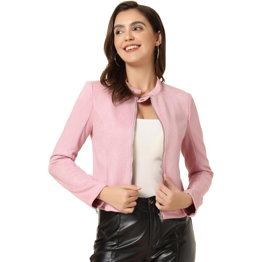 imageAllegra K Womens Faux Suede Jacket Stand Collar Zip Up Long Sleeve Motorcycle Biker CoatPink
