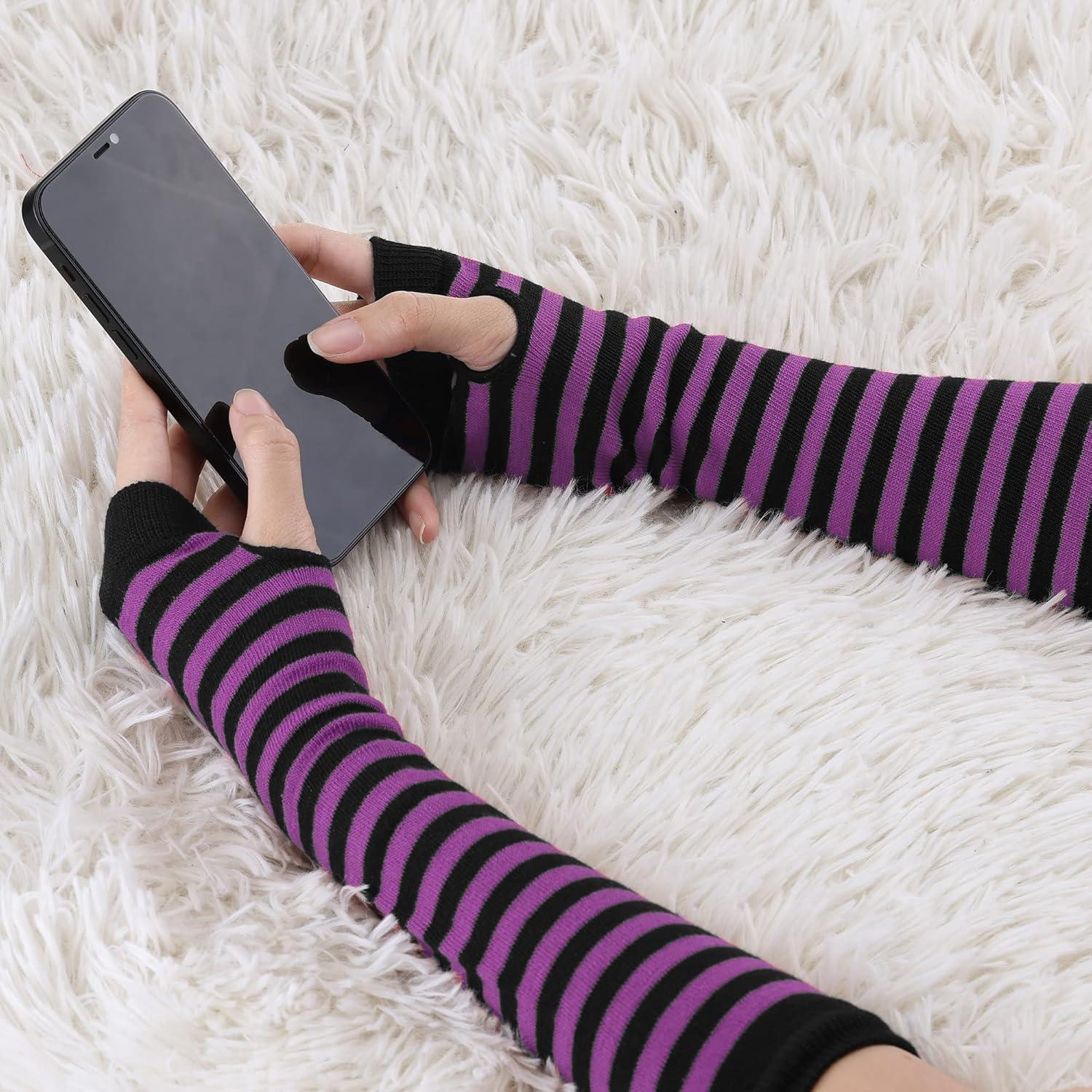 Allegra K Women’s Fingerless Gloves Printed Elbow Length Knitted Arm Warmers(Black Darkviolet)