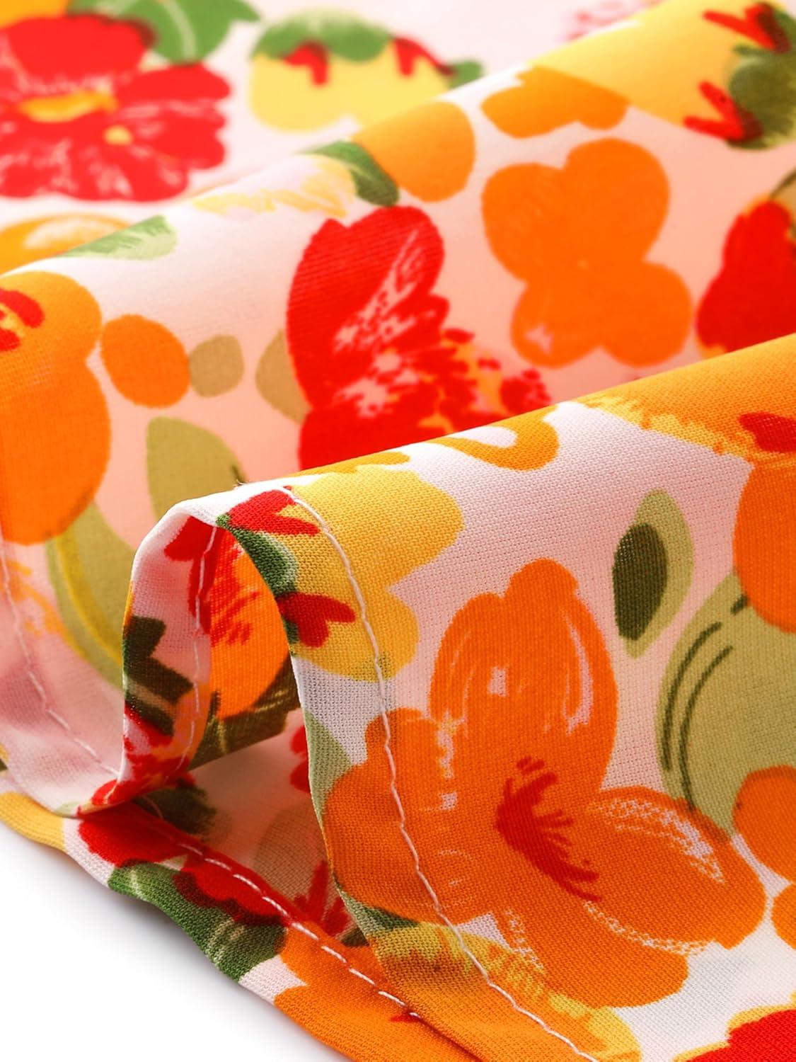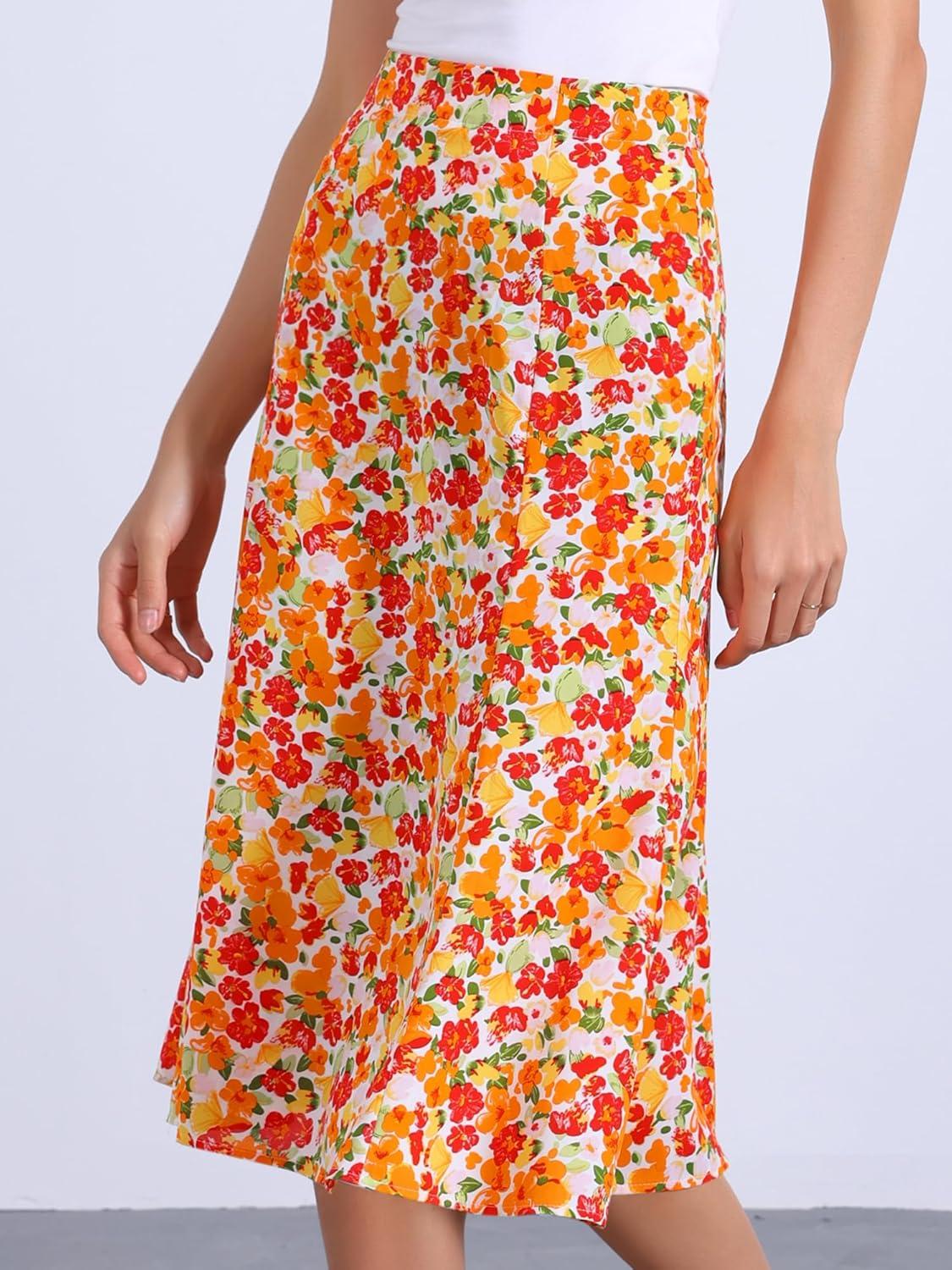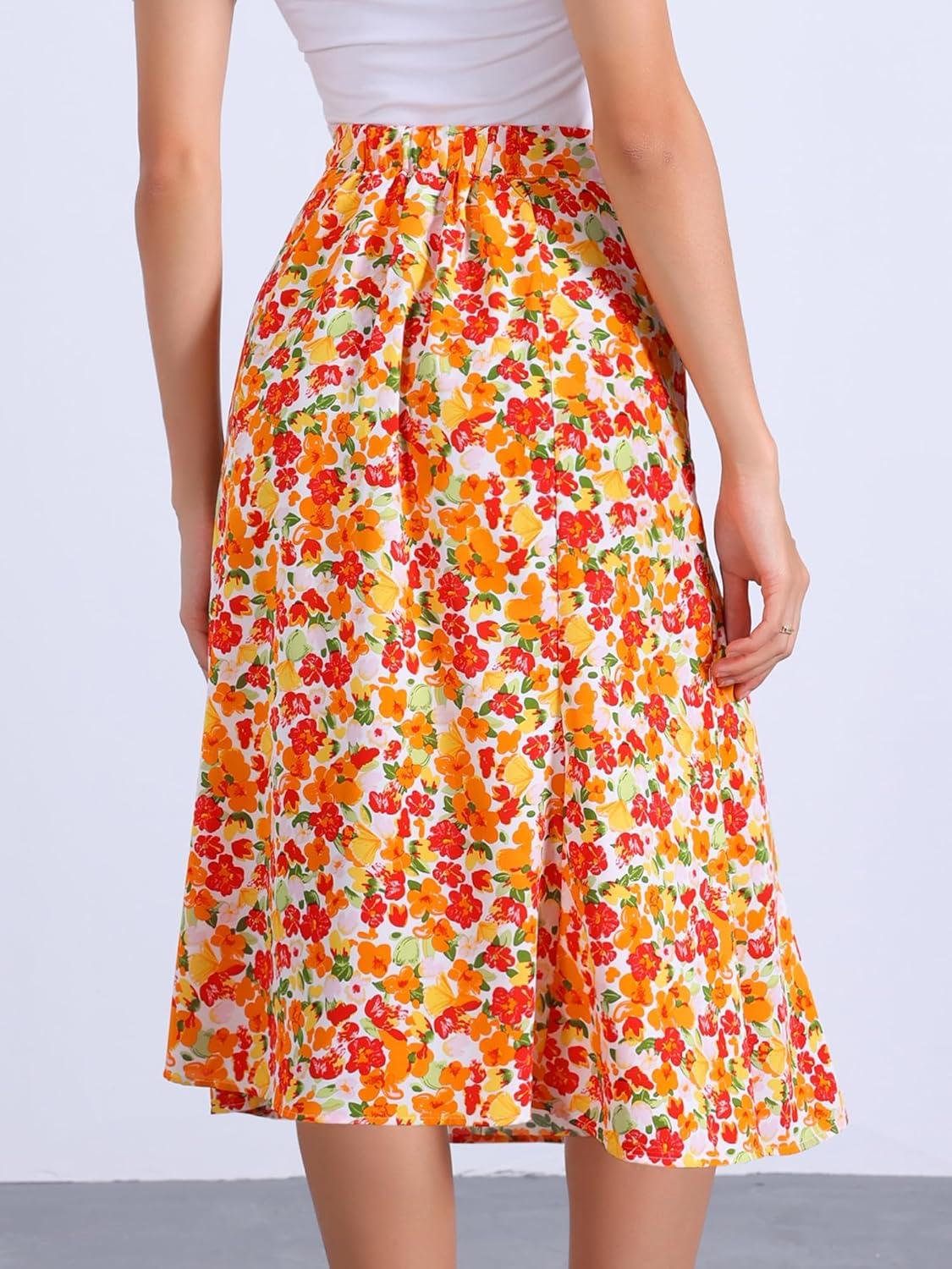 Allegra K Women’s Floral Midi Skirt Peasant Elastic Waist A-Line Ditsy Leave Print Skirts(Orange Green)