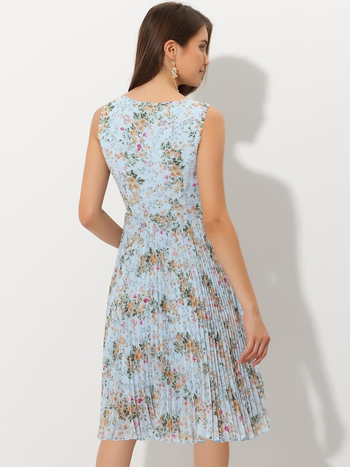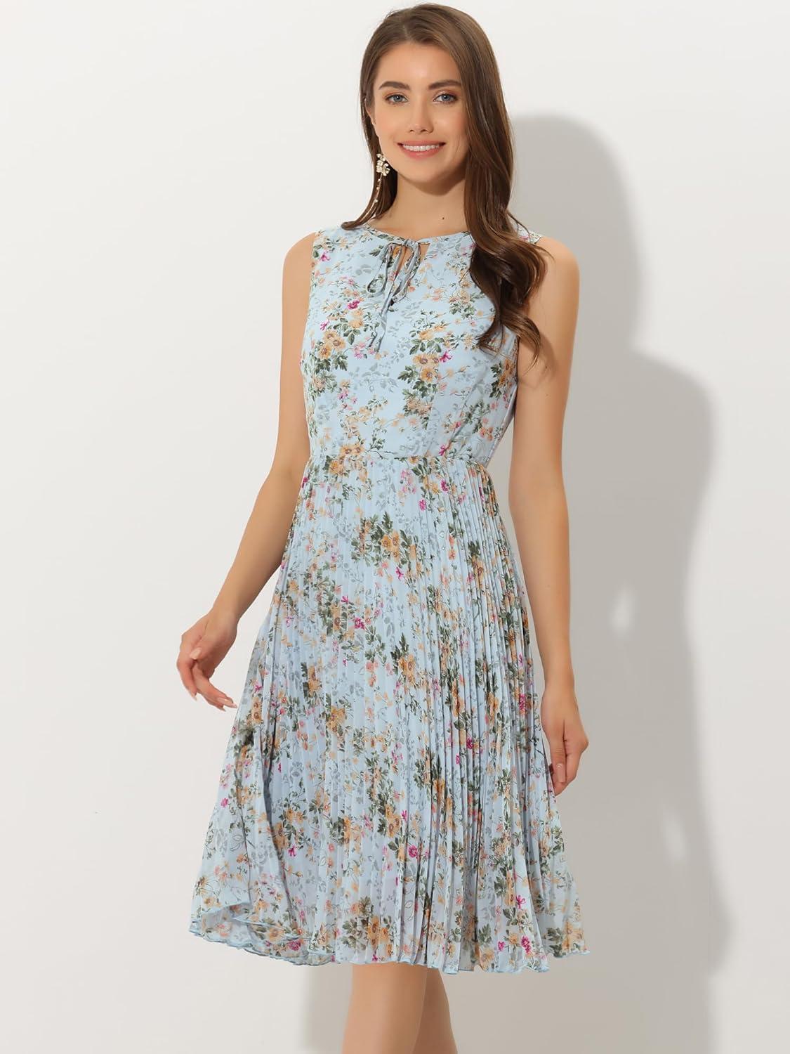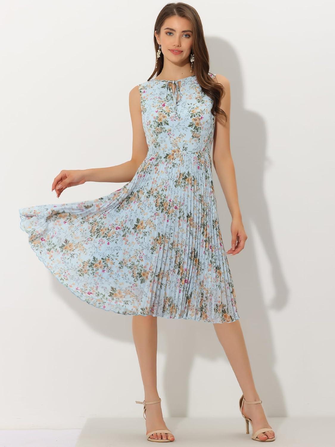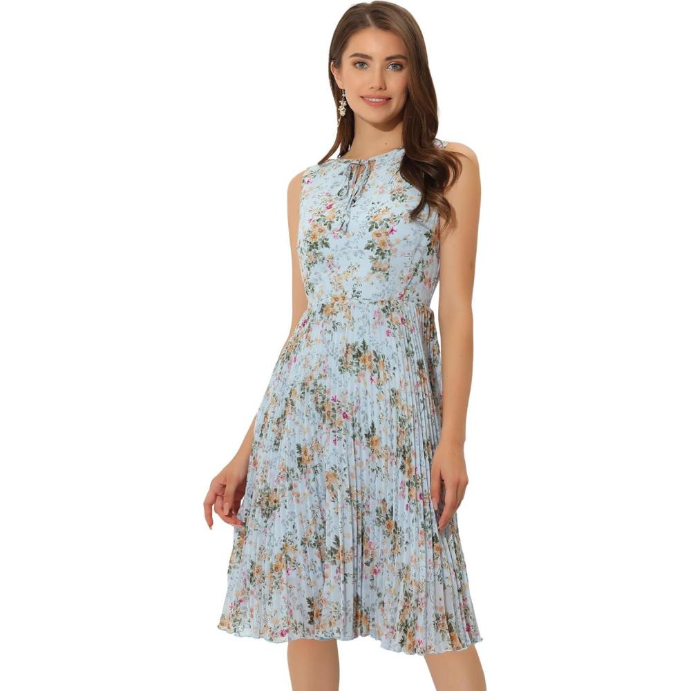 Allegra K Women’s Floral Print Summer A-Line Below Knee Length Sleeveless Pleated Dress(Blue)