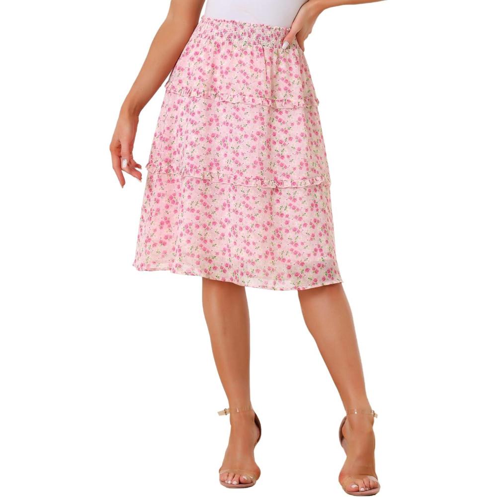 imageAllegra K Womens Floral Skirts Summer Chiffon Smocked Elastic Waist ALine Below Knee Length Ruffle Tiered SkirtPinks