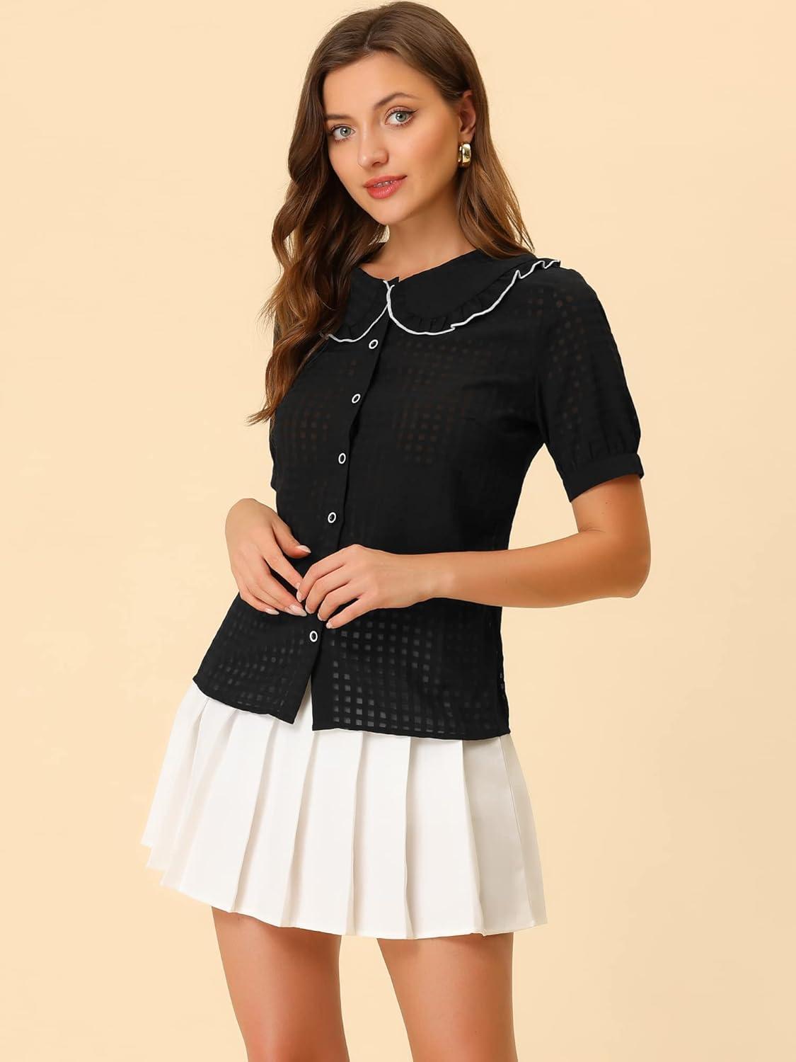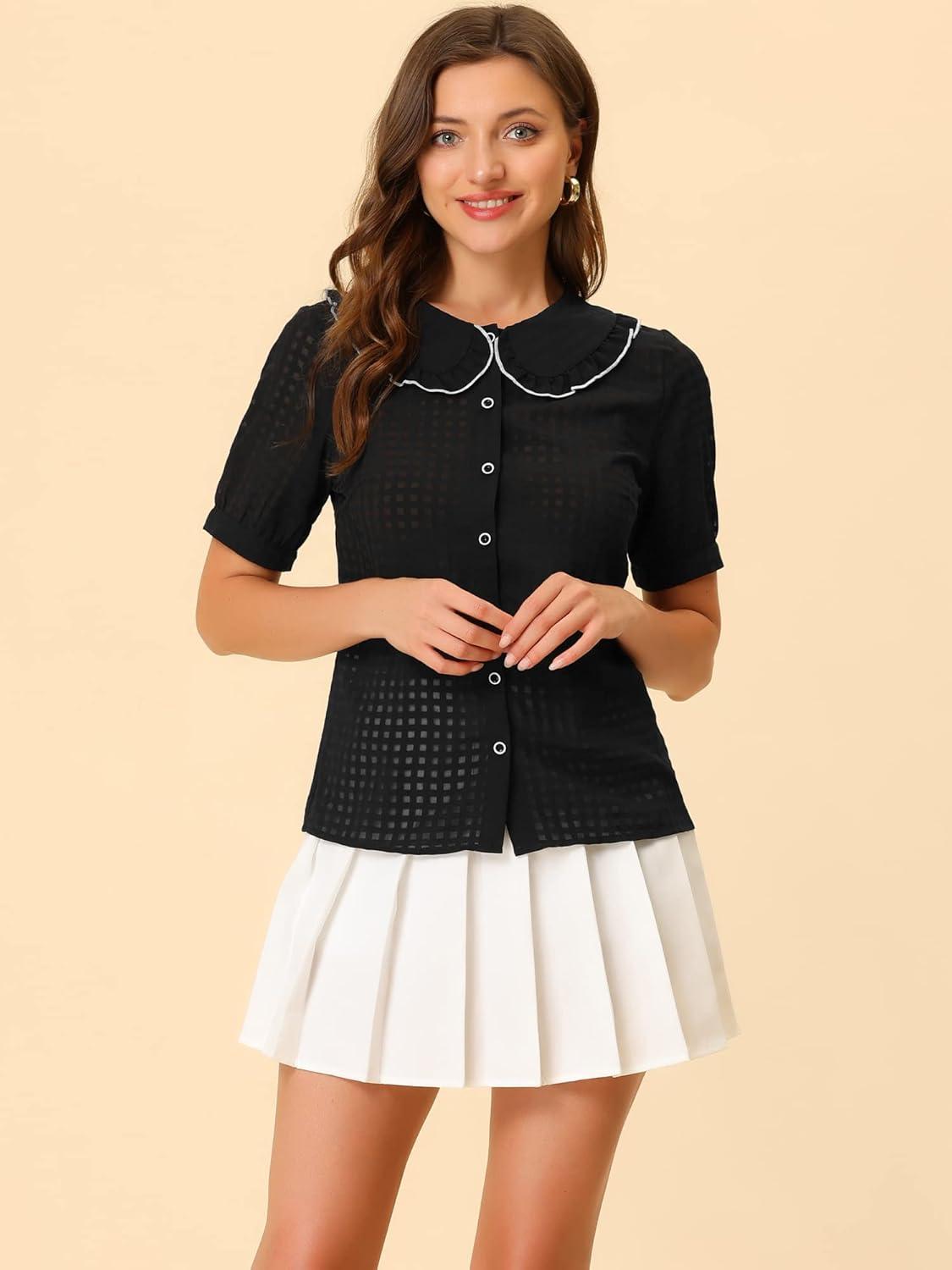 Allegra K Women’s Gingham Button Up Shirt Blouse Short Sleeve Peter Pan Collar Tops(Black)