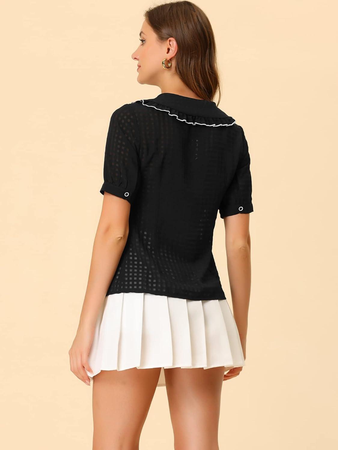 Allegra K Women's Gingham Button Up Shirt Blouse Short Sleeve Peter Pan Collar Tops(Black)