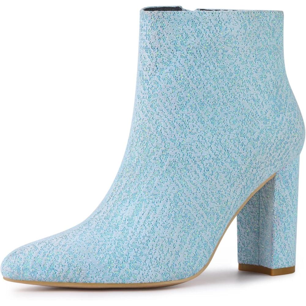 Allegra K Women’s Glitter Pointed Toe Chunky Heel Ankle Boots(Blue)