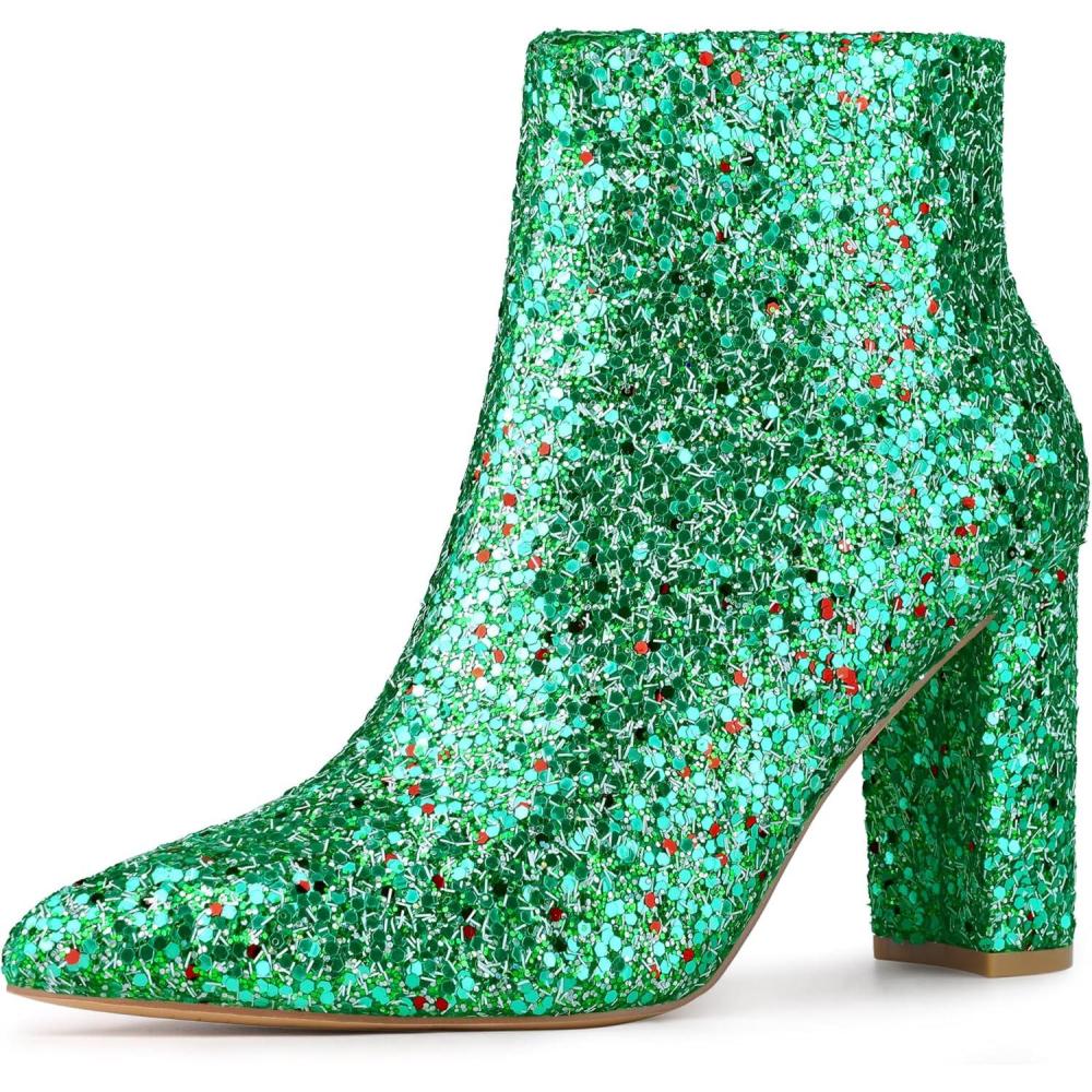 Allegra K Women’s Glitter Pointed Toe Chunky Heel Ankle Boots(Green)