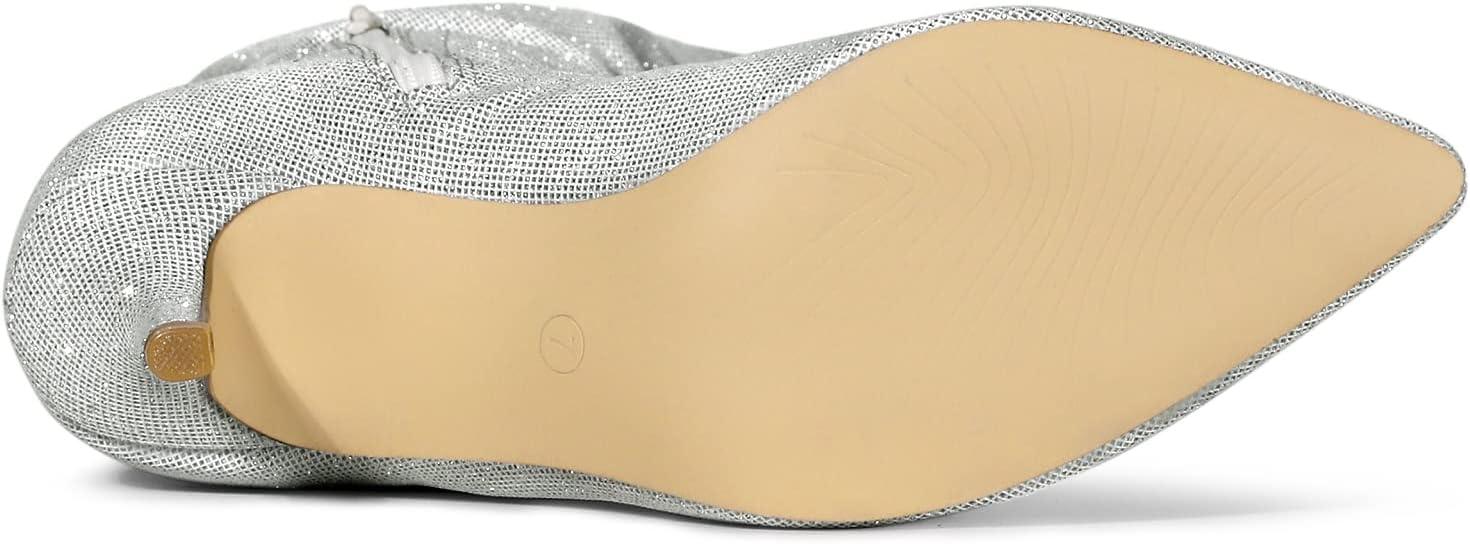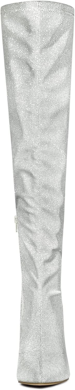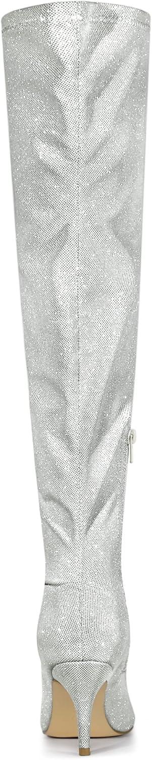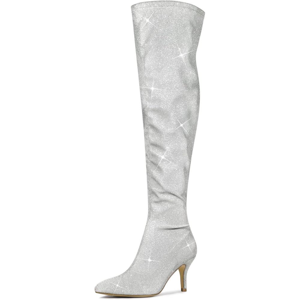 Allegra K Women’s Glitter Pointed Toe Stiletto Heels Over the Knee High Boots(White Silver)