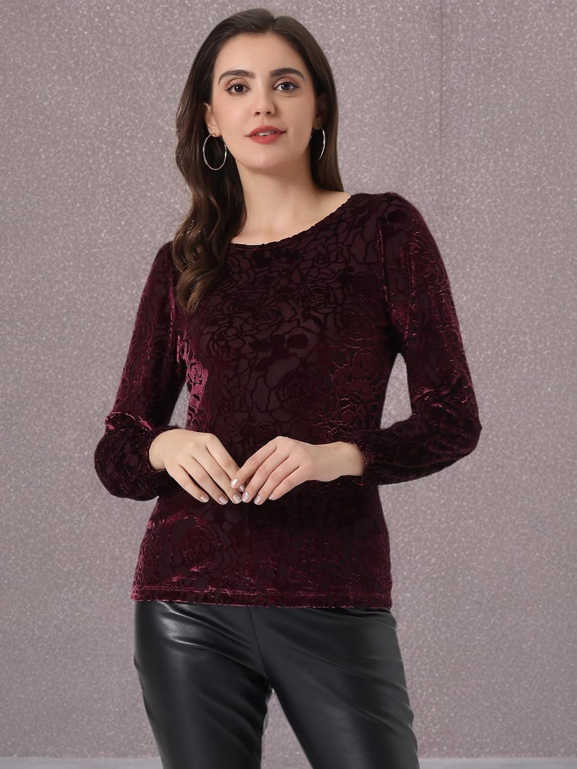 imageAllegra K Womens Halloween Velvet Top Semi Sheer BurnOut Long Sleeve Printed TopBurgundy