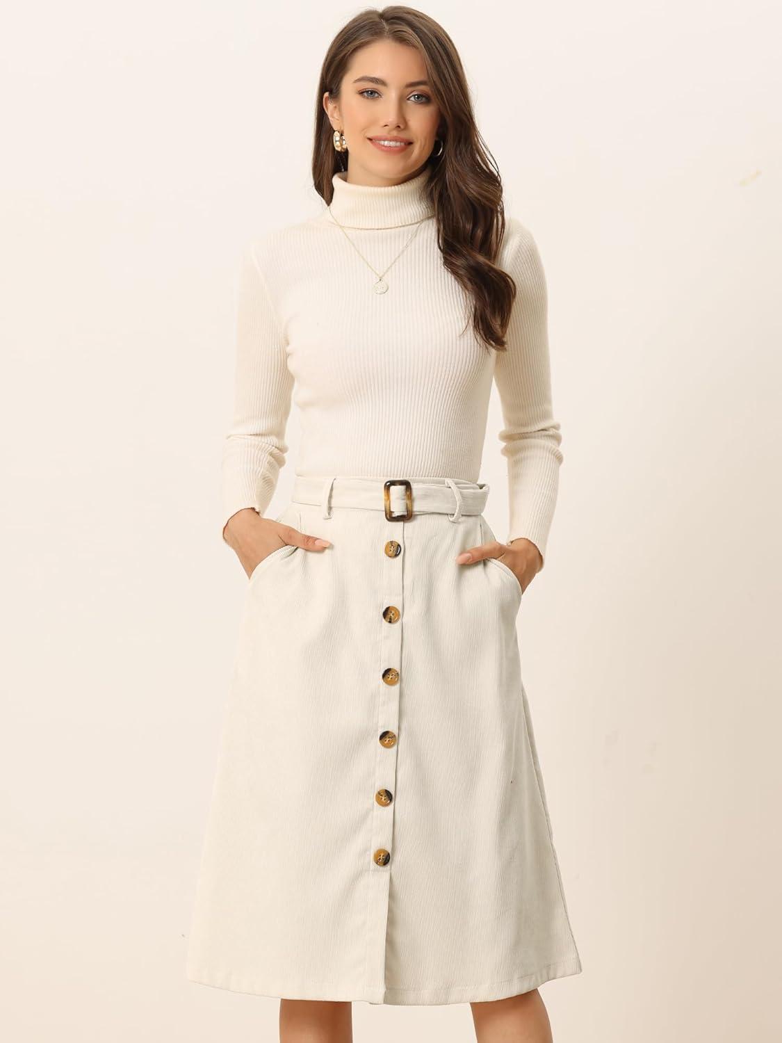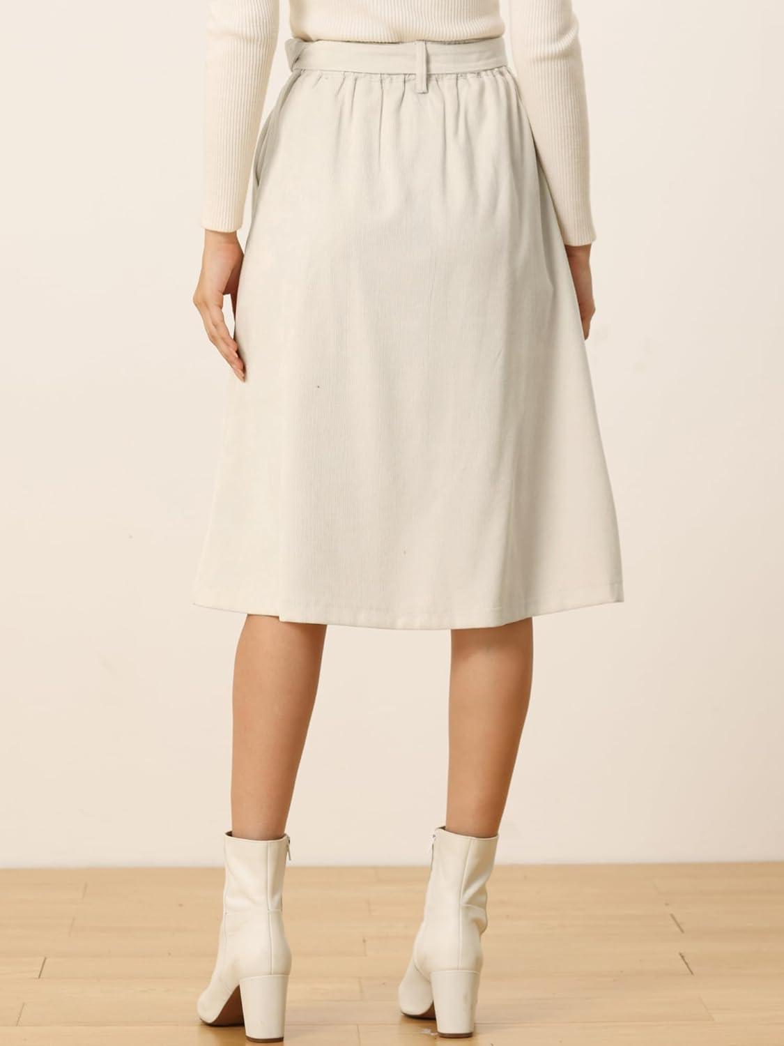 Allegra K Womens High Waist Button Front A-Line Belted Corduroy Midi Skirt(Cream)
