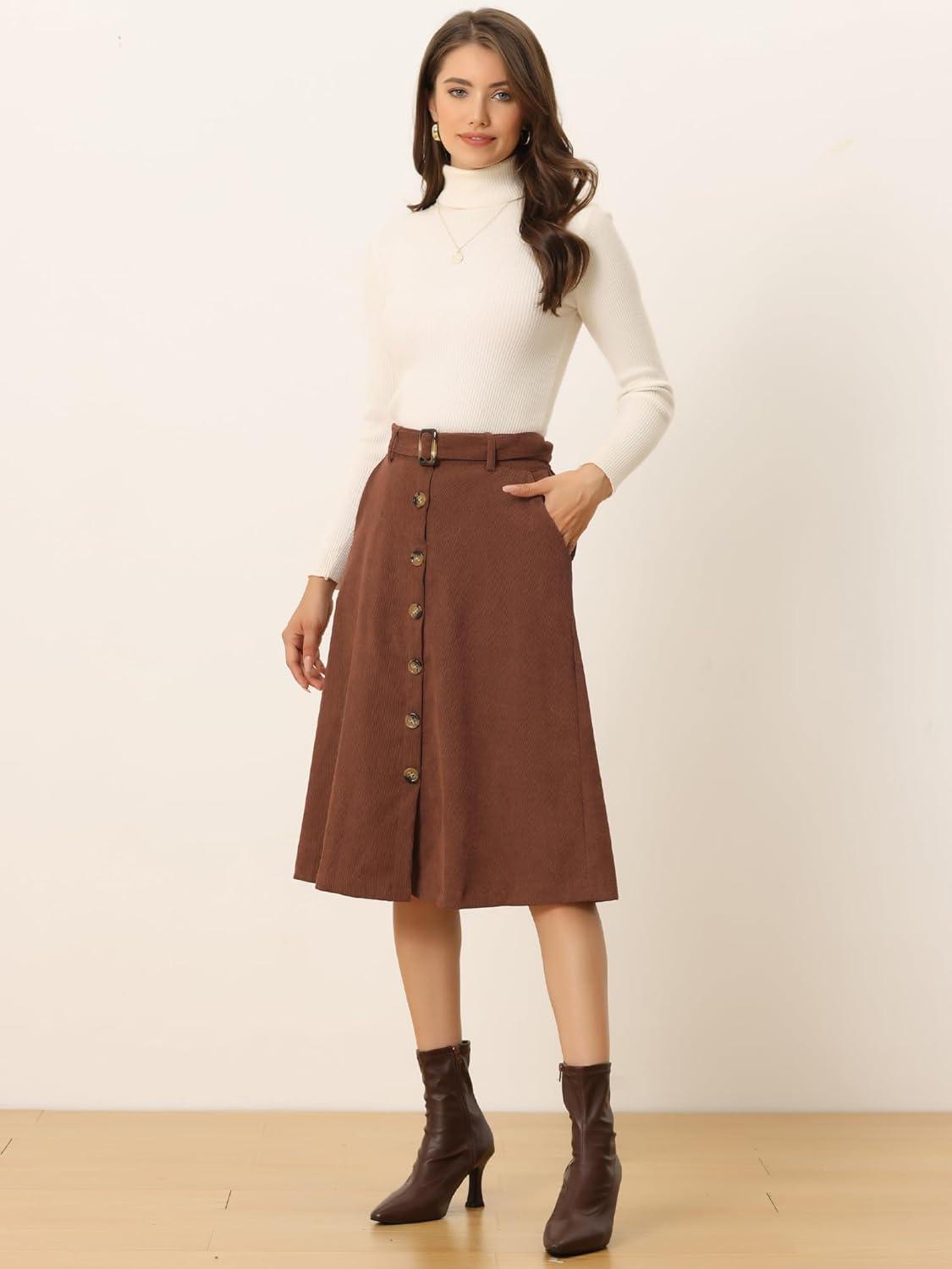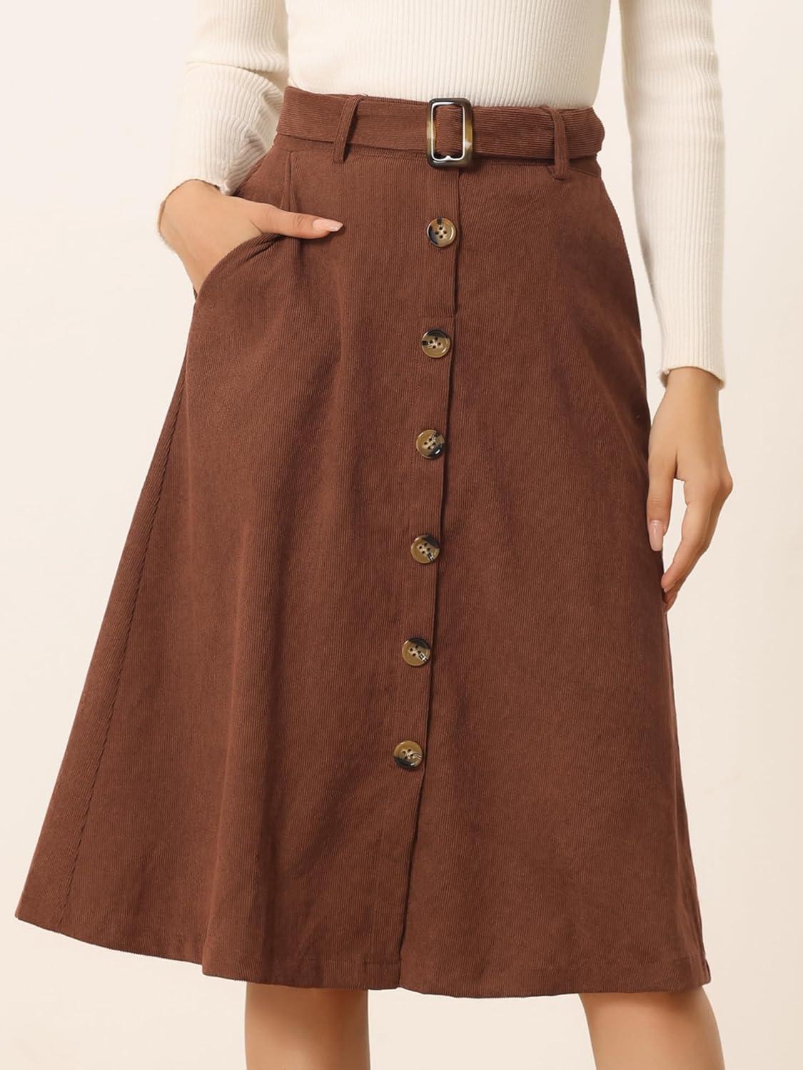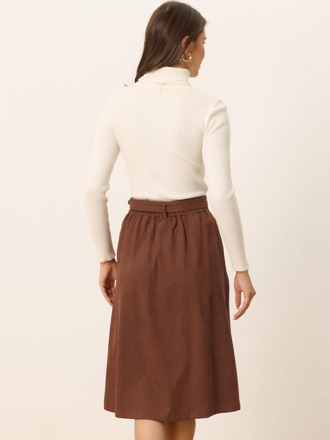 Allegra K Womens High Waist Button Front A-Line Belted Corduroy Midi Skirt(Dark Brown)