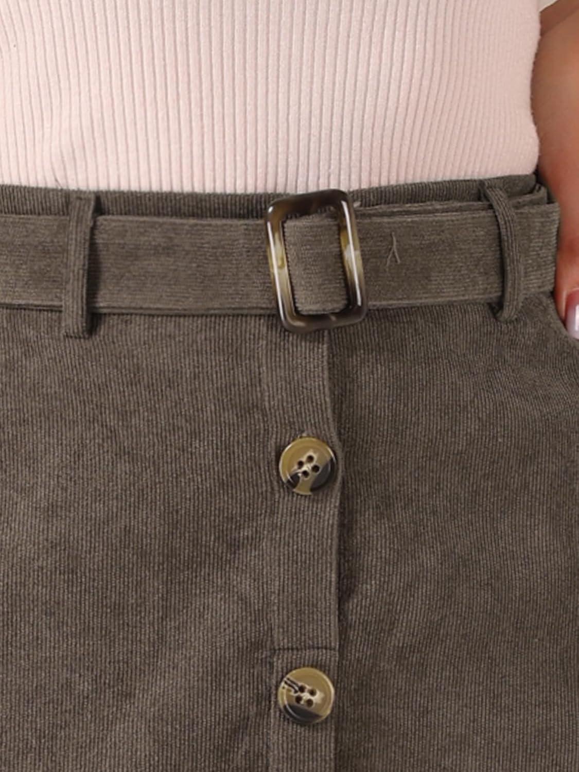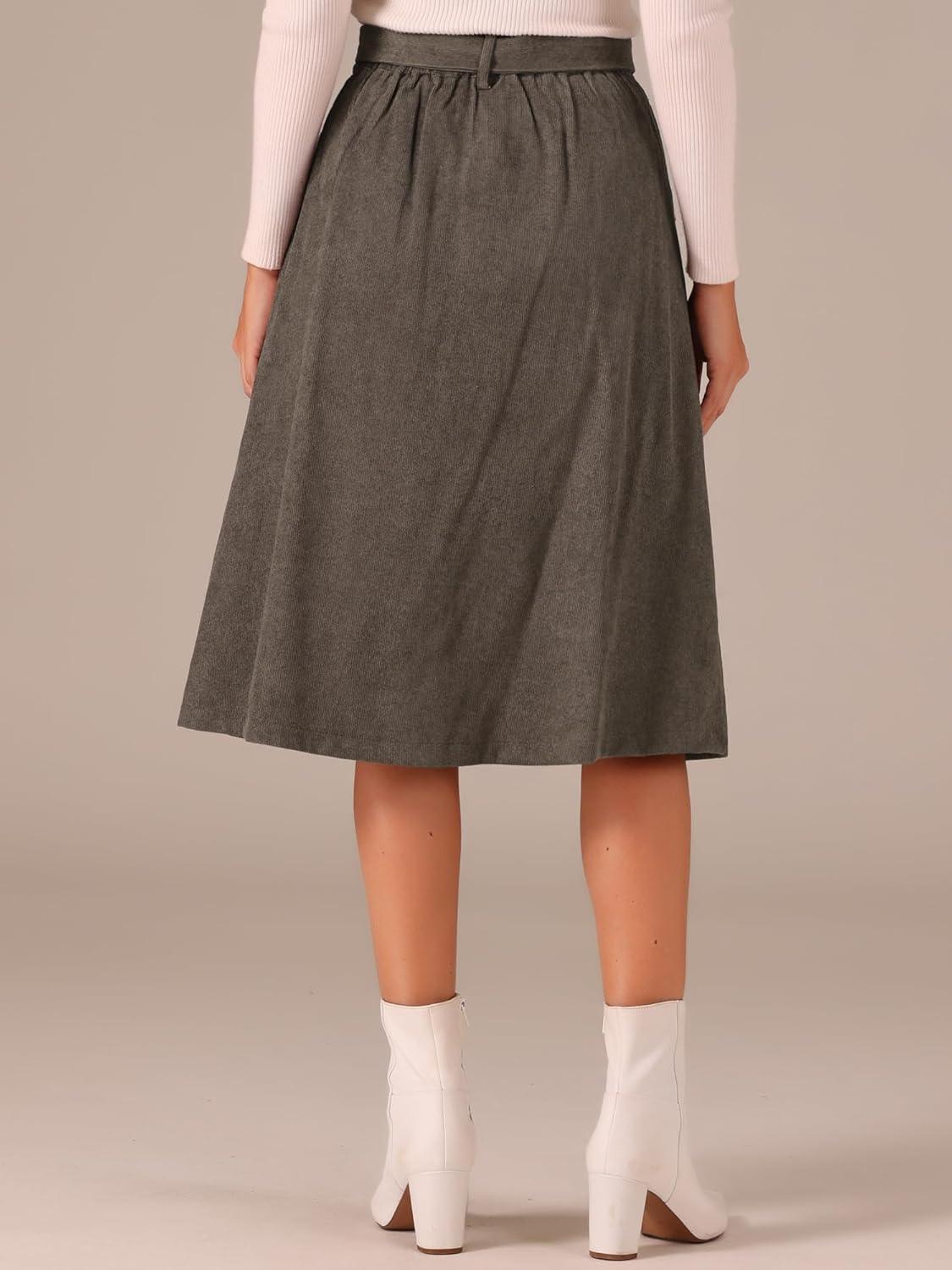 Allegra K Womens High Waist Button Front A-Line Belted Corduroy Midi Skirt(Gray Brown)