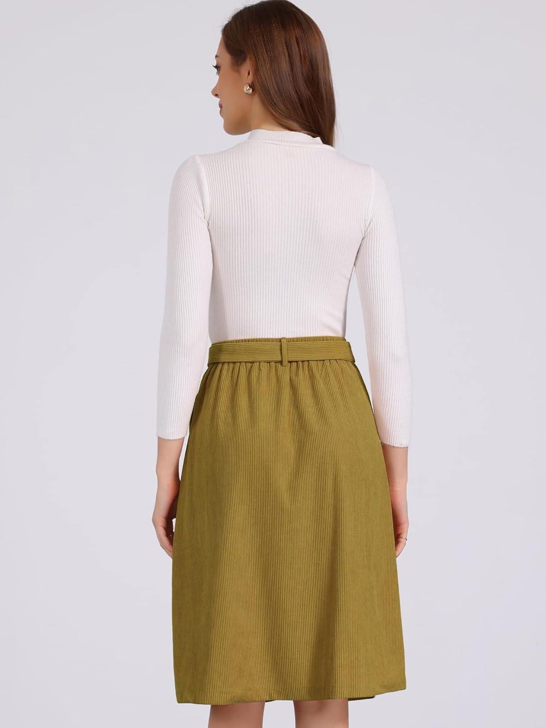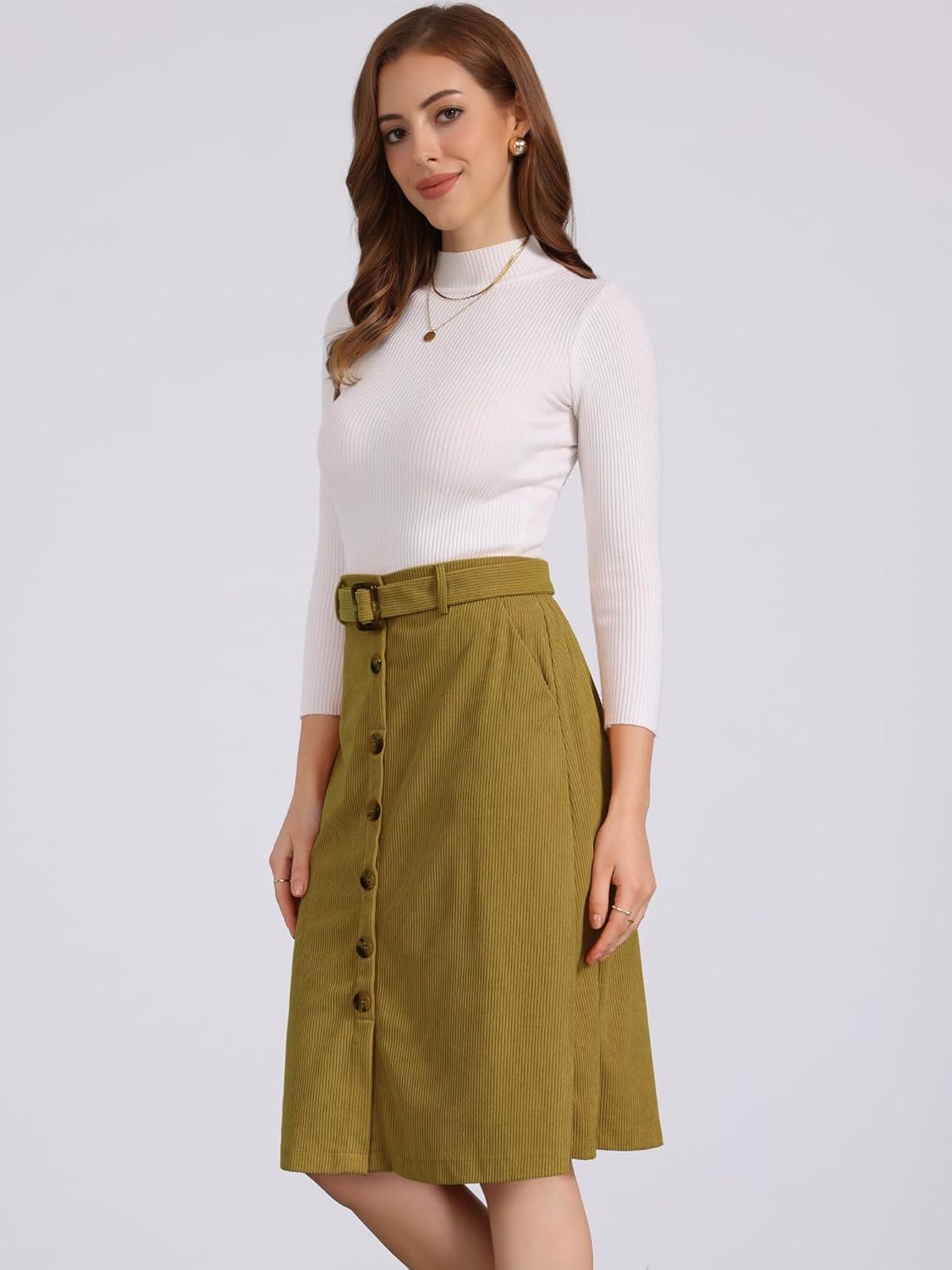 Allegra K Womens High Waist Button Front A-Line Belted Corduroy Midi Skirt(Olive Yellow)