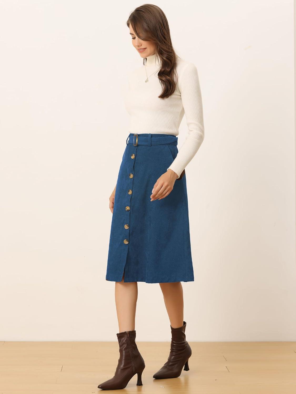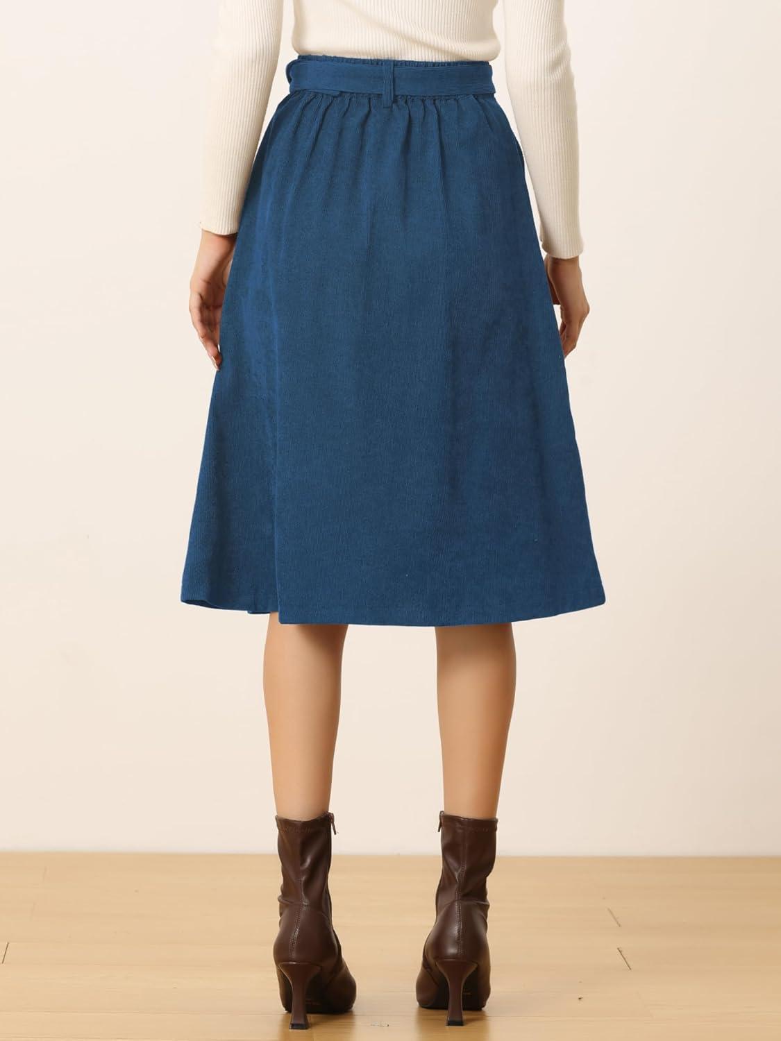 Allegra K Womens High Waist Button Front A-Line Belted Corduroy Midi Skirt(Peacock Blue)