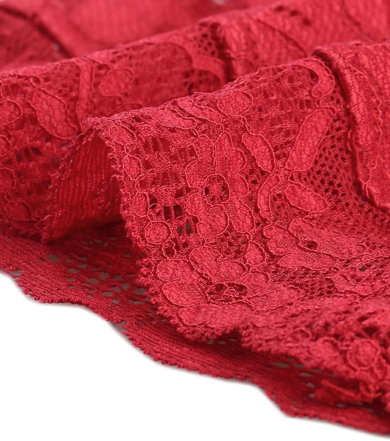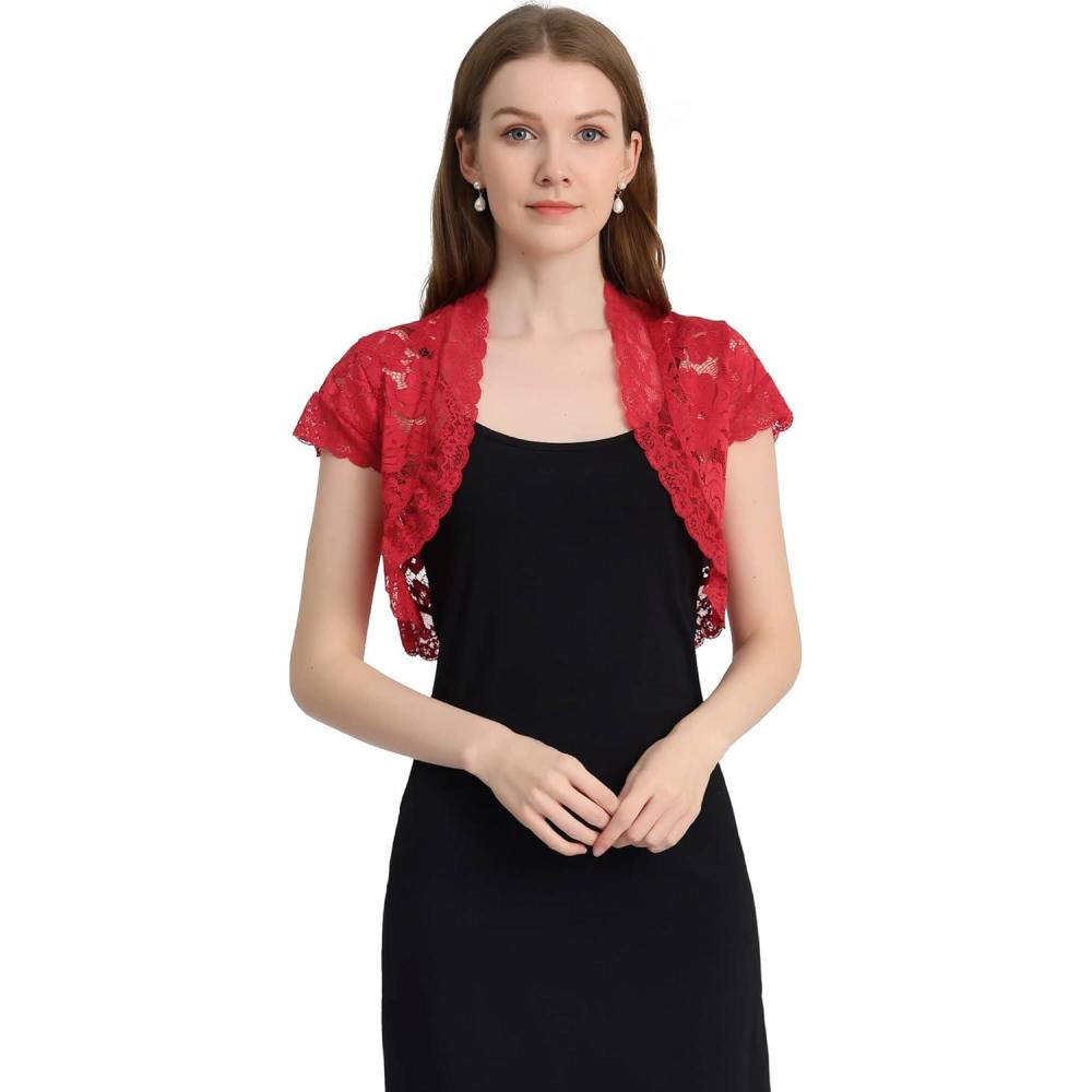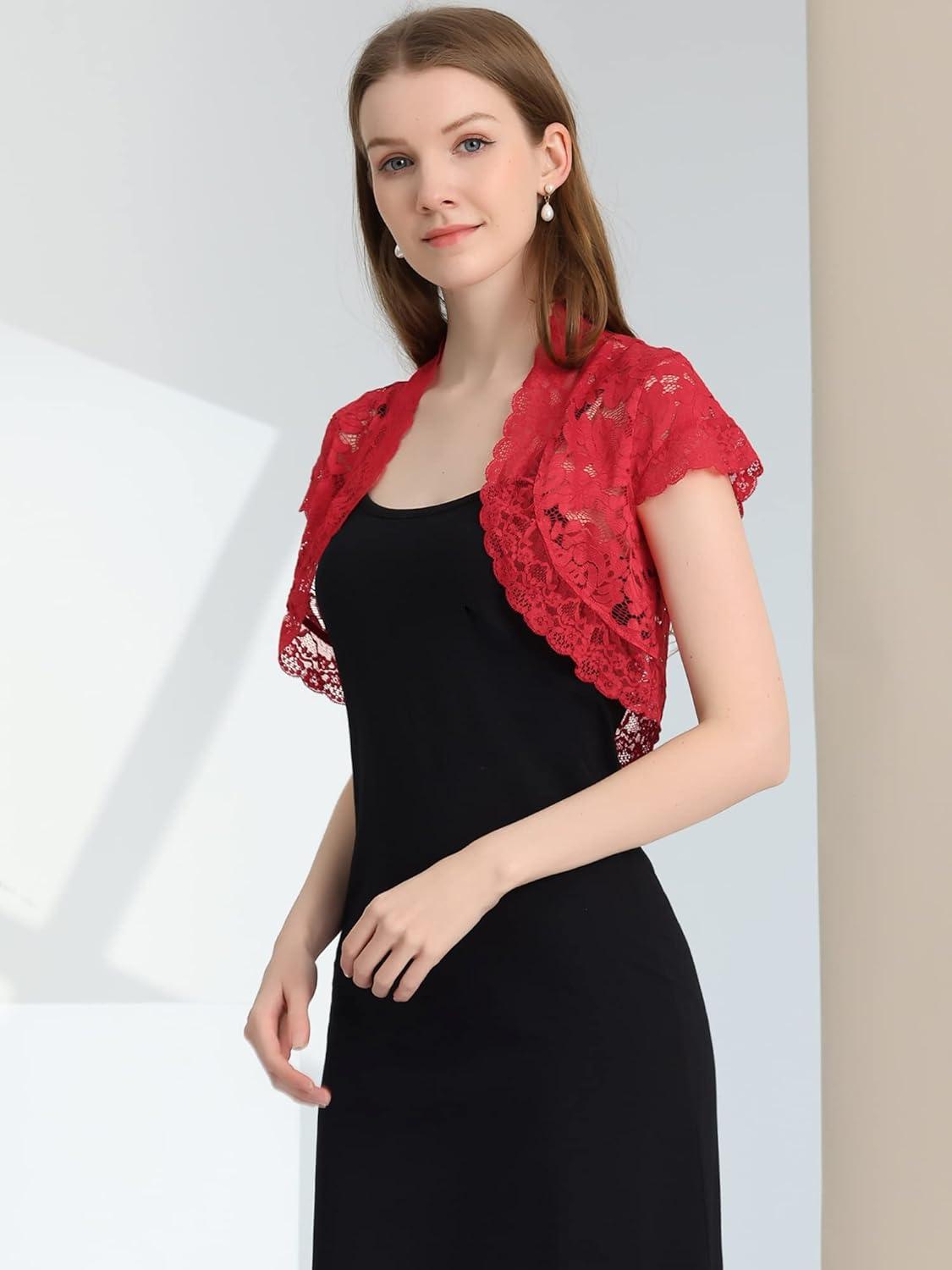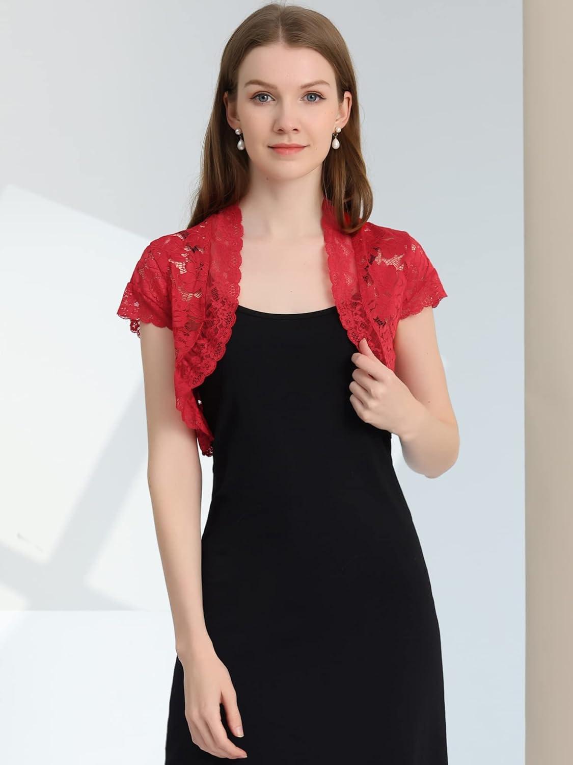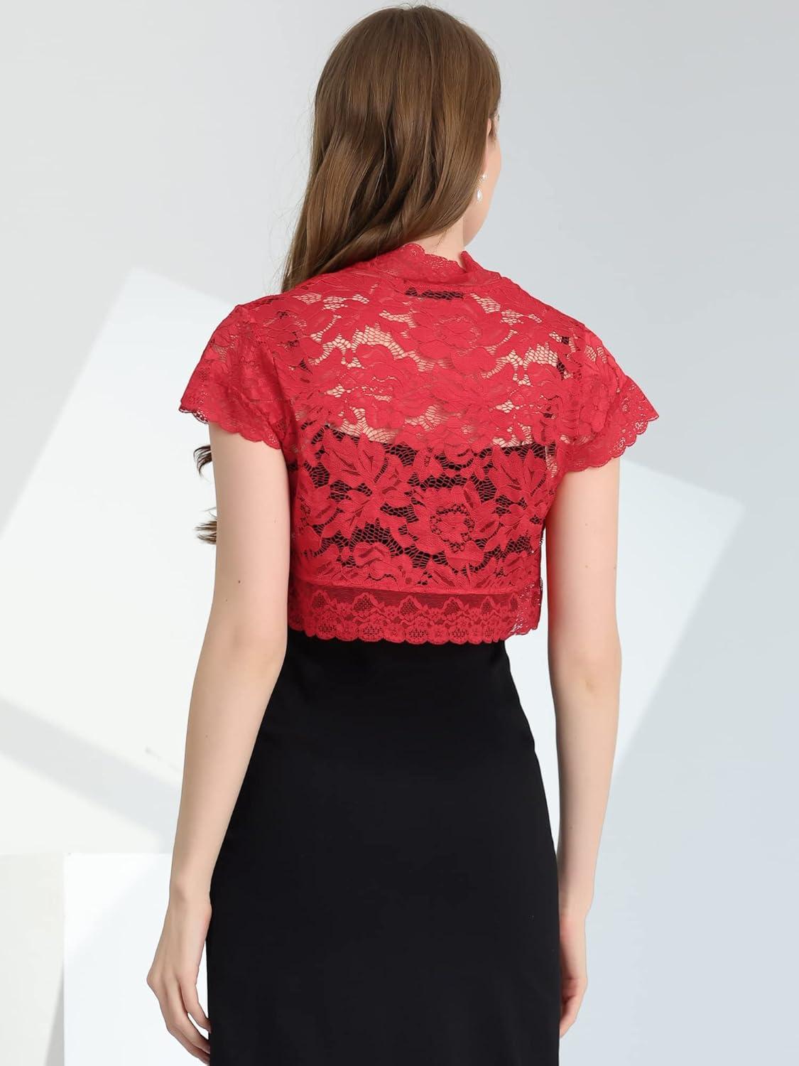 Allegra K Women’s Lace Cardigan Open Front Elegant Short Sleeve Sheer Floral Cropped Bolero Lace Shrug Top(Red)