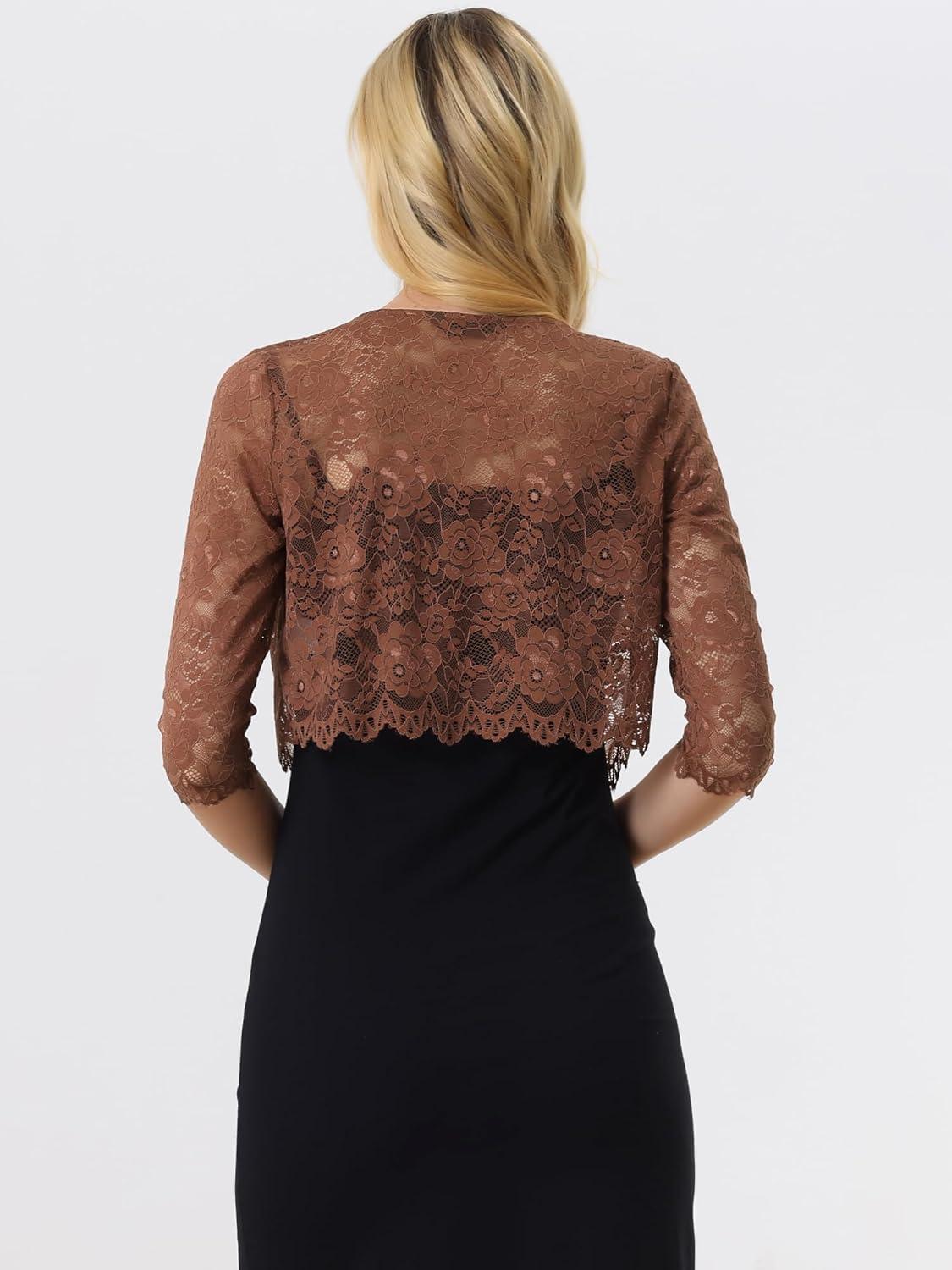 imageAllegra K Womens Lace Cardigan Open Front Lace Shrug Elegant Sheer Floral Cropped Bolero Lace TopsBrown