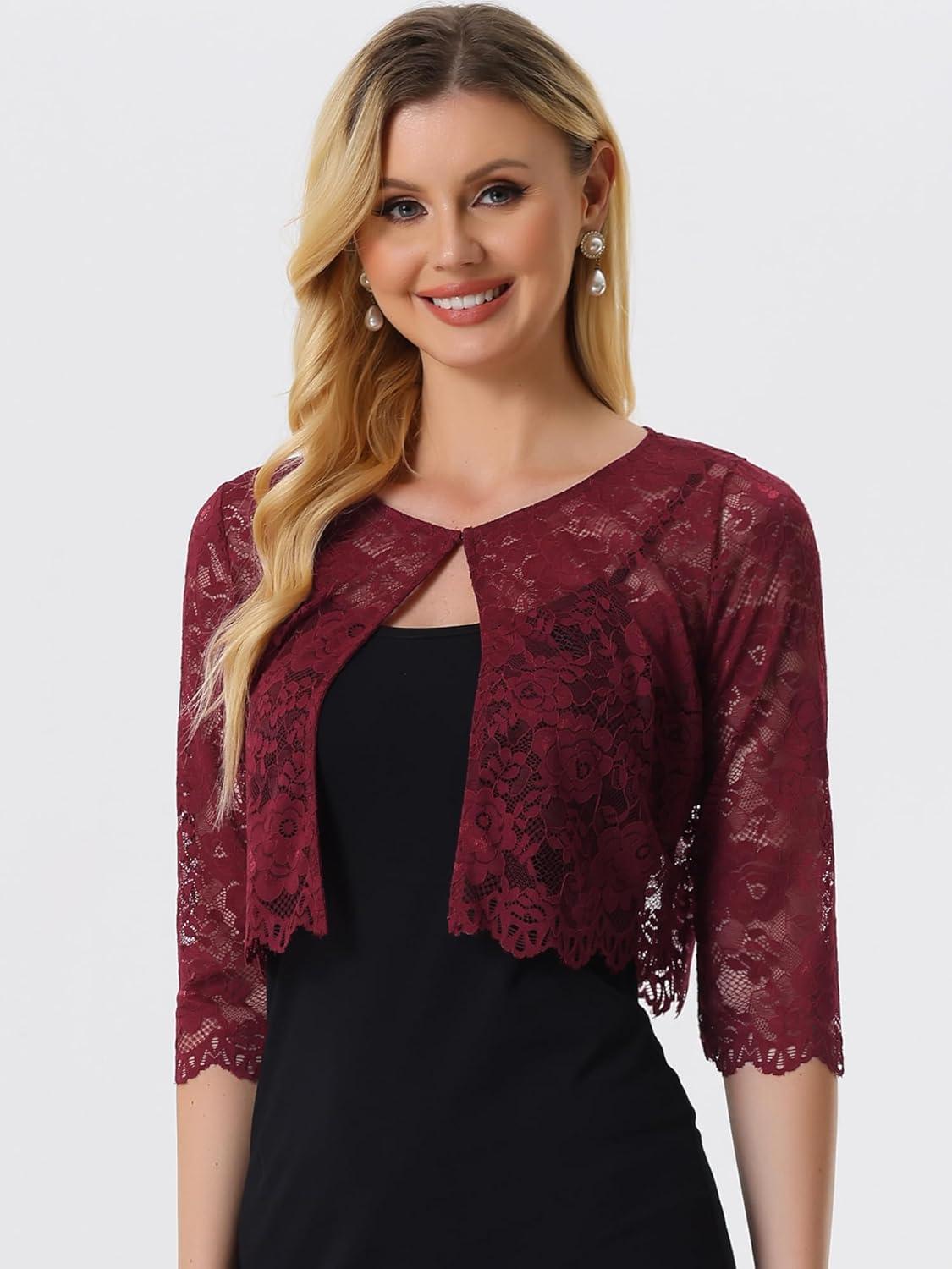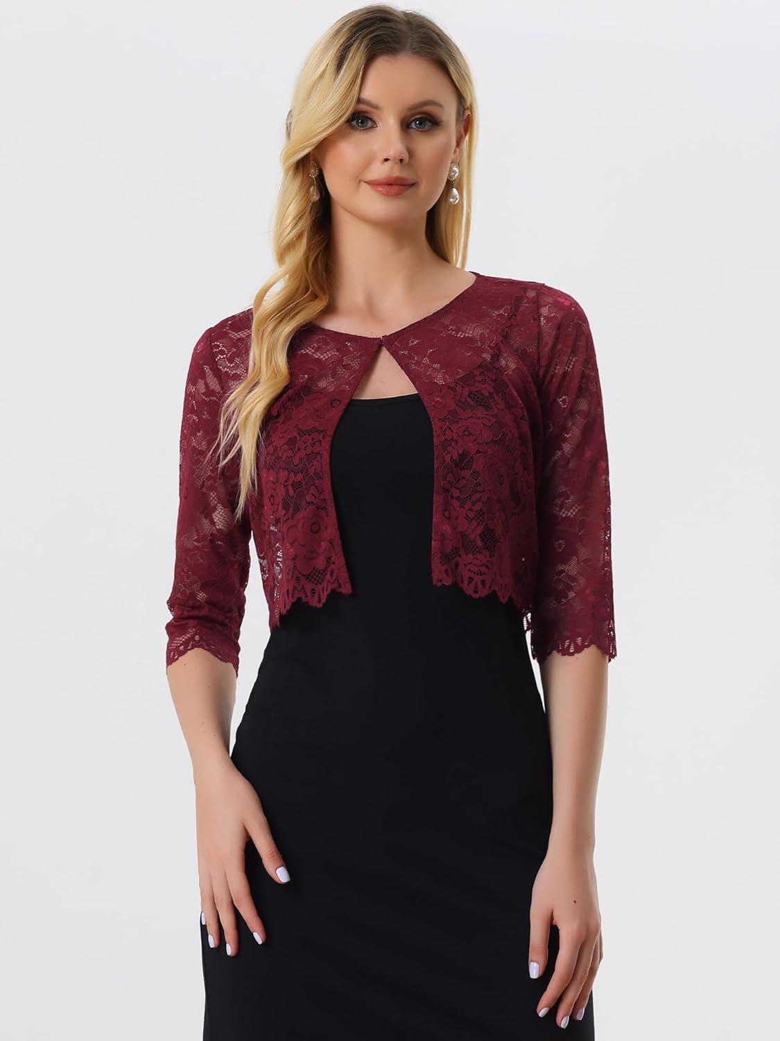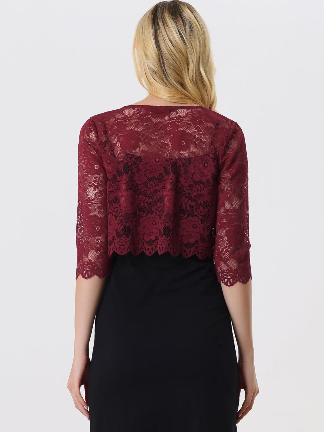 Allegra K Women’s Lace Cardigan Open Front Lace Shrug Elegant Sheer Floral Cropped Bolero Lace Tops(Claret Red)