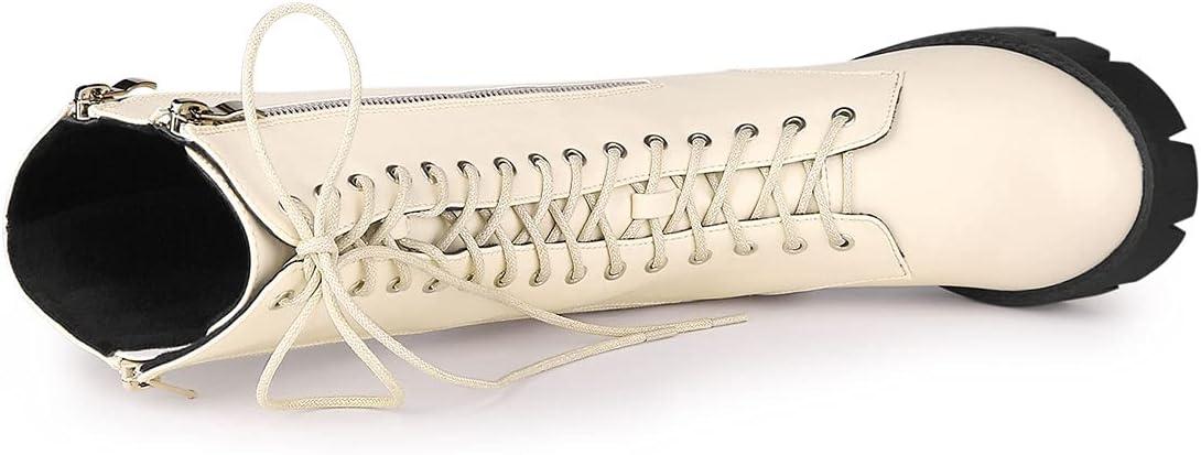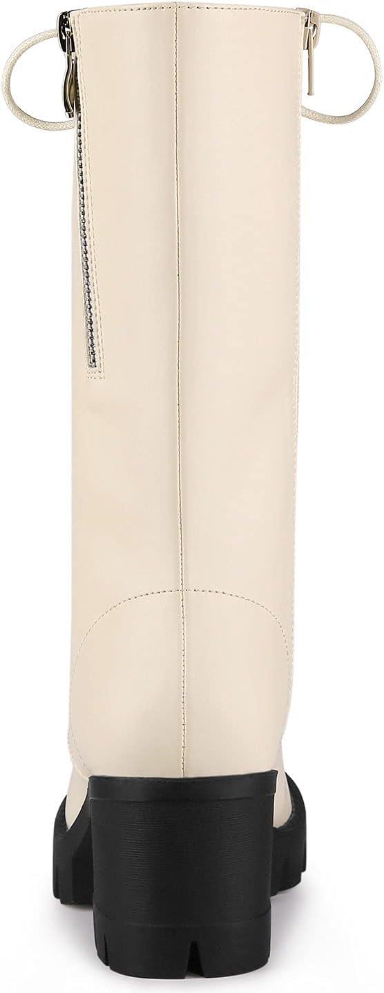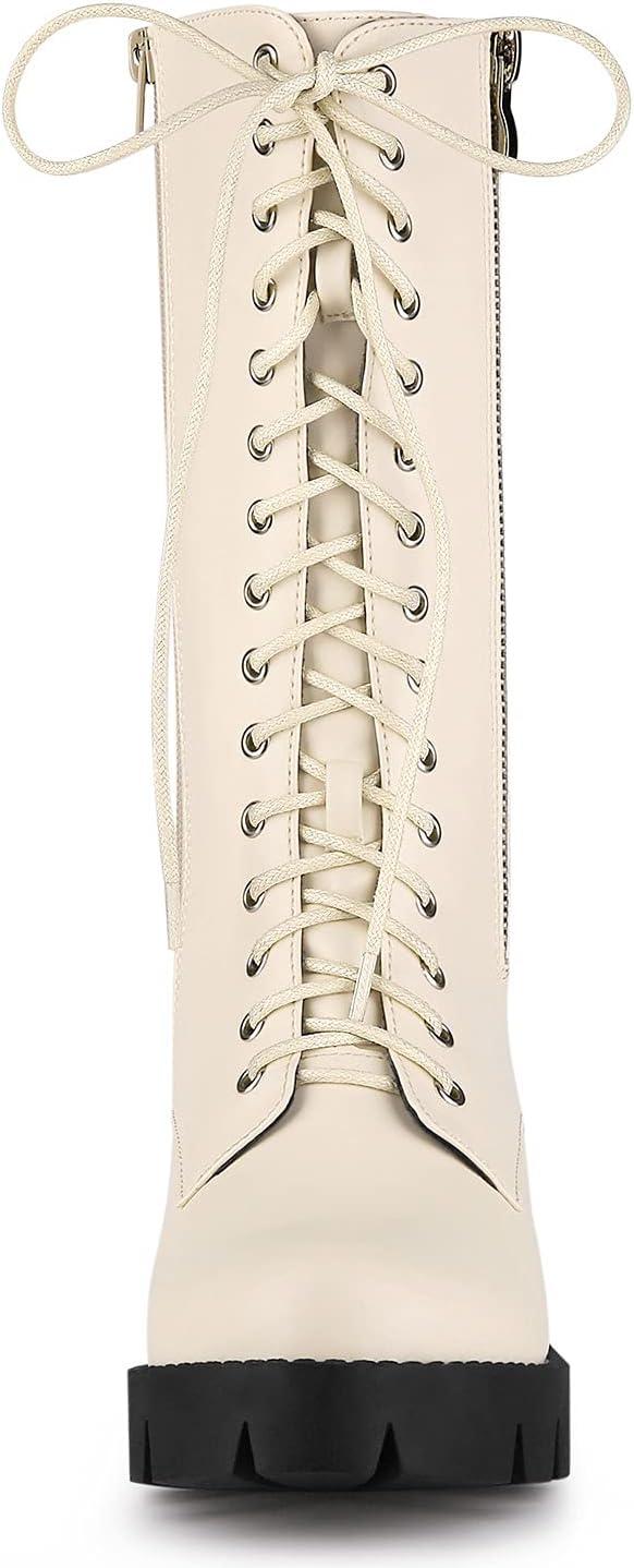 Allegra K Women’s Lace Up Platform Chunky Heel Mid Calf Combat Boots Halloween Boots(Beige)