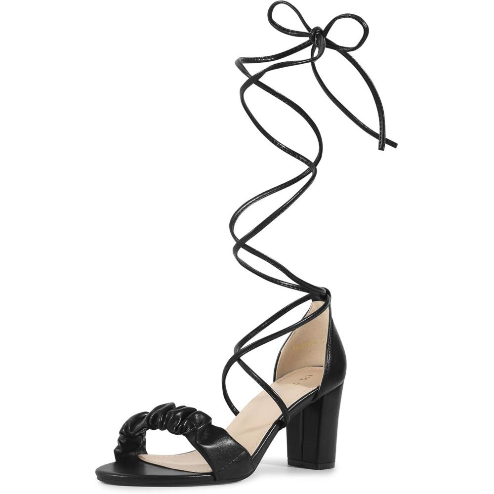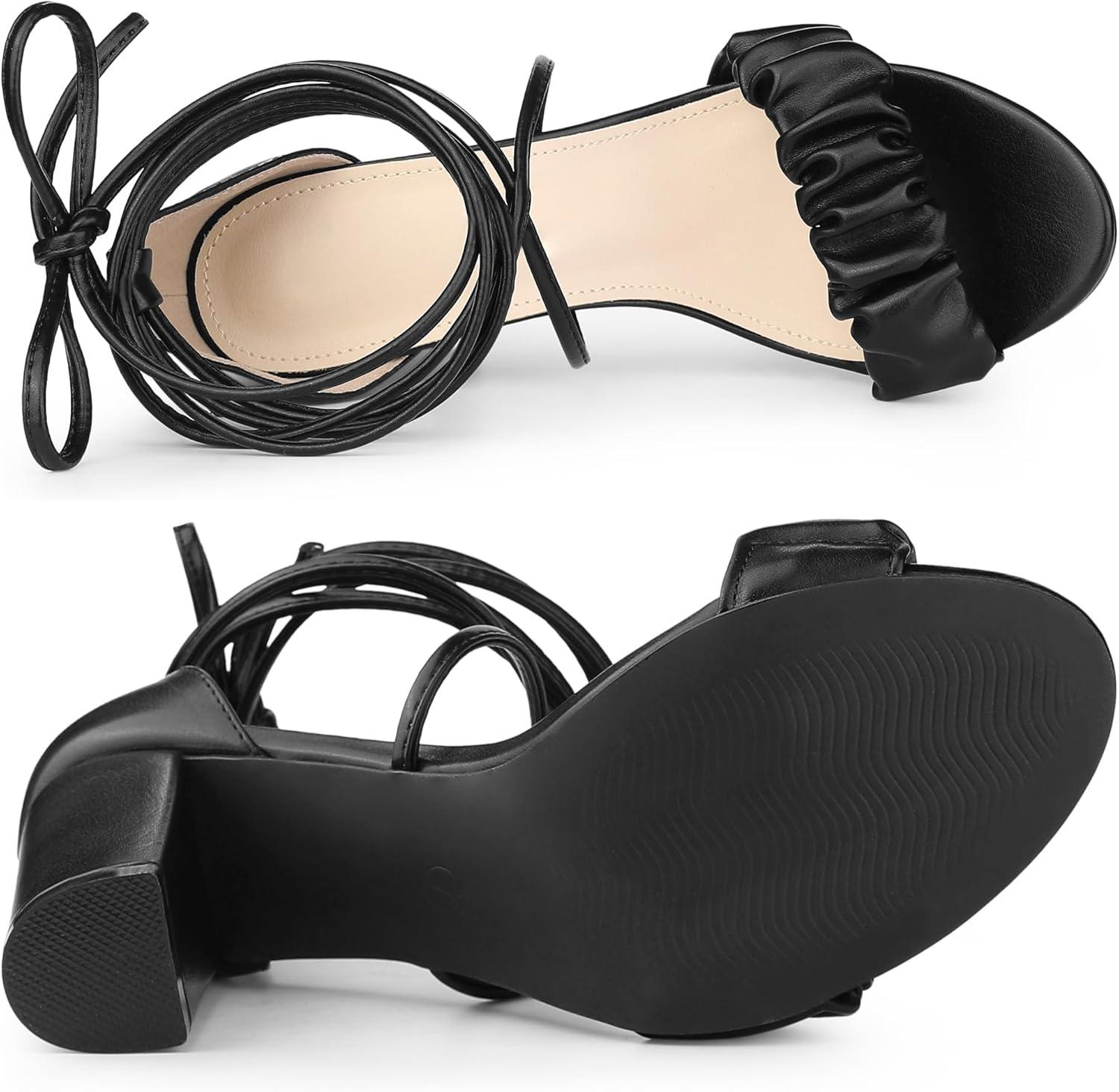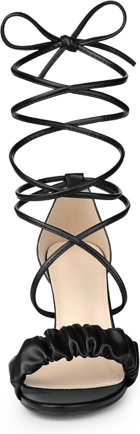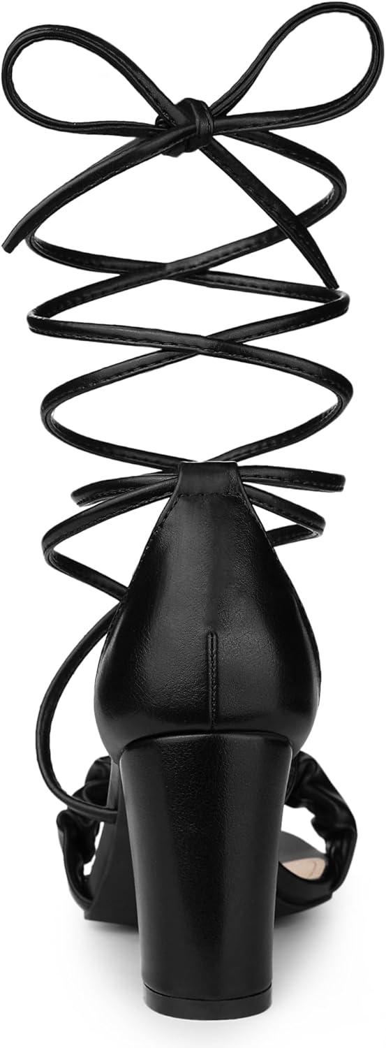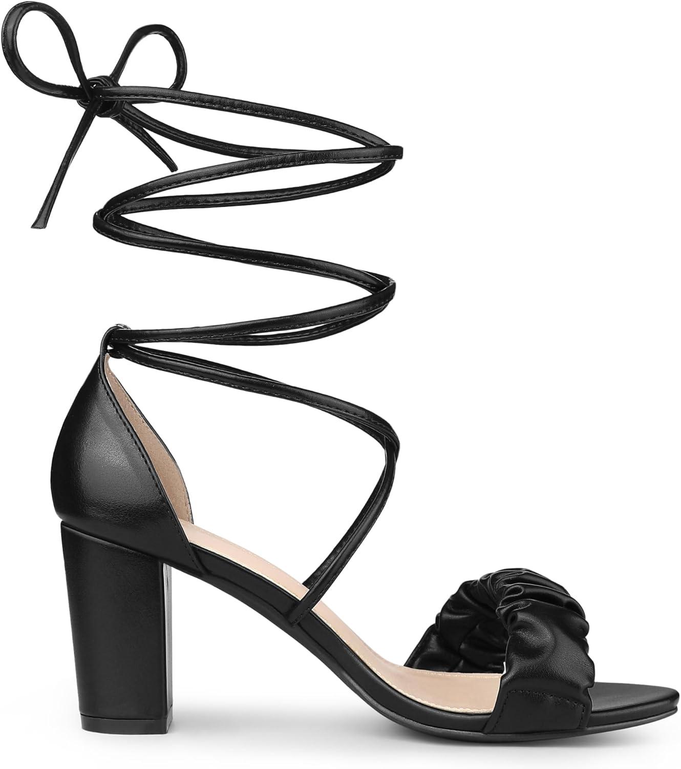 Allegra K Women’s Lace Up Ruched Strap Chunky Heels Strappy Sandals(Black)