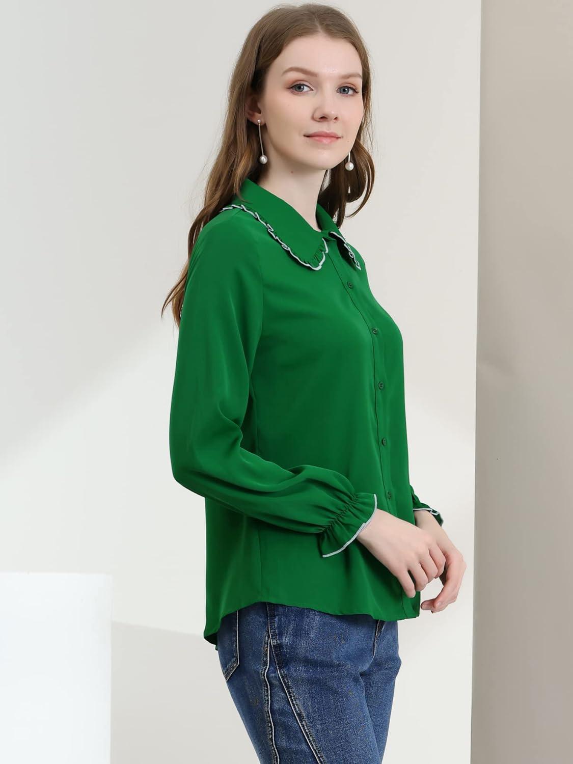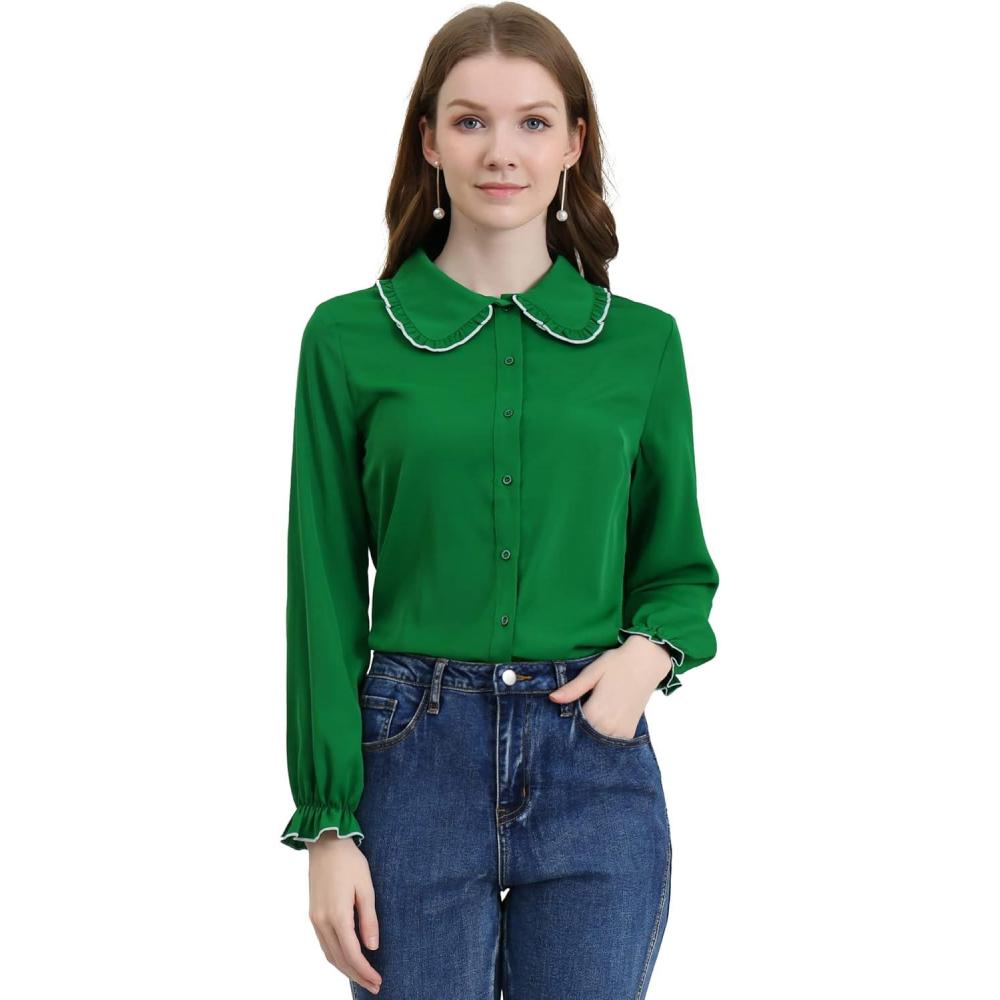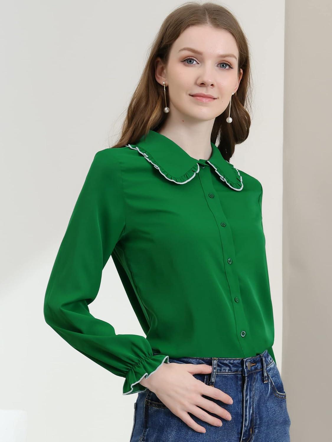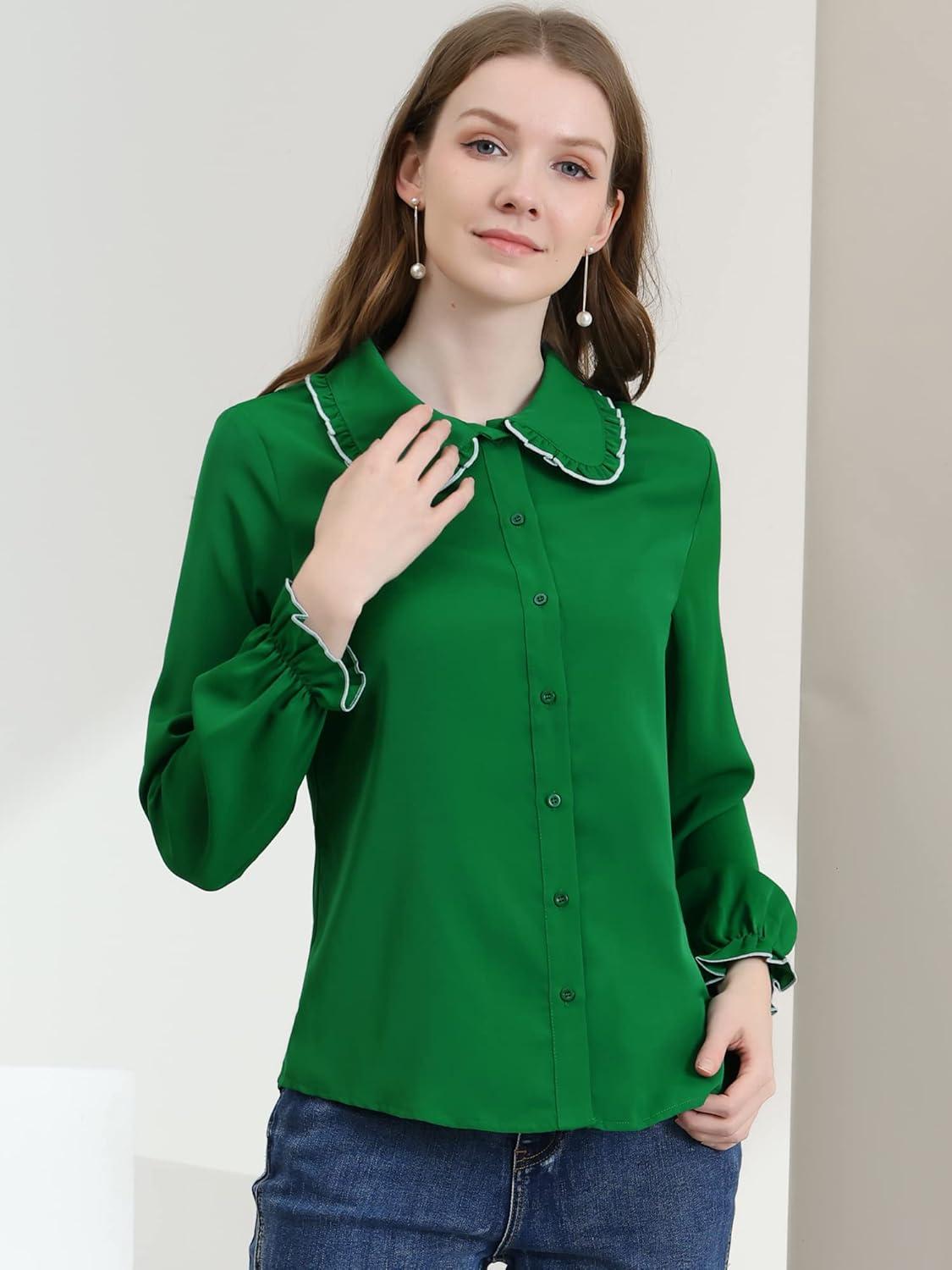 Allegra K Women’s Long Sleeve Blouse Ruffle Peter Pan Collar Button Down Vintage Dressy Blouses(Dark Green)