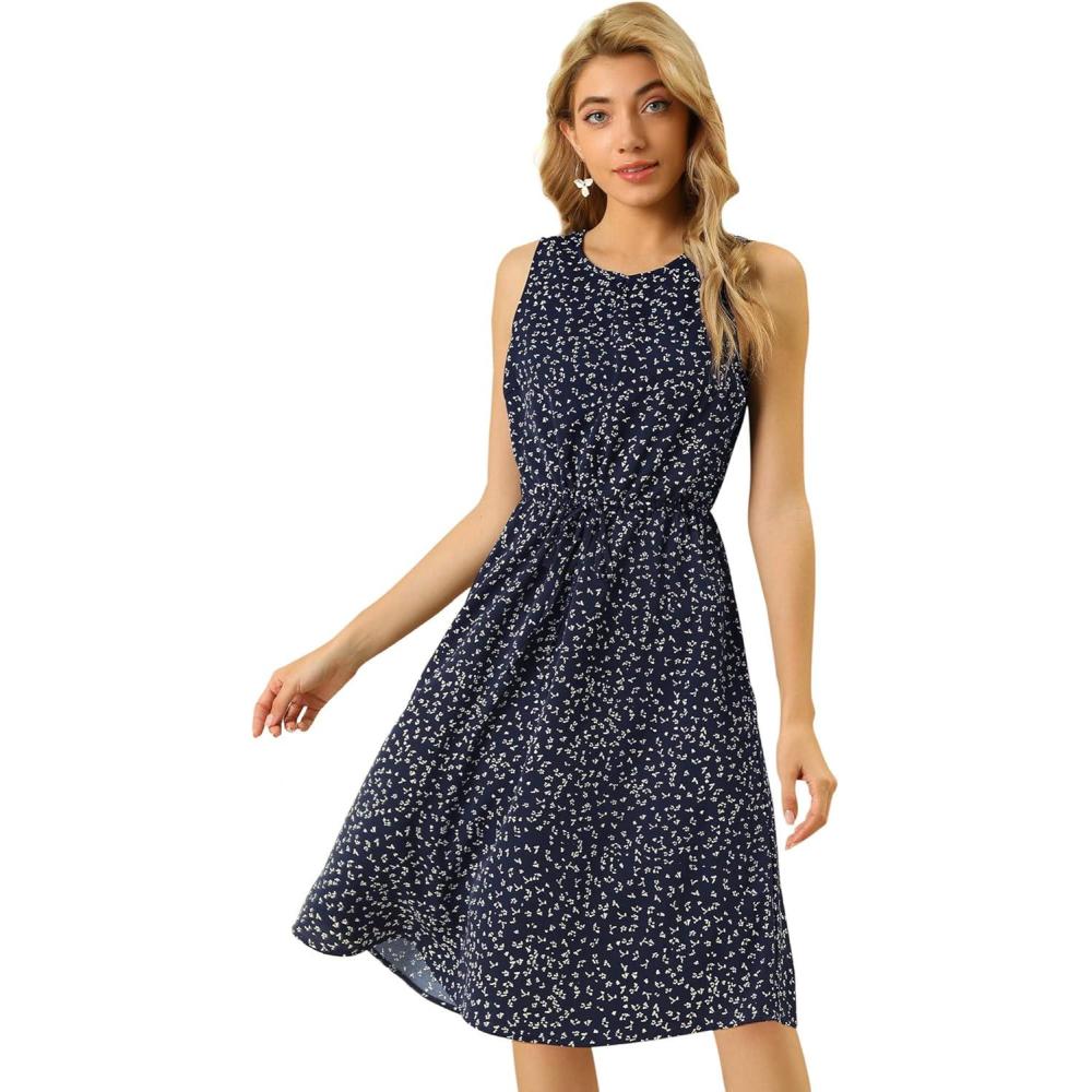 Allegra K Women’s Midi Floral Dresses Summer Casual Wedding Guest Sleeveless Dress(Dark Blue)