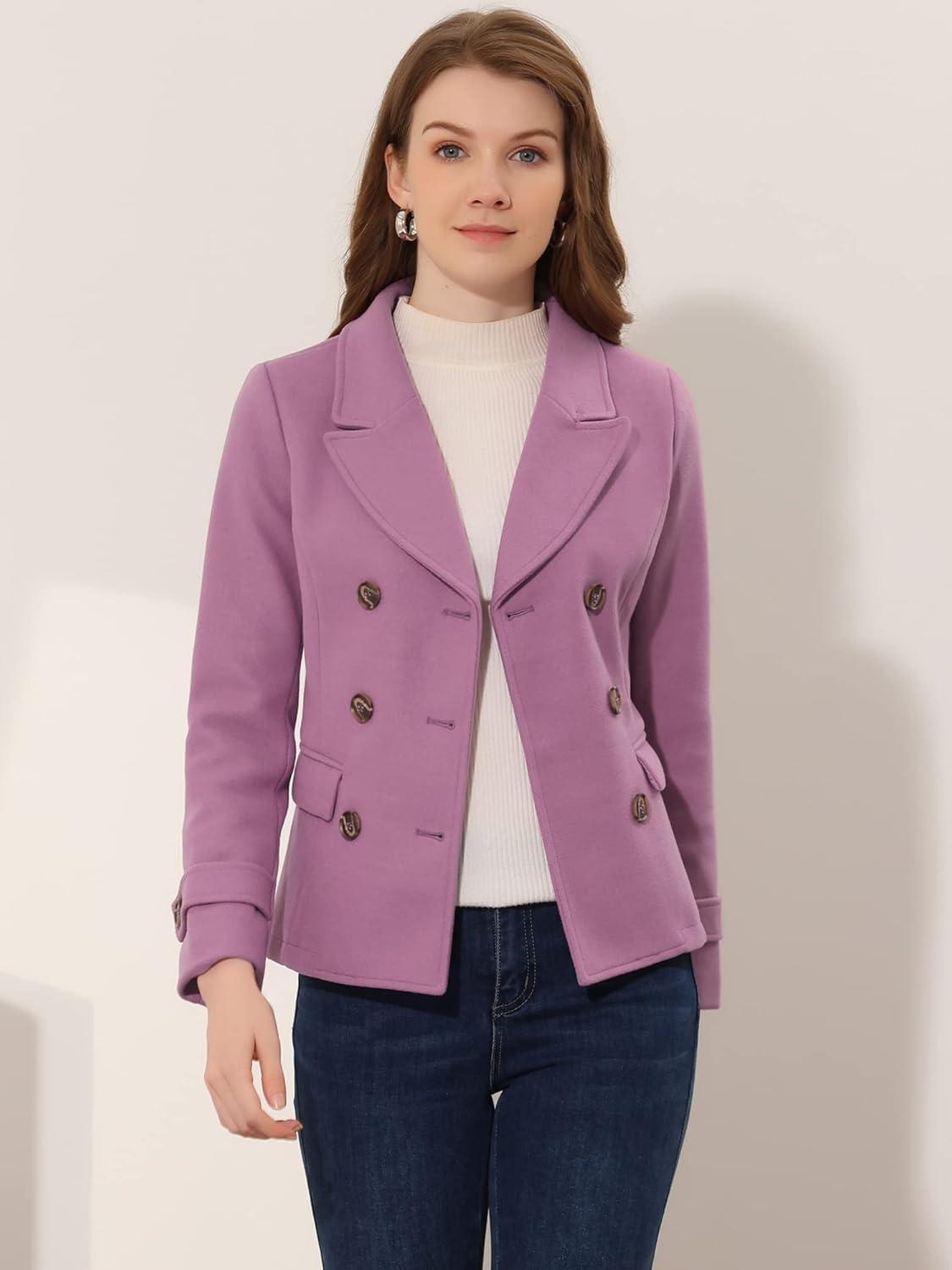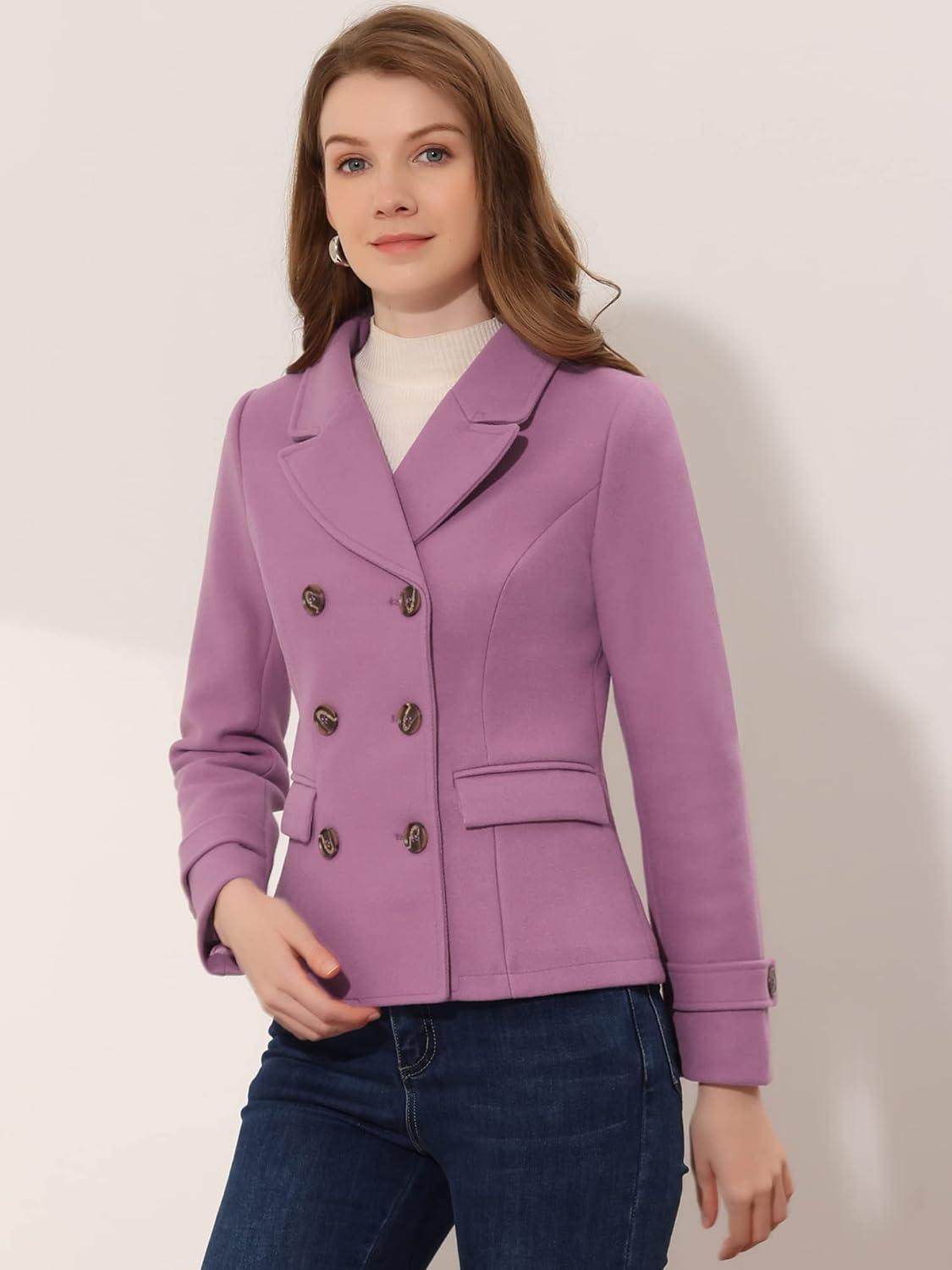 Allegra K Women’s Notched Lapel Double Breasted Pea Coat(Grey Purple)