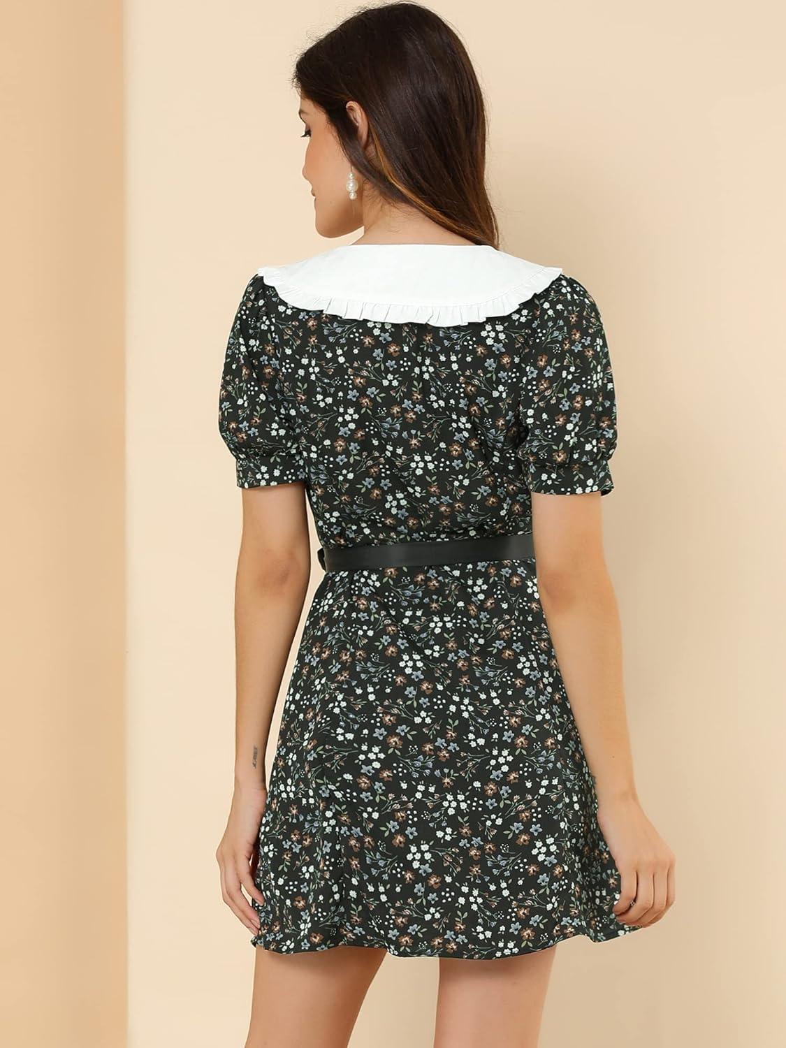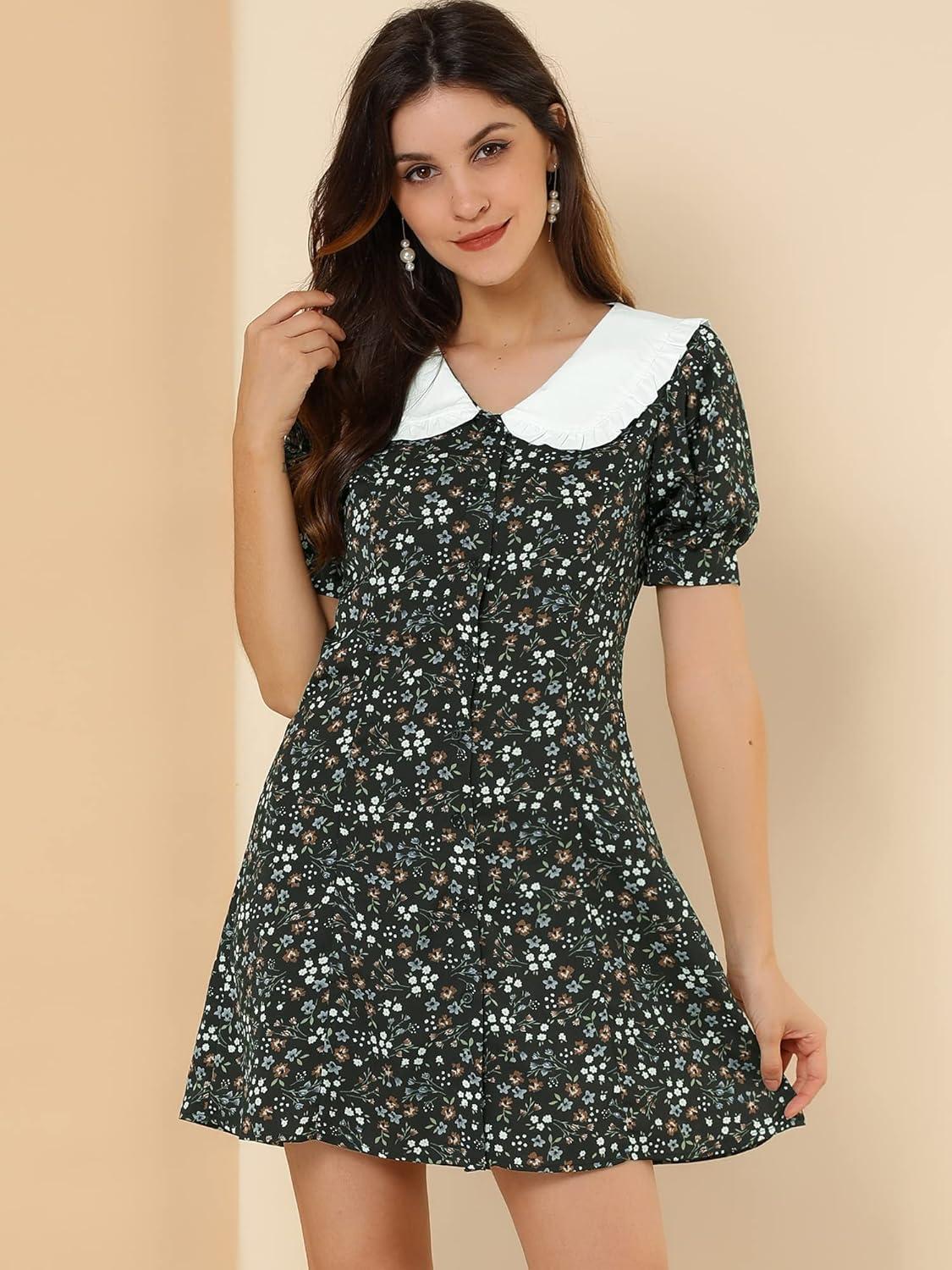 Allegra K Women’s Peter Pan Collar Dress 2024 Floral Printed Button Bow Tie Short Sleeve Shirt Dresses(Black)