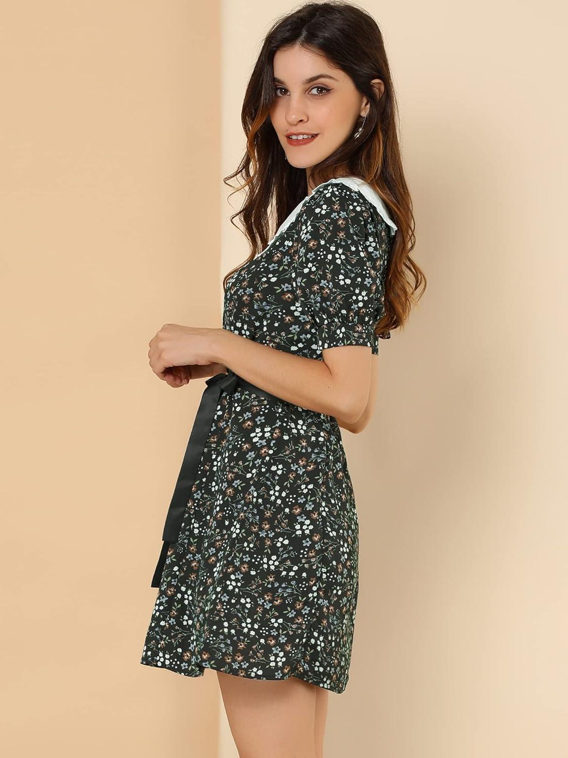 imageAllegra K Womens Peter Pan Collar Dress 2024 Floral Printed Button Bow Tie Short Sleeve Shirt DressesBlack Blue