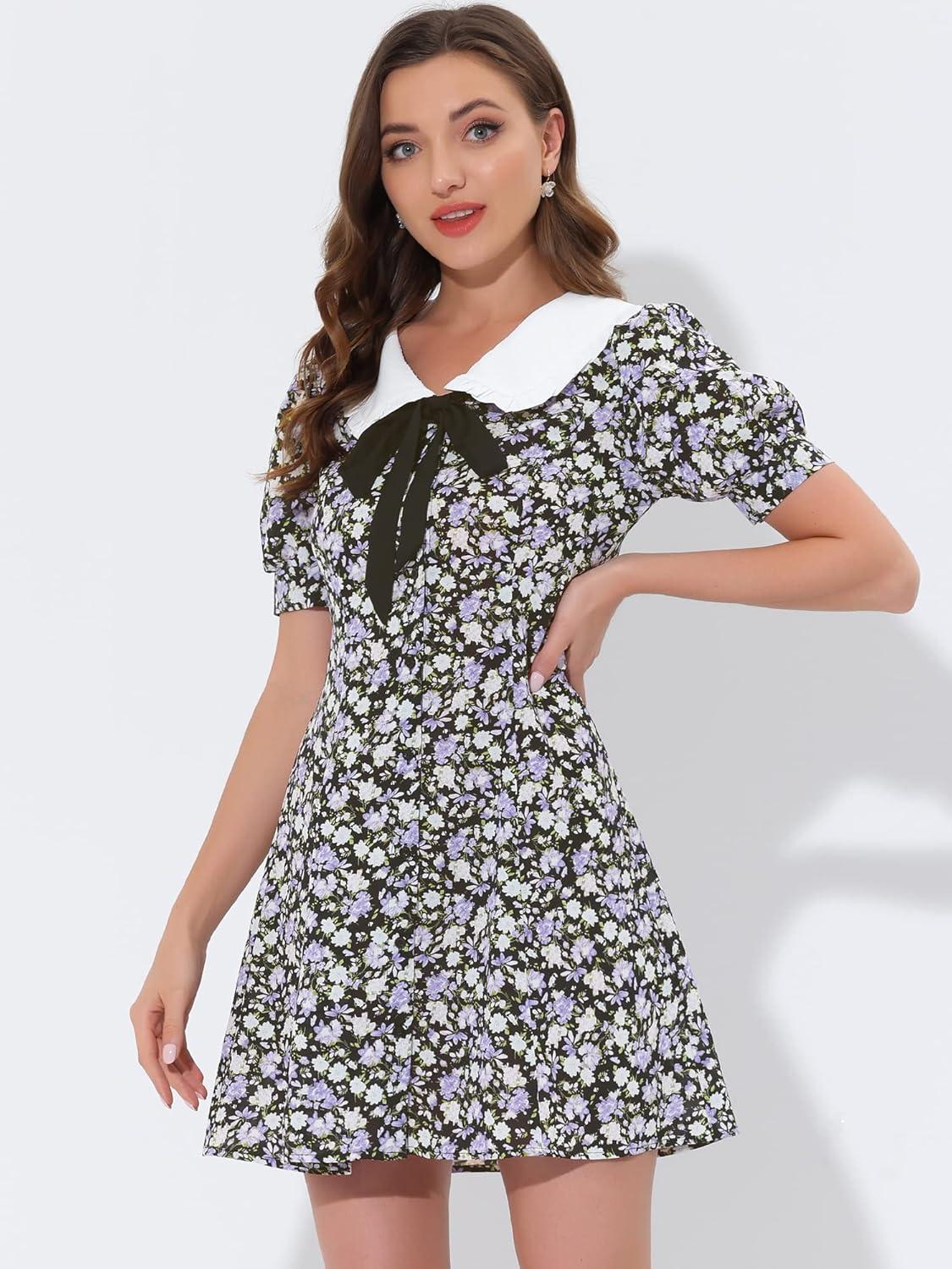Allegra K Women’s Peter Pan Collar Dress 2024 Floral Printed Button Bow Tie Short Sleeve Shirt Dresses(Black Blue)