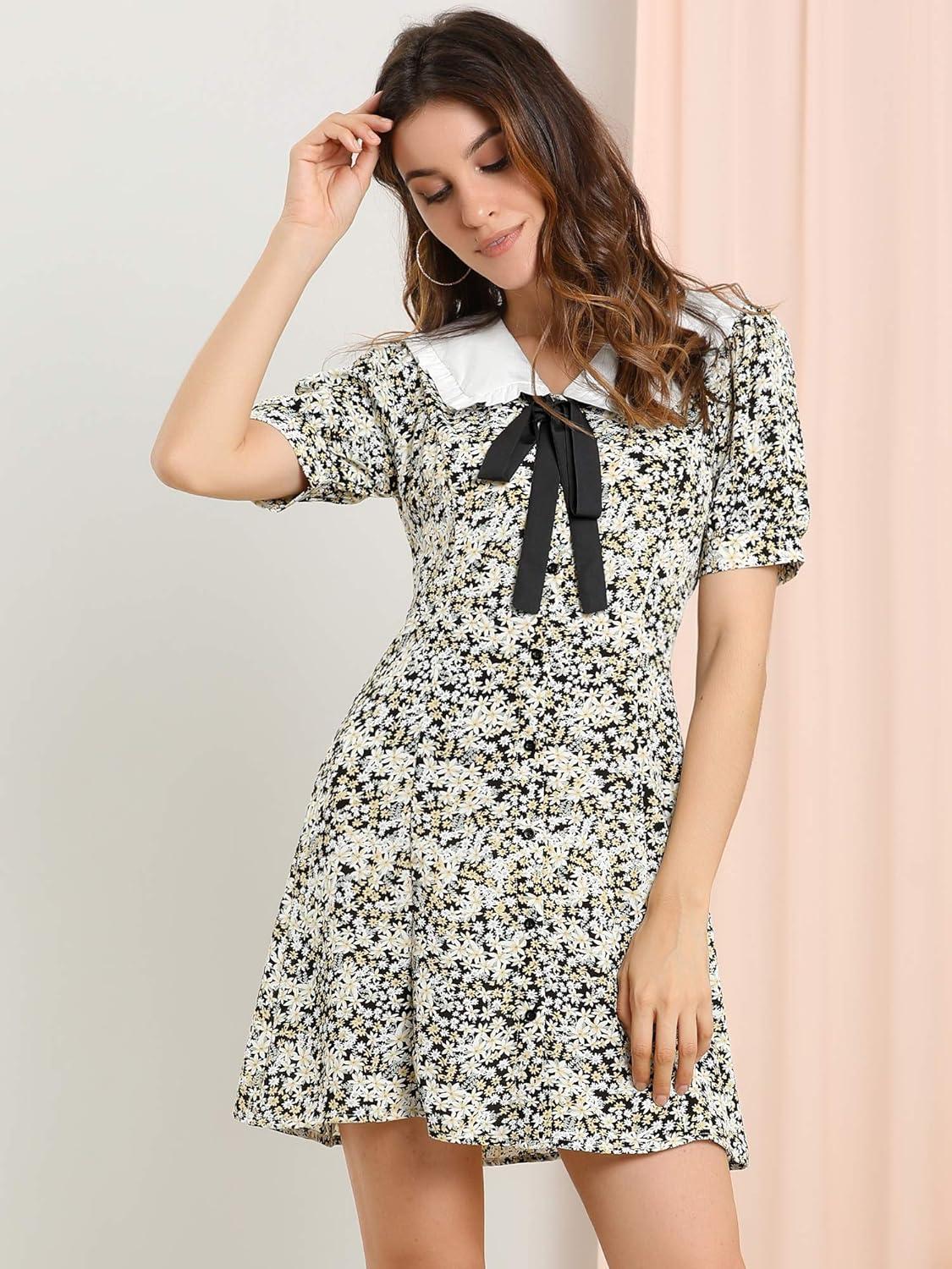 Allegra K Women’s Peter Pan Collar Dress 2024 Floral Printed Button Bow Tie Short Sleeve Shirt Dresses(Black)
