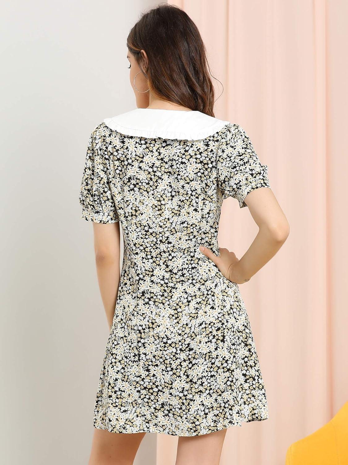 Allegra K Women's Peter Pan Collar Dress 2024 Floral Printed Button Bow Tie Short Sleeve Shirt Dresses(Black)