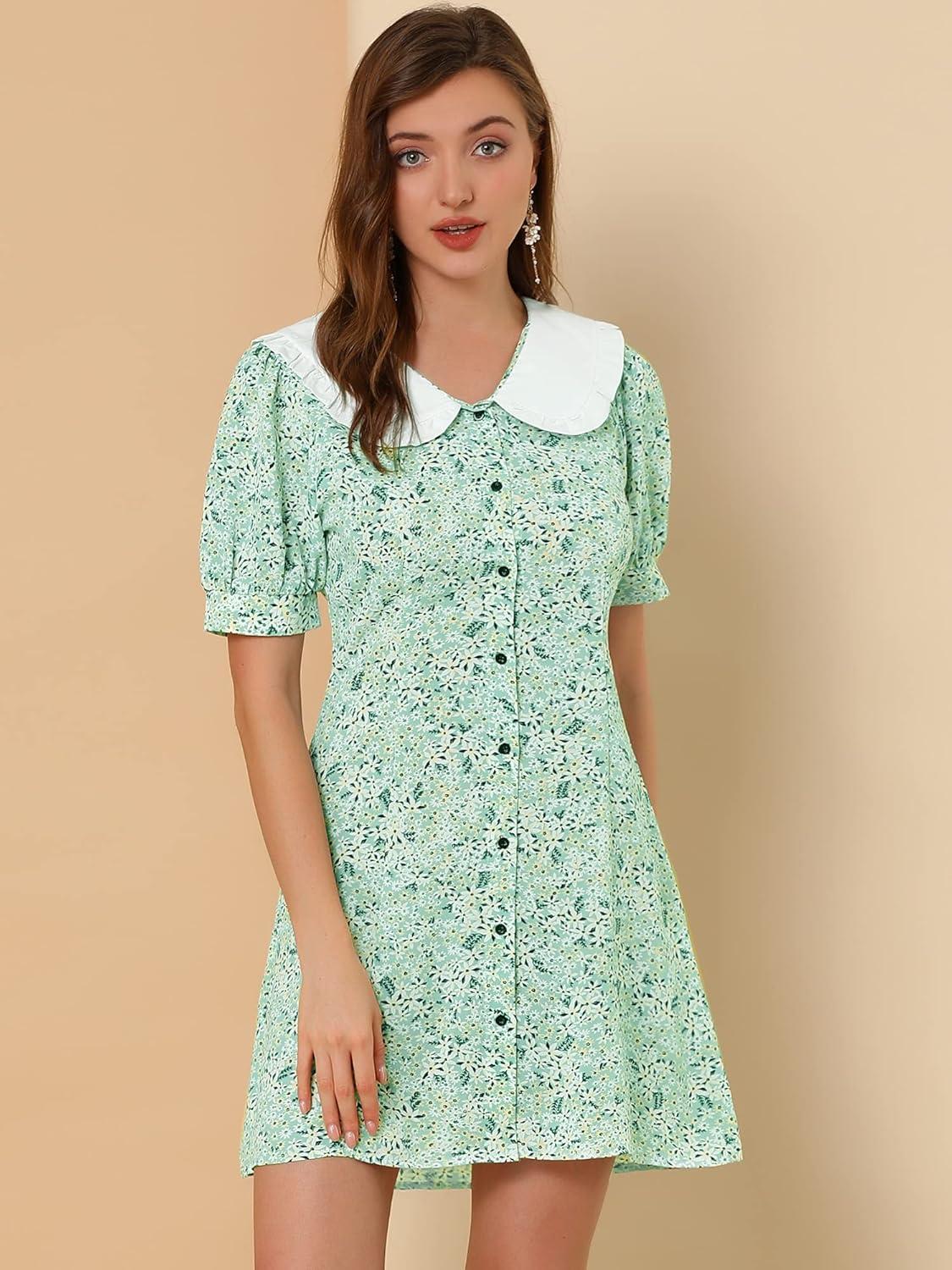 Allegra K Women’s Peter Pan Collar Dress 2024 Floral Printed Button Bow Tie Short Sleeve Shirt Dresses(Green)
