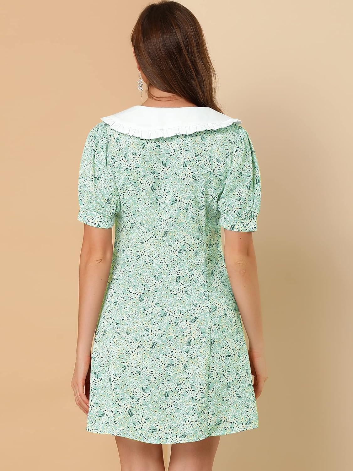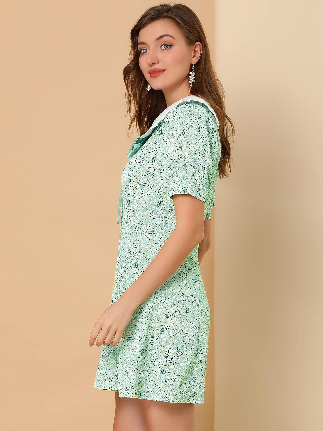 Allegra K Women's Peter Pan Collar Dress 2024 Floral Printed Button Bow Tie Short Sleeve Shirt Dresses(Green)