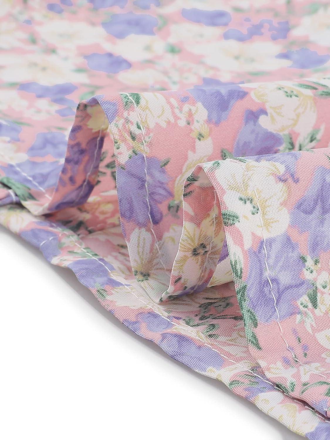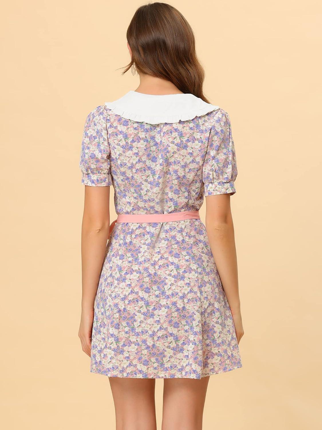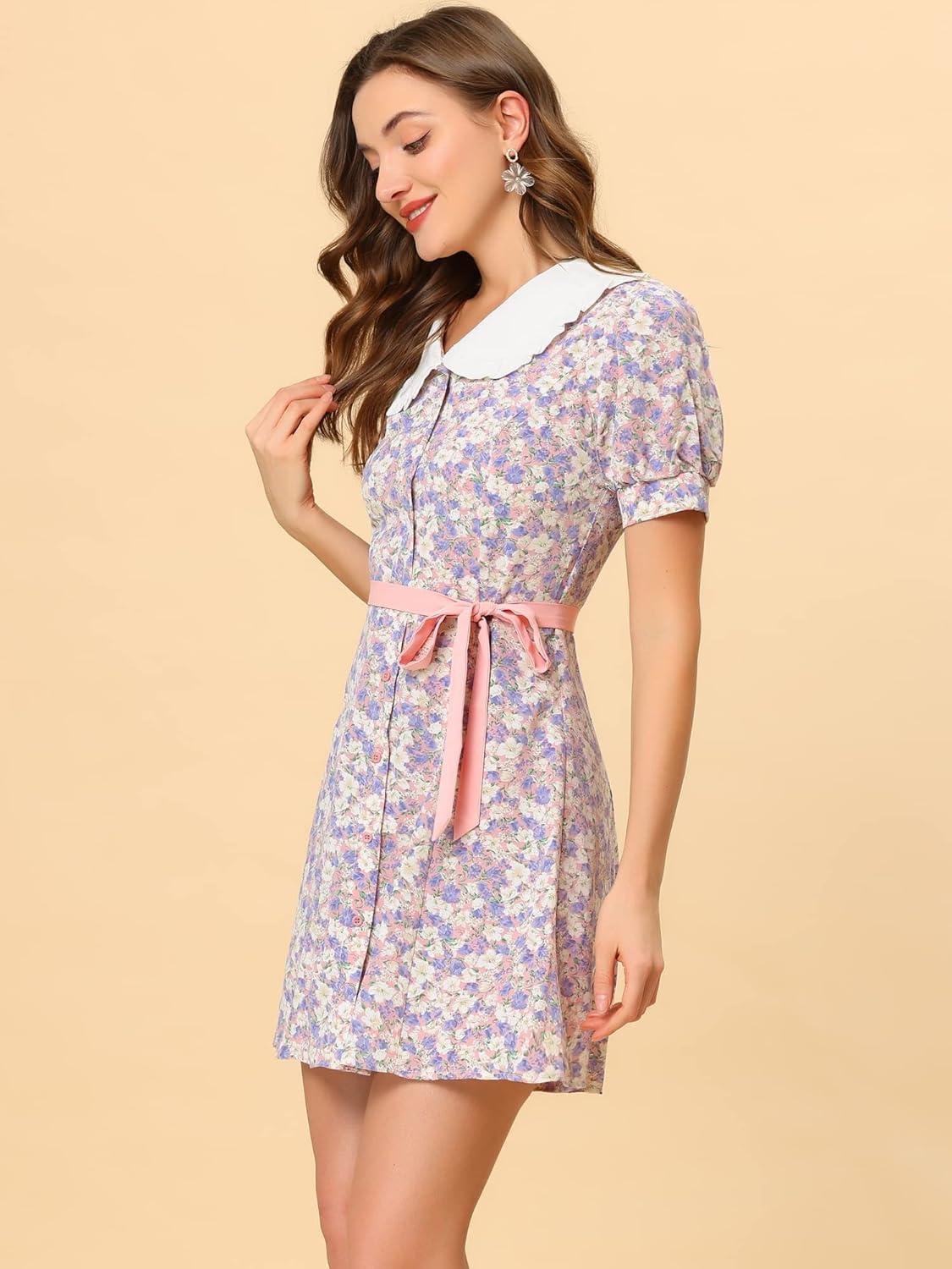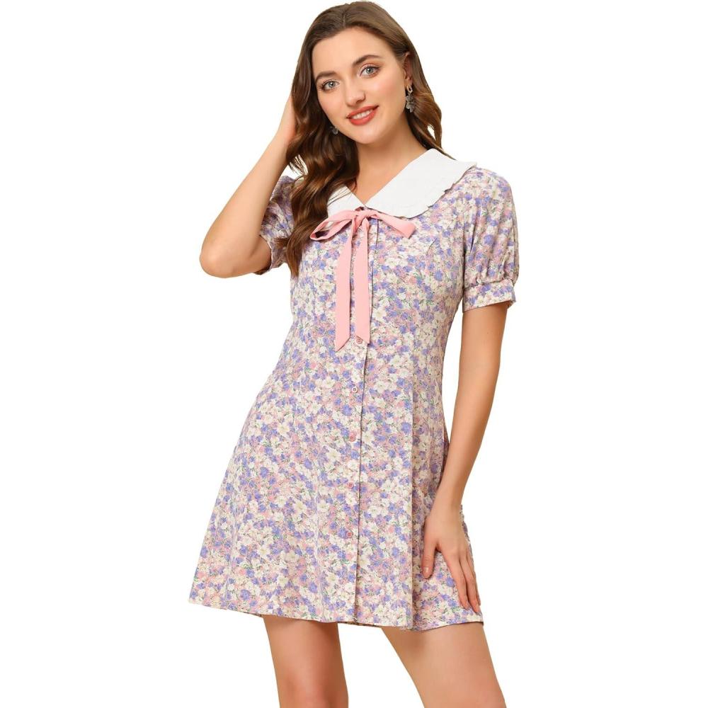 Allegra K Women’s Peter Pan Collar Dress 2024 Floral Printed Button Bow Tie Short Sleeve Shirt Dresses(Pink)