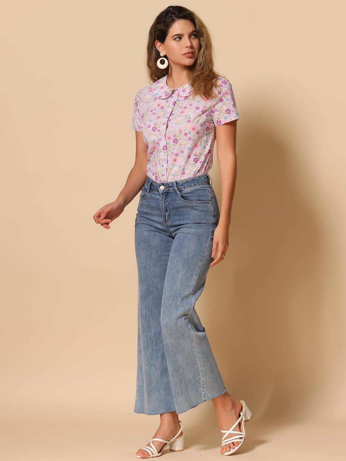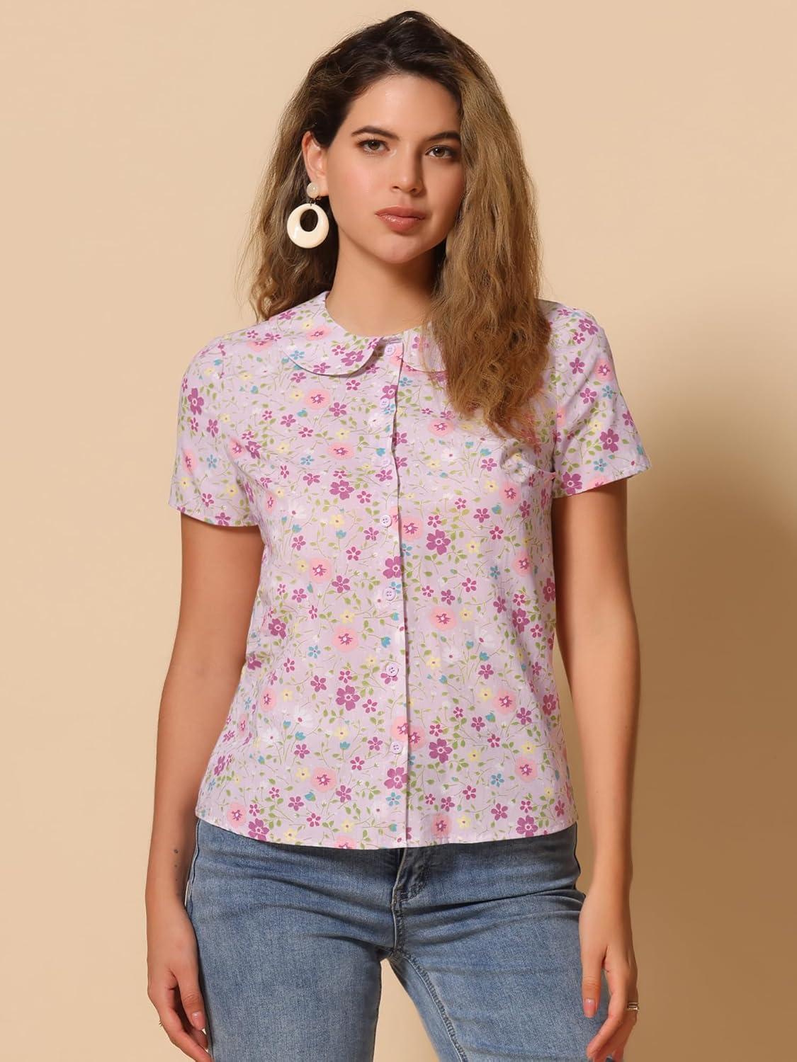 Allegra K Women’s Peter Pan Collar Shirts Button Front Vintage Floral Blouse Top(Light Pink)