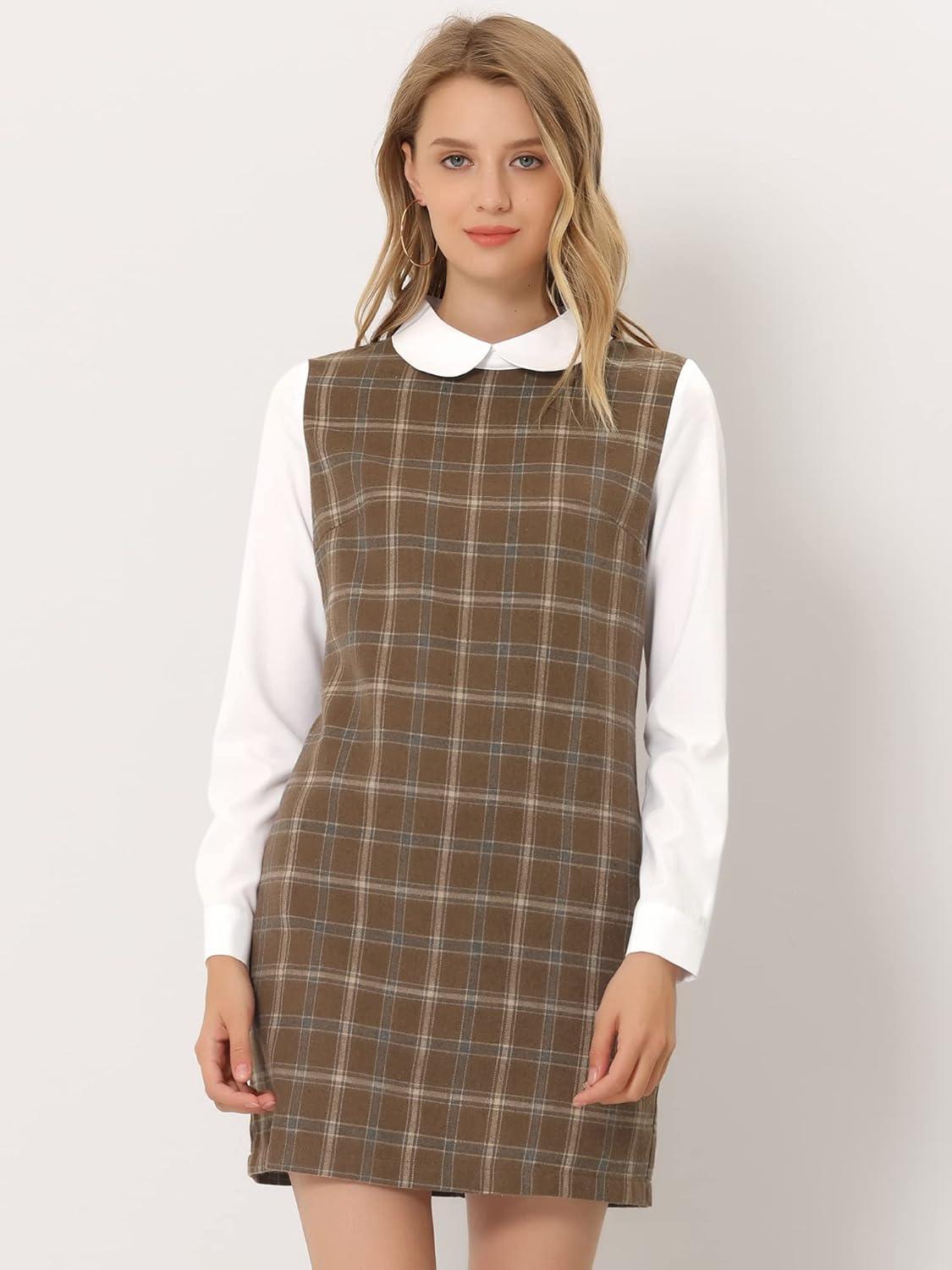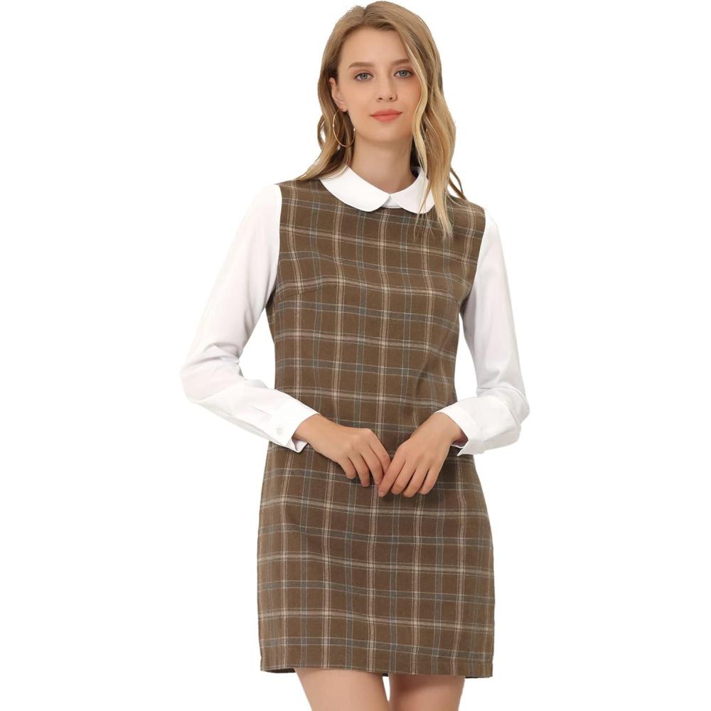 imageAllegra K Womens Peter Pan Dress 60s Clock Block Mini Long Sleeve DressesDark Brown