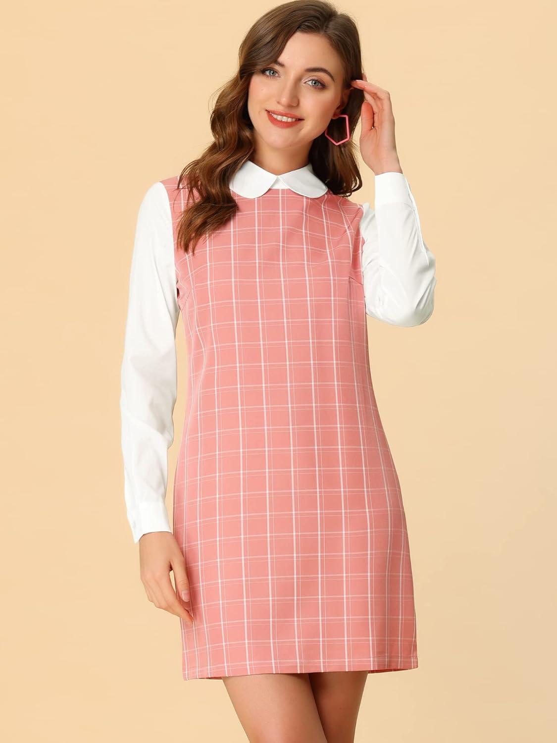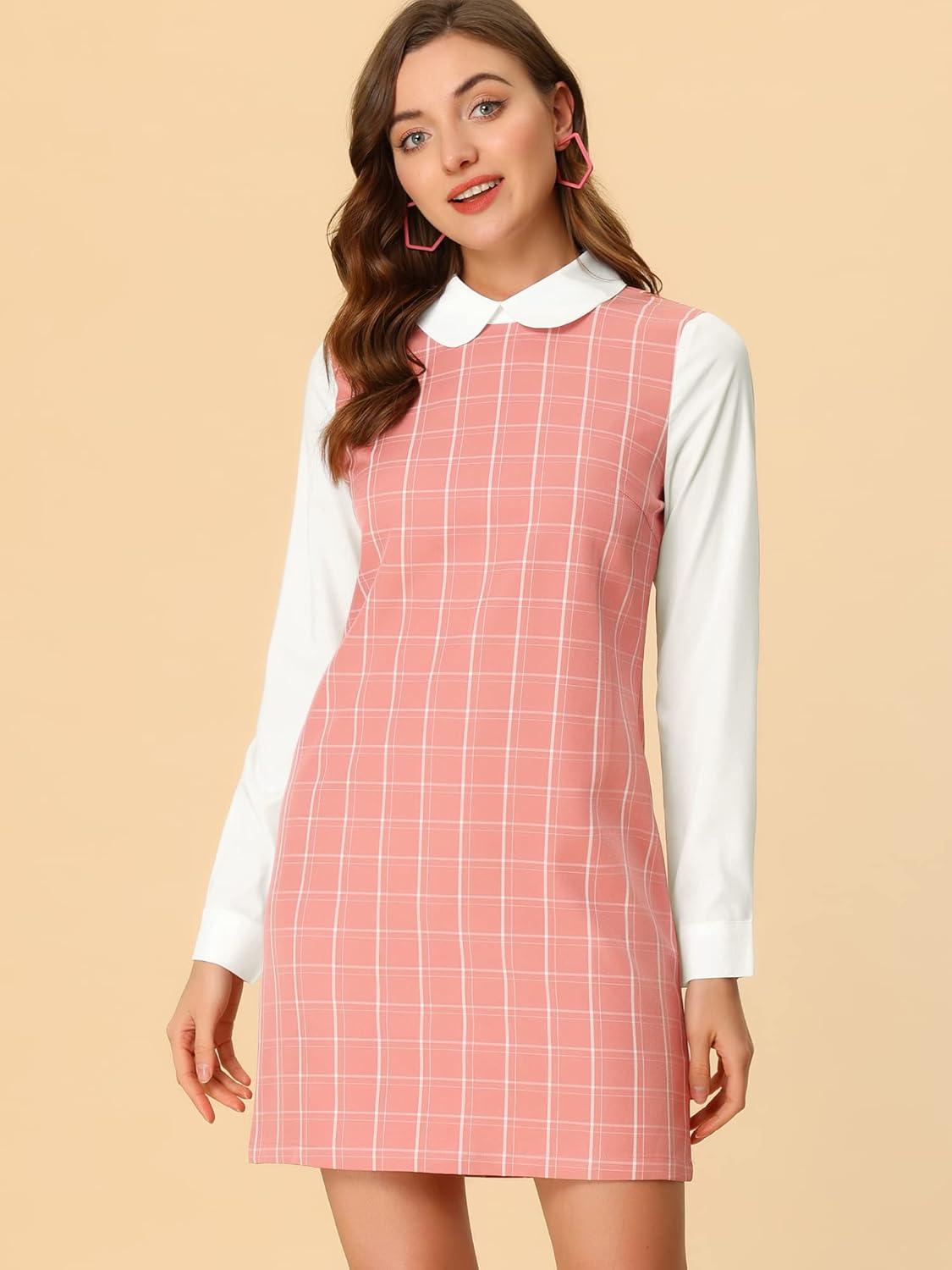 imageAllegra K Womens Peter Pan Dress 60s Clock Block Mini Long Sleeve DressesPink