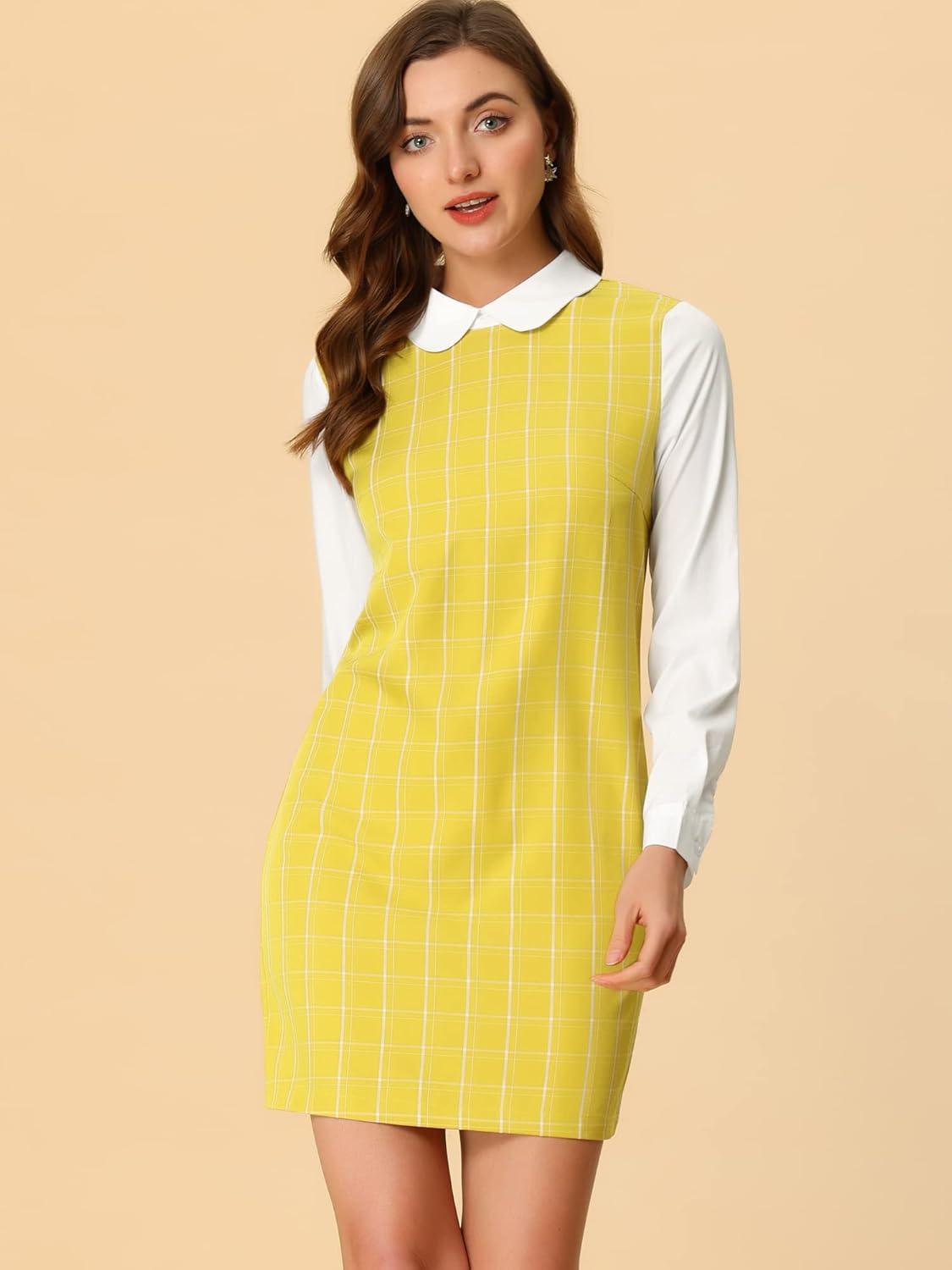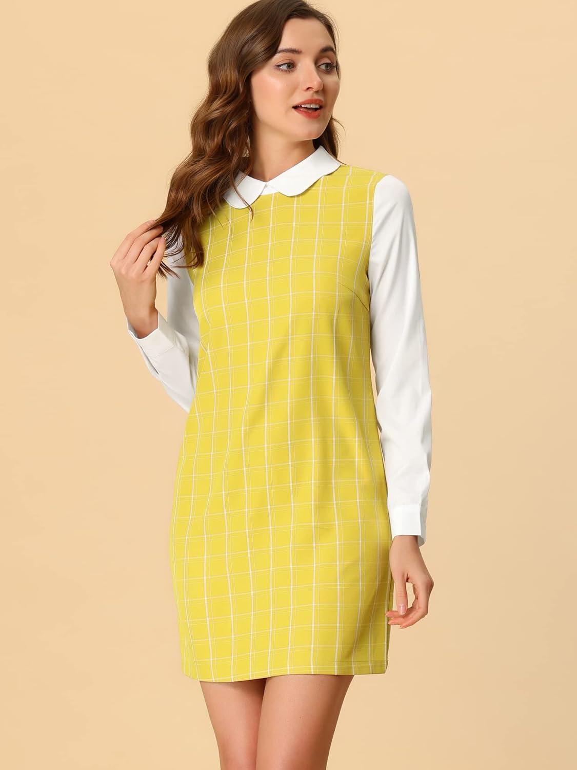 imageAllegra K Womens Peter Pan Dress 60s Clock Block Mini Long Sleeve DressesYellow
