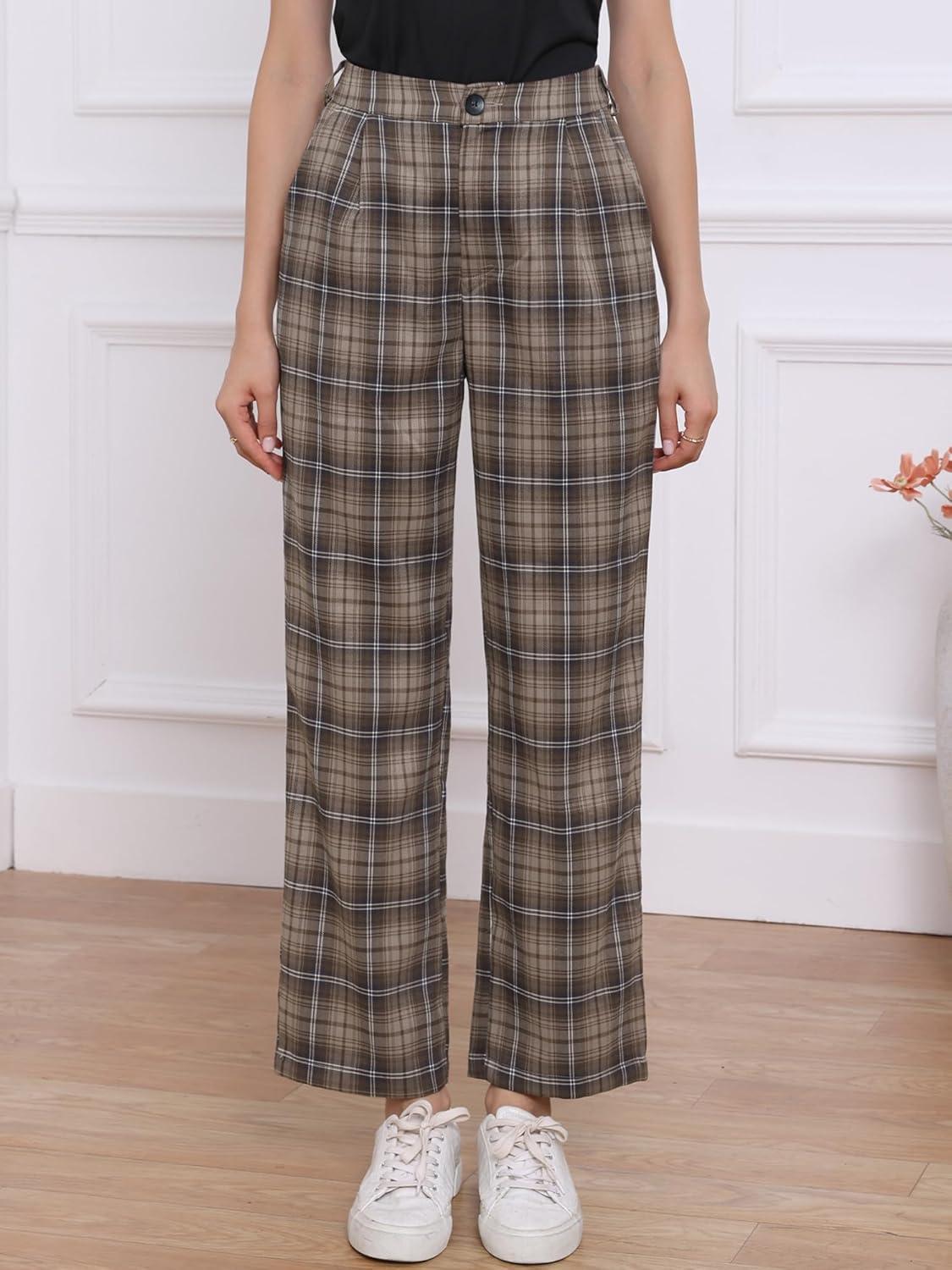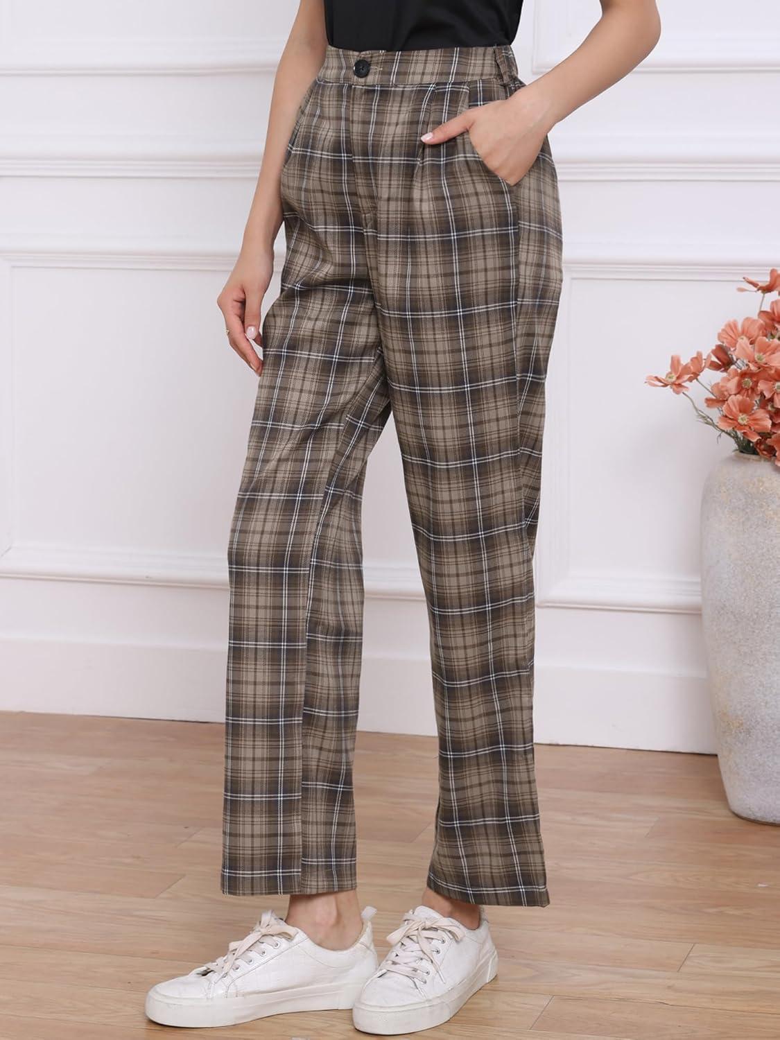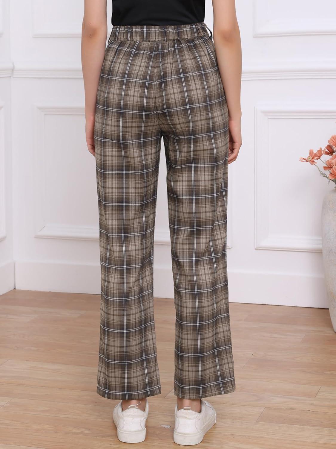 Allegra K Women’s Plaid Pants Elastic Waist Casual Work Office Long Trousers(Dark Gray Brown)