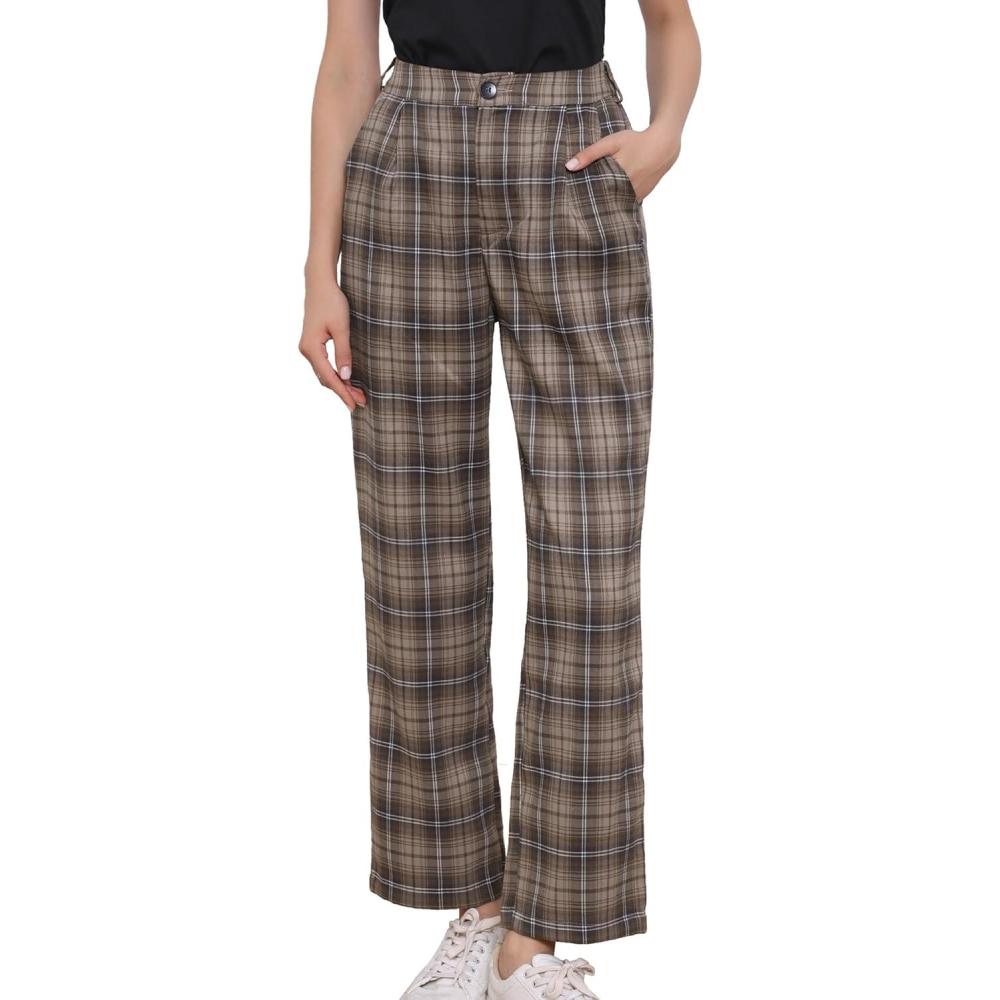 Allegra K Women’s Plaid Pants Elastic Waist Casual Work Office Long Trousers(Brown Coffee)