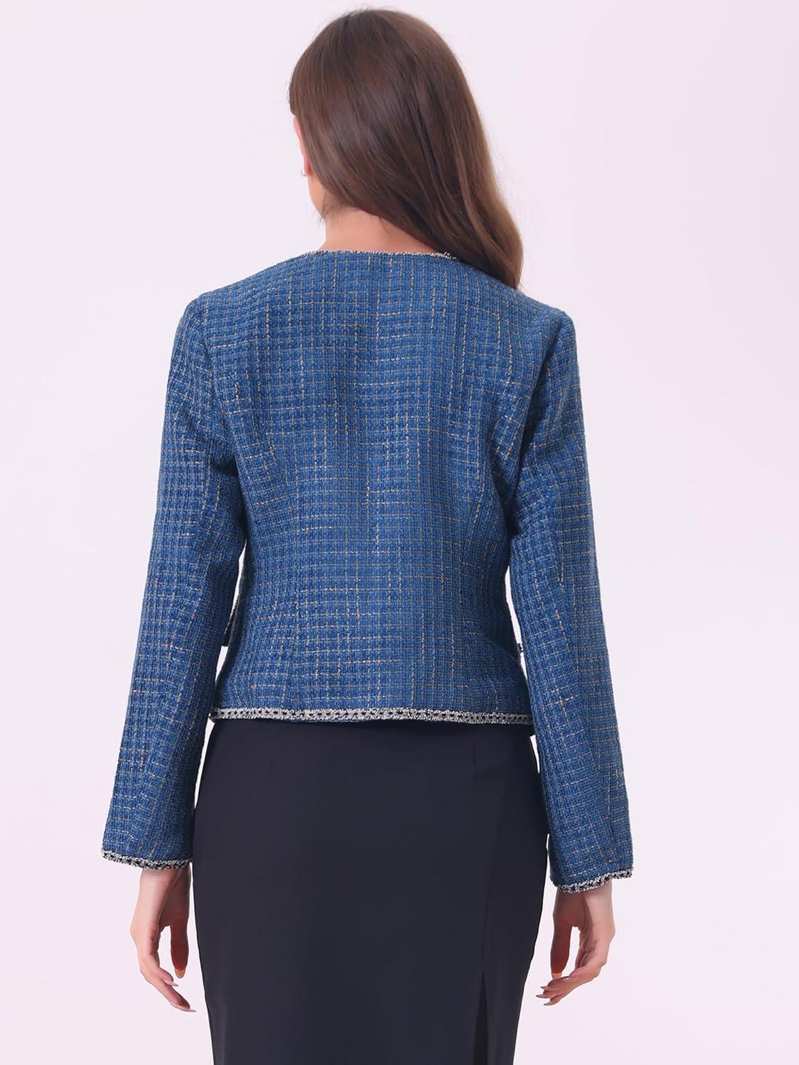 Allegra K Women’s Plaid Tweed Blazer Long Sleeve Open Front Work Office Short Jacket(Dark Blue)