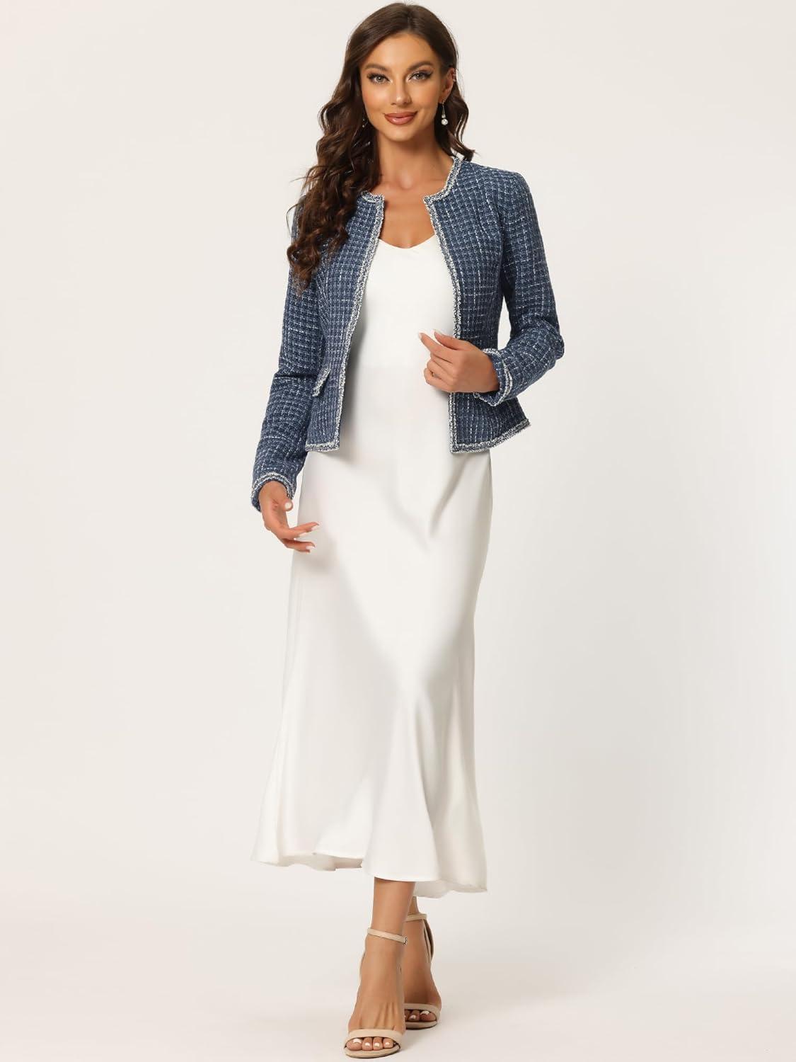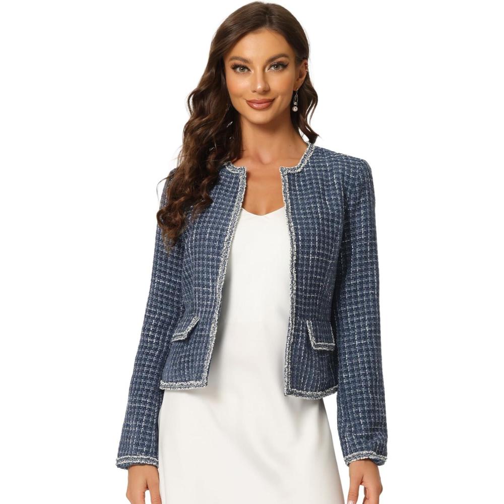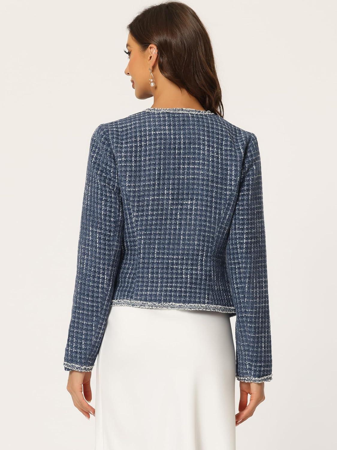 Allegra K Women’s Plaid Tweed Blazer Long Sleeve Open Front Work Office Short Jacket(Dark Blue)