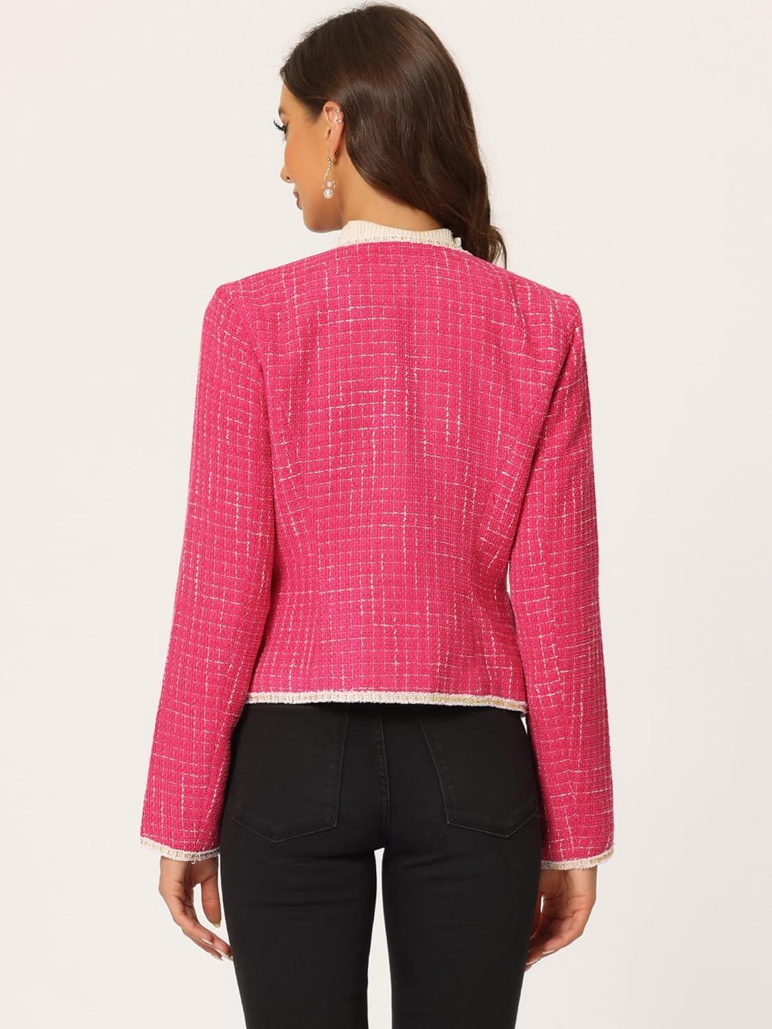 Allegra K Women’s Plaid Tweed Blazer Long Sleeve Open Front Work Office Short Jacket(Hot Pink)