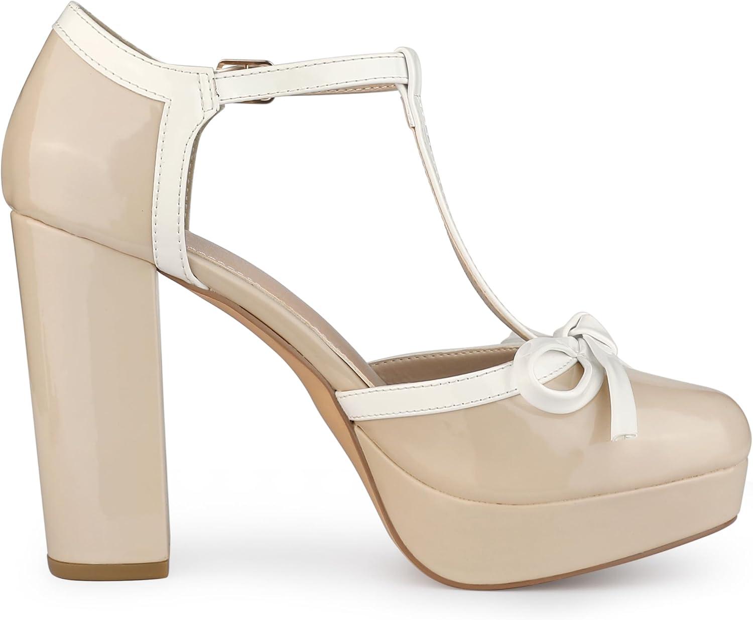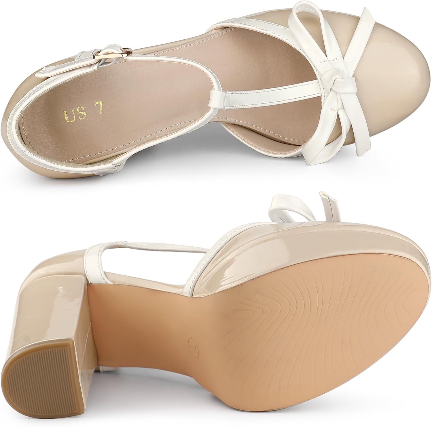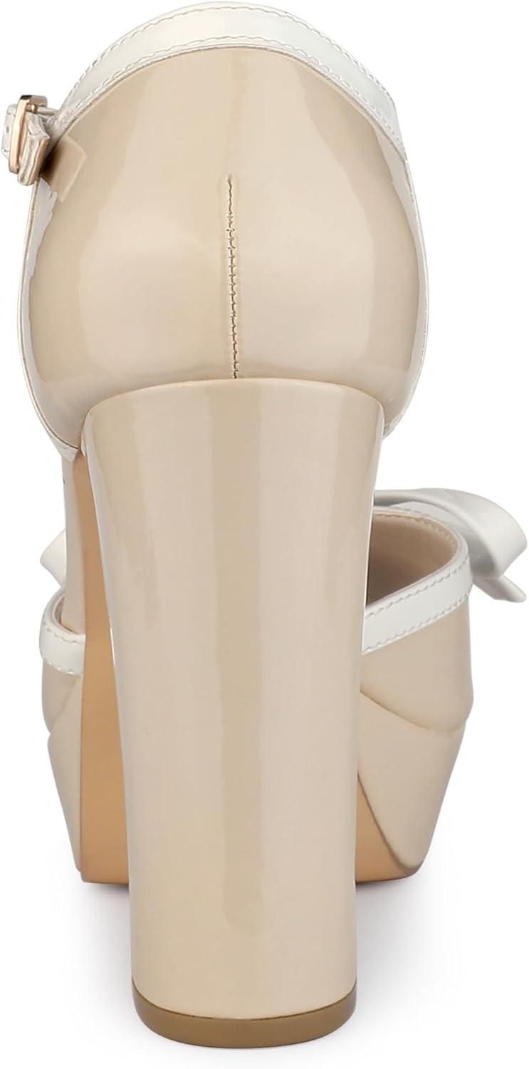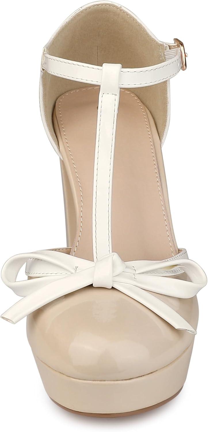 Allegra K Women’s Platform Bow t Strap Chunky Heels Pumps(Nude)