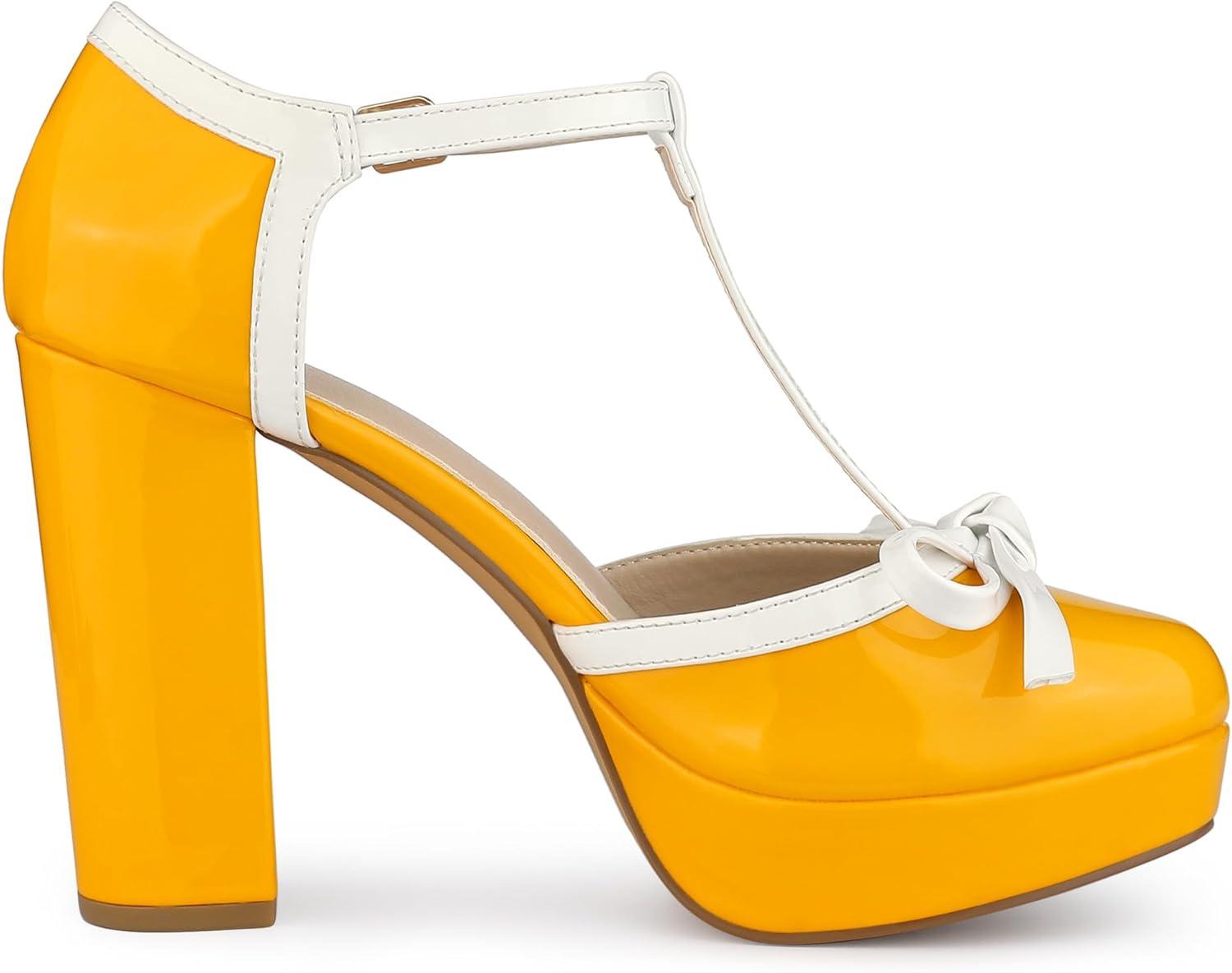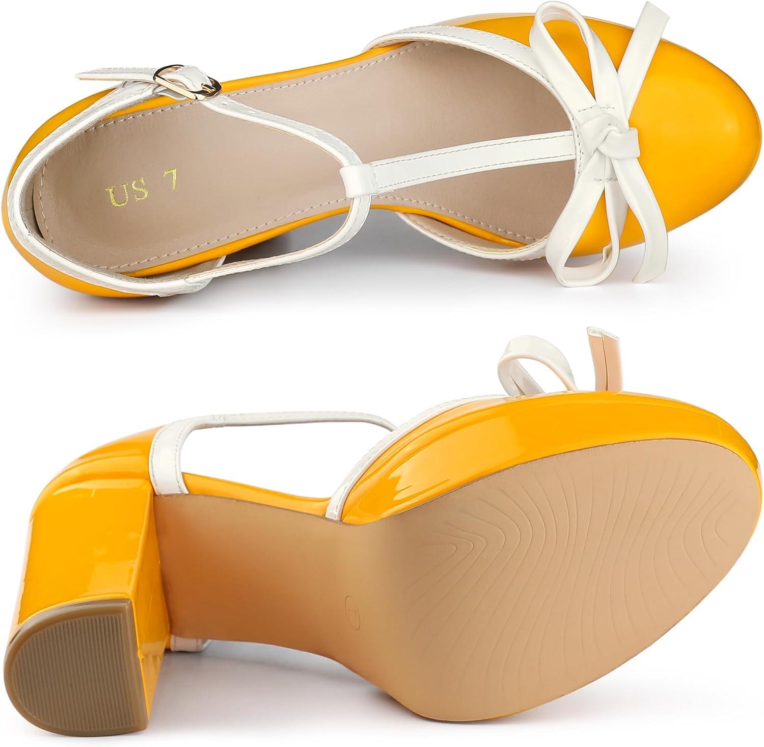 Allegra K Women’s Platform Bow t Strap Chunky Heels Pumps(Yellow)
