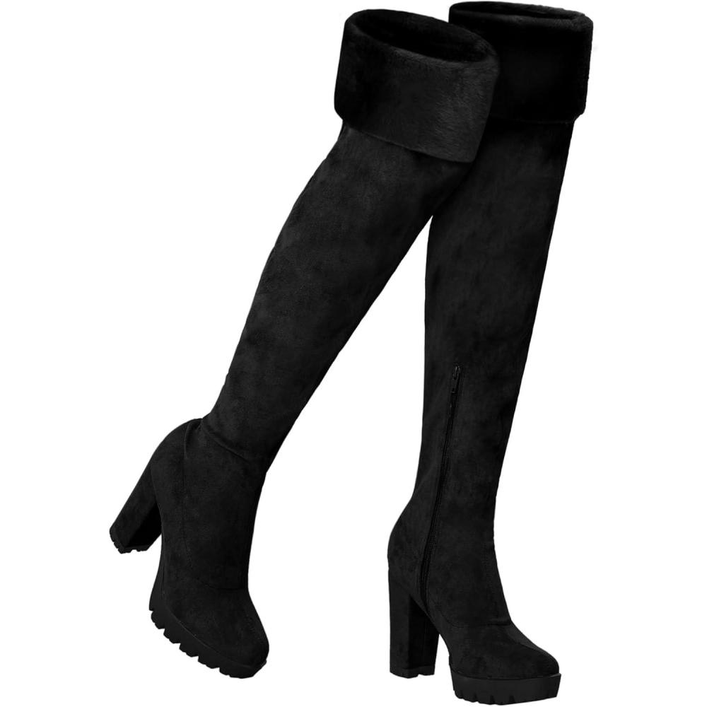 Allegra K Women’s Platform Faux Fur Zipper Chunky Heel Over Knee Thigh High Boots(Black)
