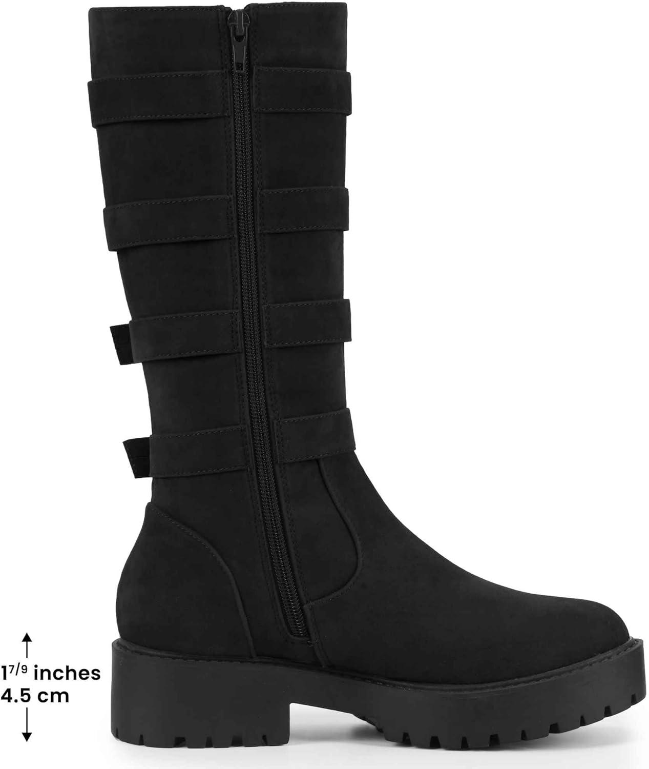 Allegra K Women’s Platform Goth Boots Buckles Round Toe Chunky Heel Knee High Boots(Black)