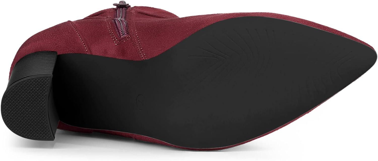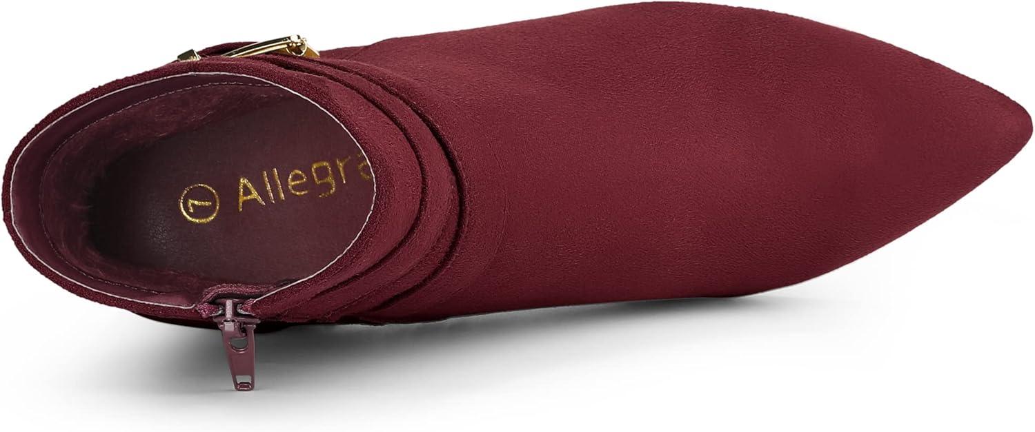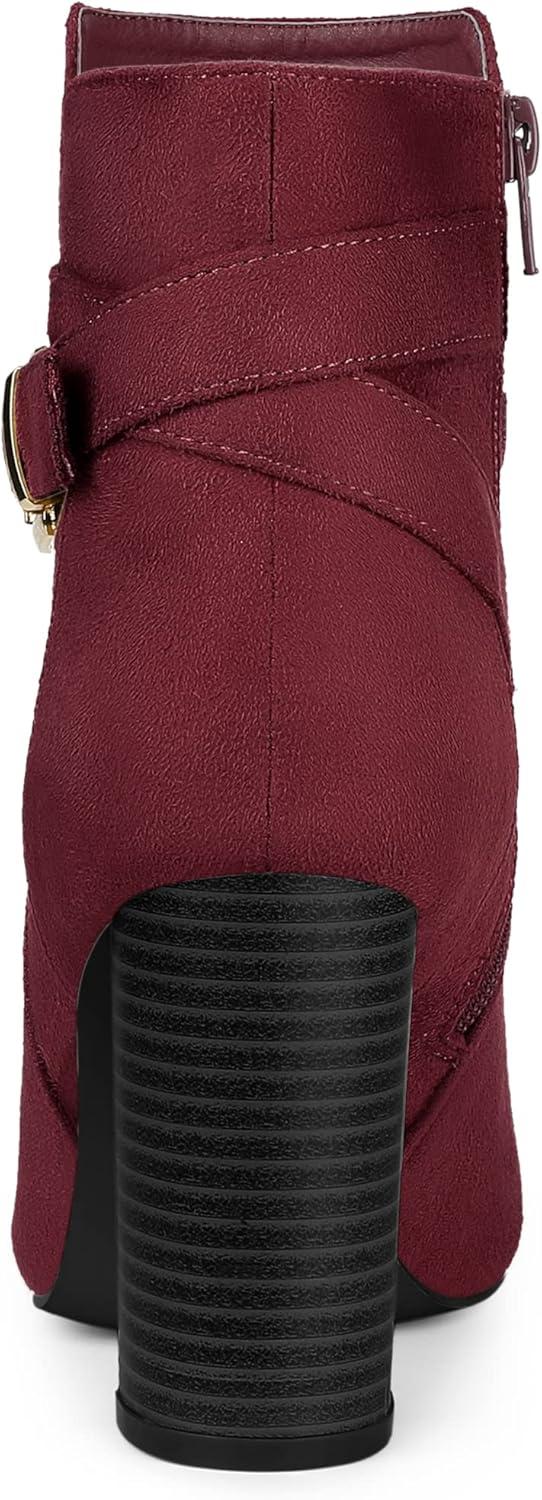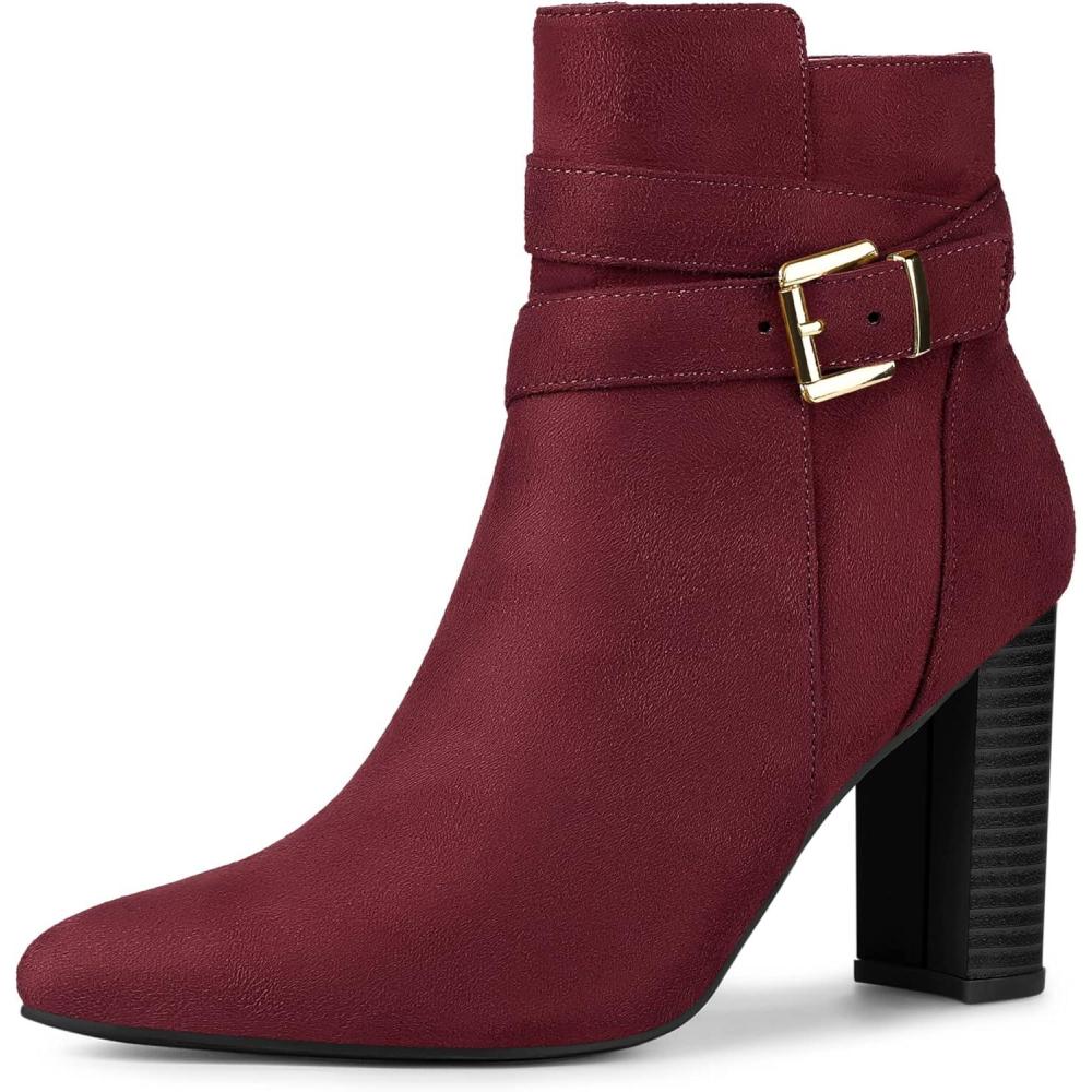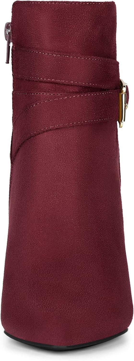 Allegra K Women’s Pointed Toe Buckle Decor Chunky Heel Ankle Boots(Burgundy)