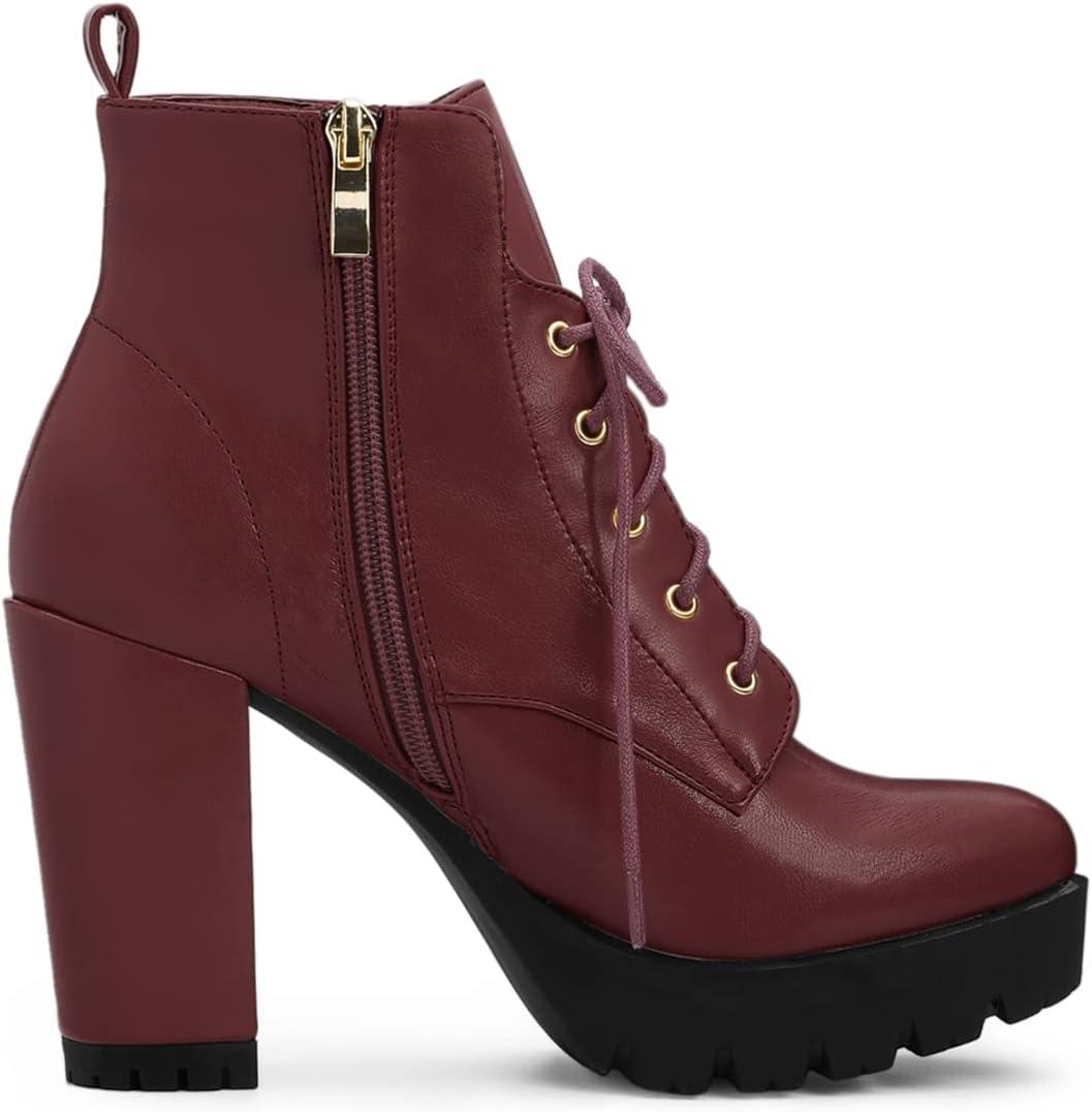 Allegra K Women’s Round Toe Chunky Heel Lace Up Platform Boots(Burgundy)