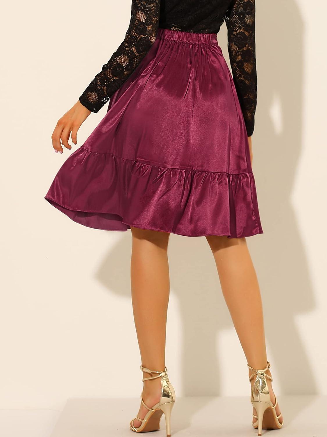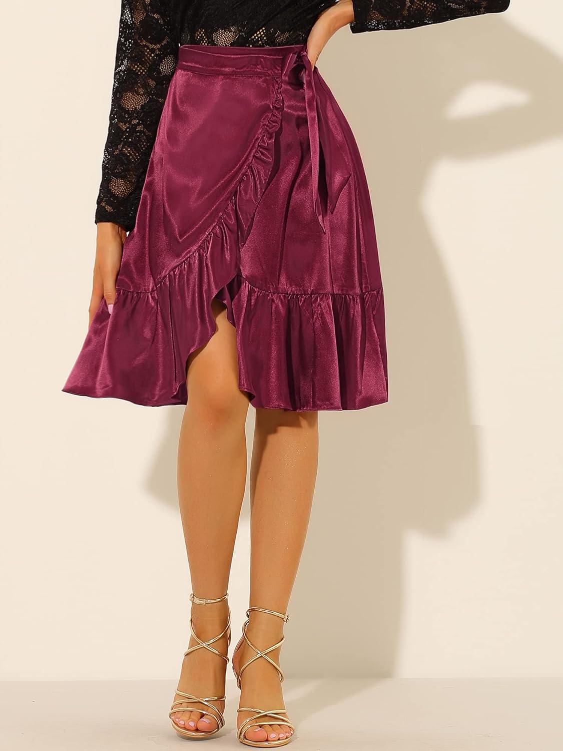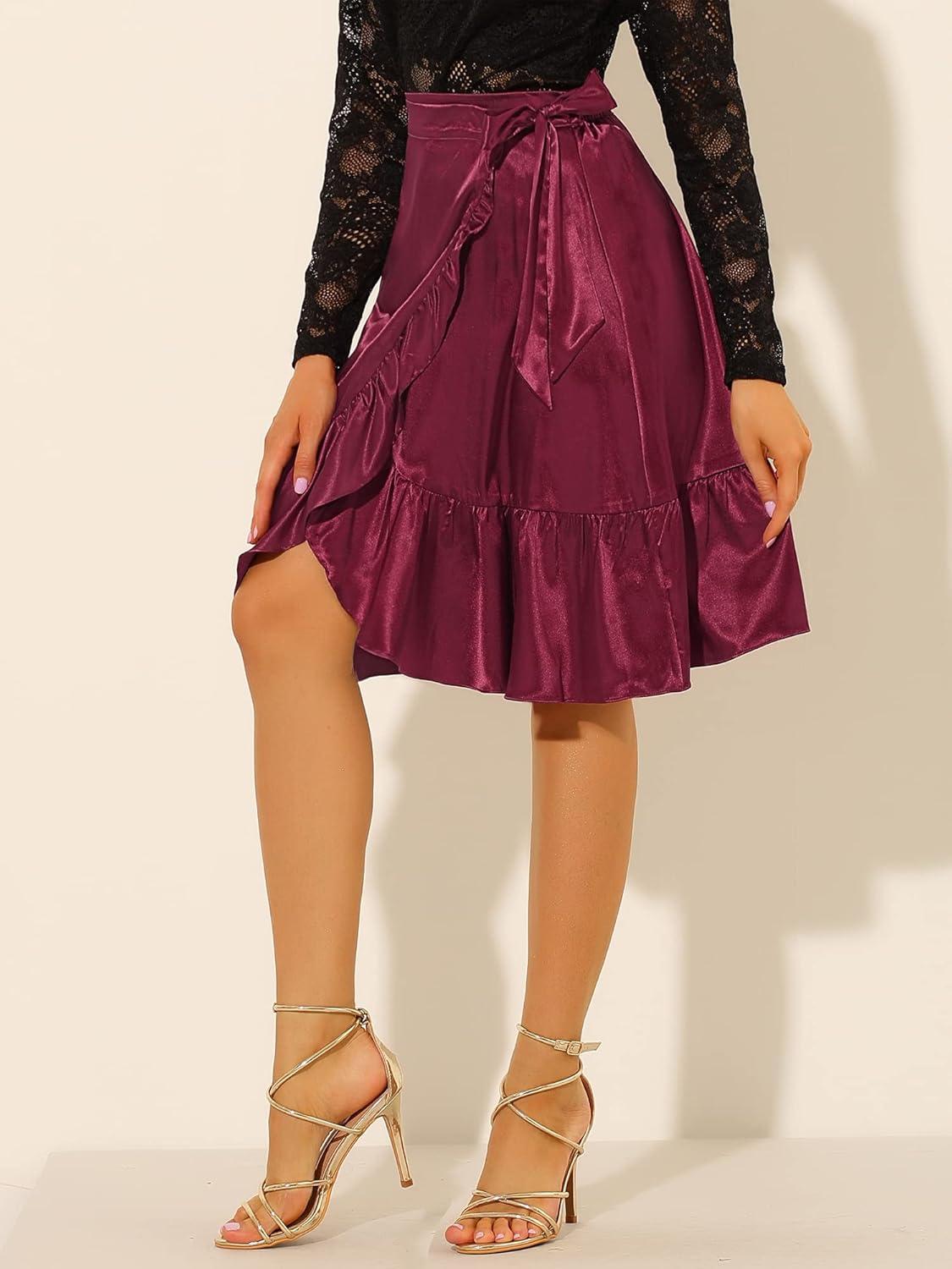 Allegra K Women’s Ruffle Satin High Waist Tie Wrap Asymmetrical Midi Skirt(Burgundy)