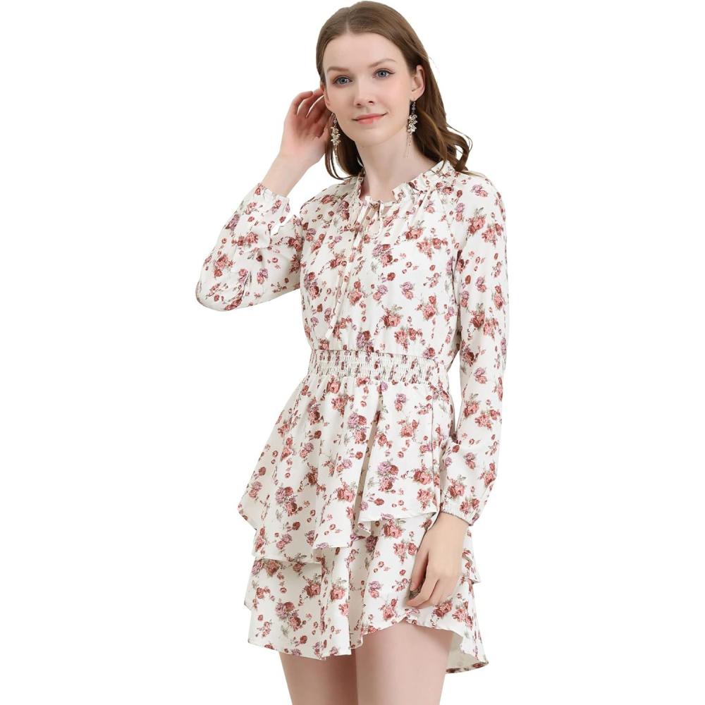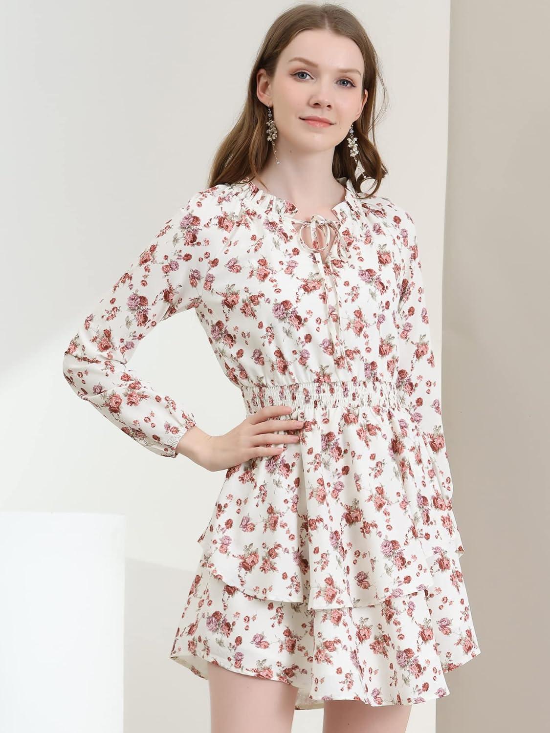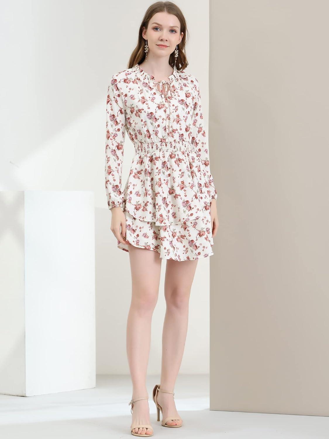 Allegra K Women’s Ruffled Floral Smocked Waist Layered Tiered Chiffon Dress(Beige Floral)