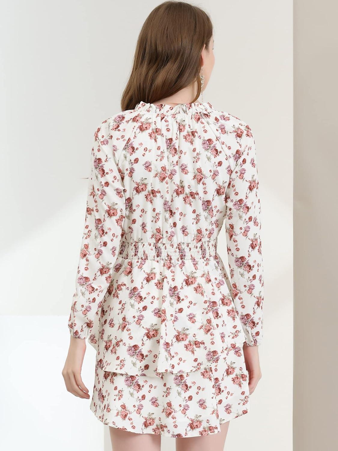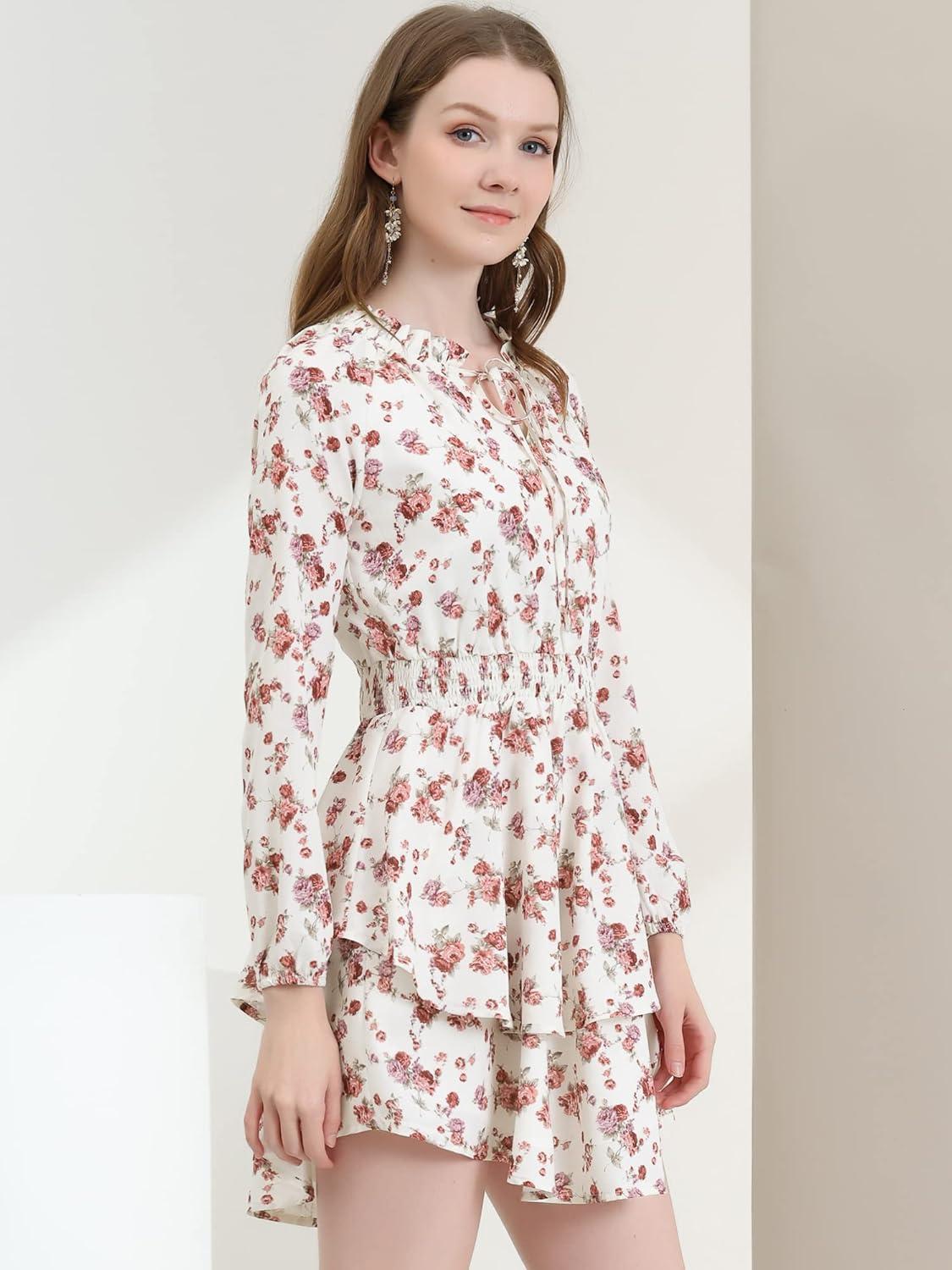 Allegra K Women's Ruffled Floral Smocked Waist Layered Tiered Chiffon Dress